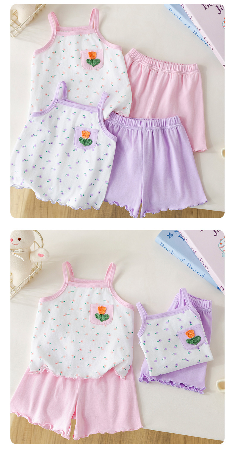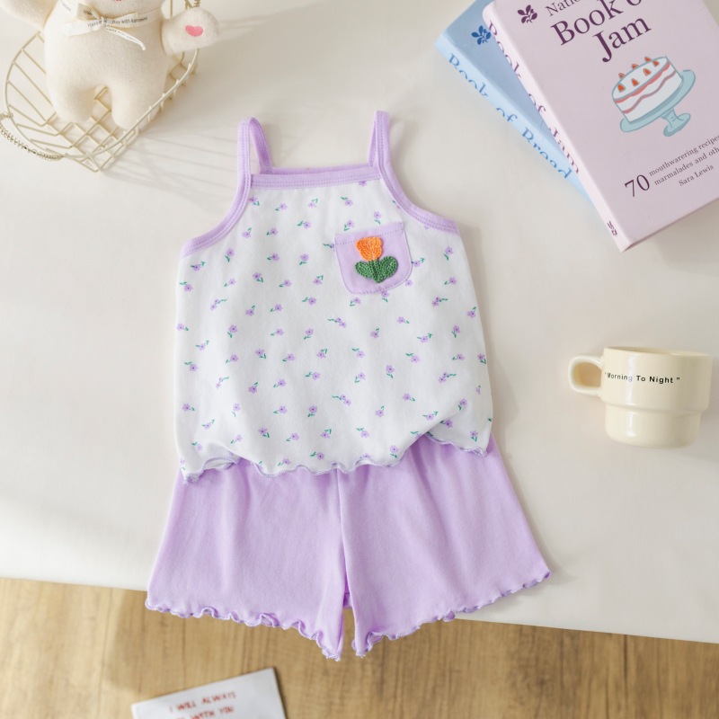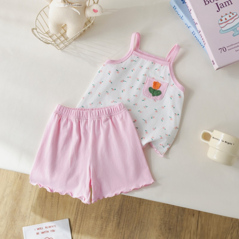 아기 소녀 여름 정장 순수 코튼 꽃 서스펜더 아기 소녀 여름 민소매 에어컨 가정 의류 투피스 여름 세트