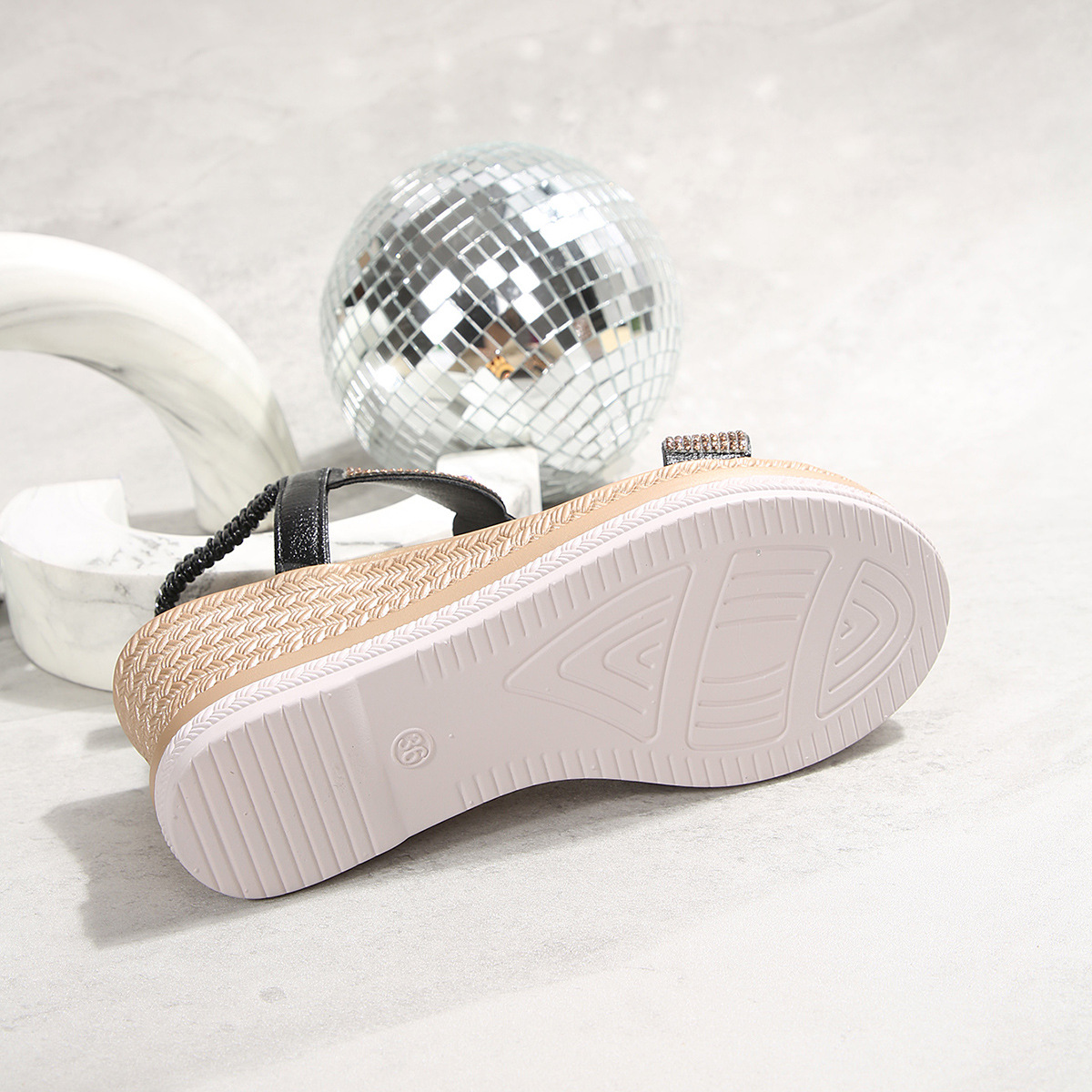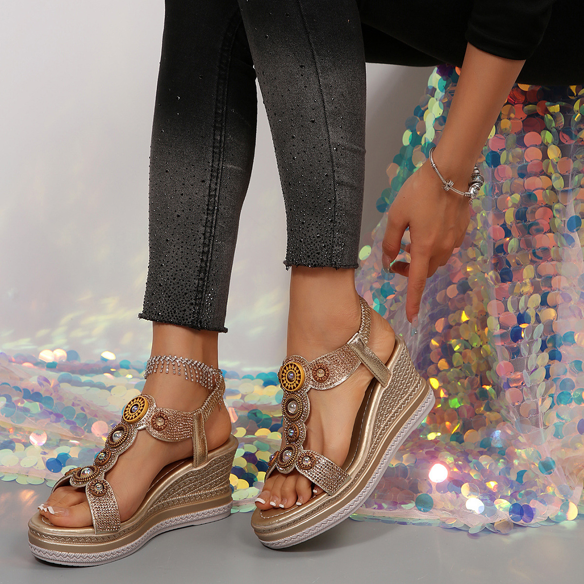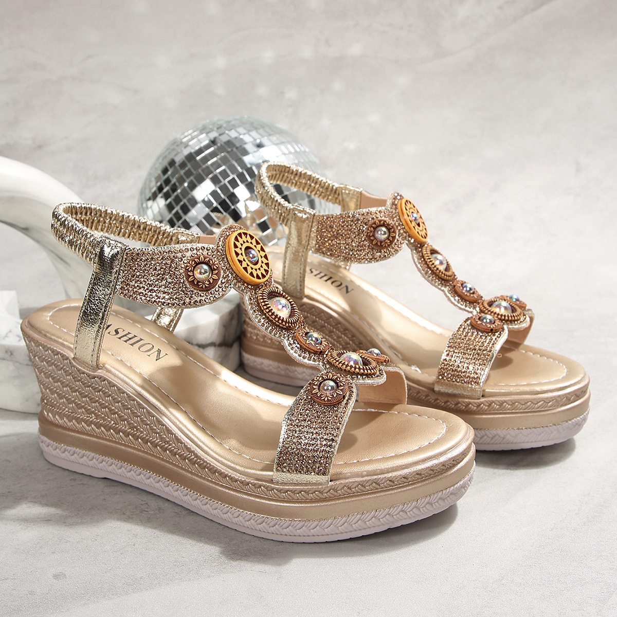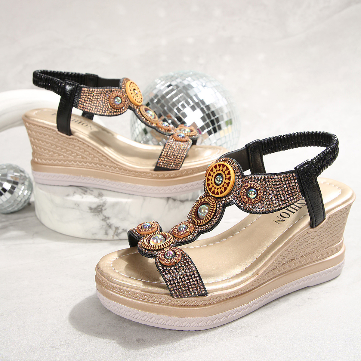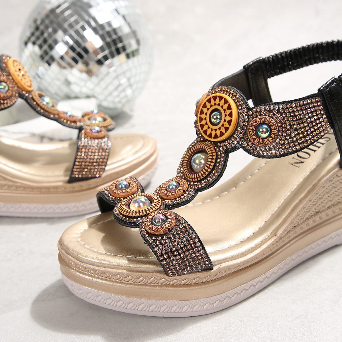 국경 간 대외 무역 2025 여름 라인 석 샌들 탄성 슬립 온 패션 유럽과 미국 스타일의 두꺼운 밑창 여성 대형 샌들