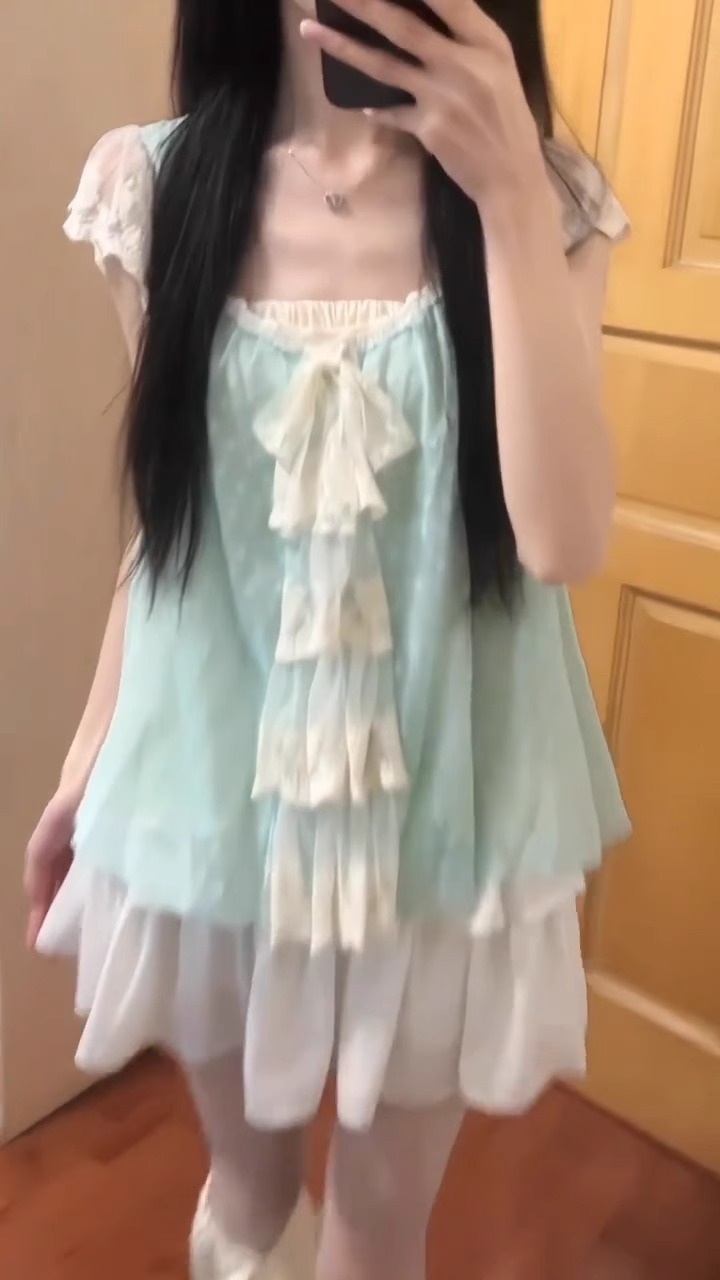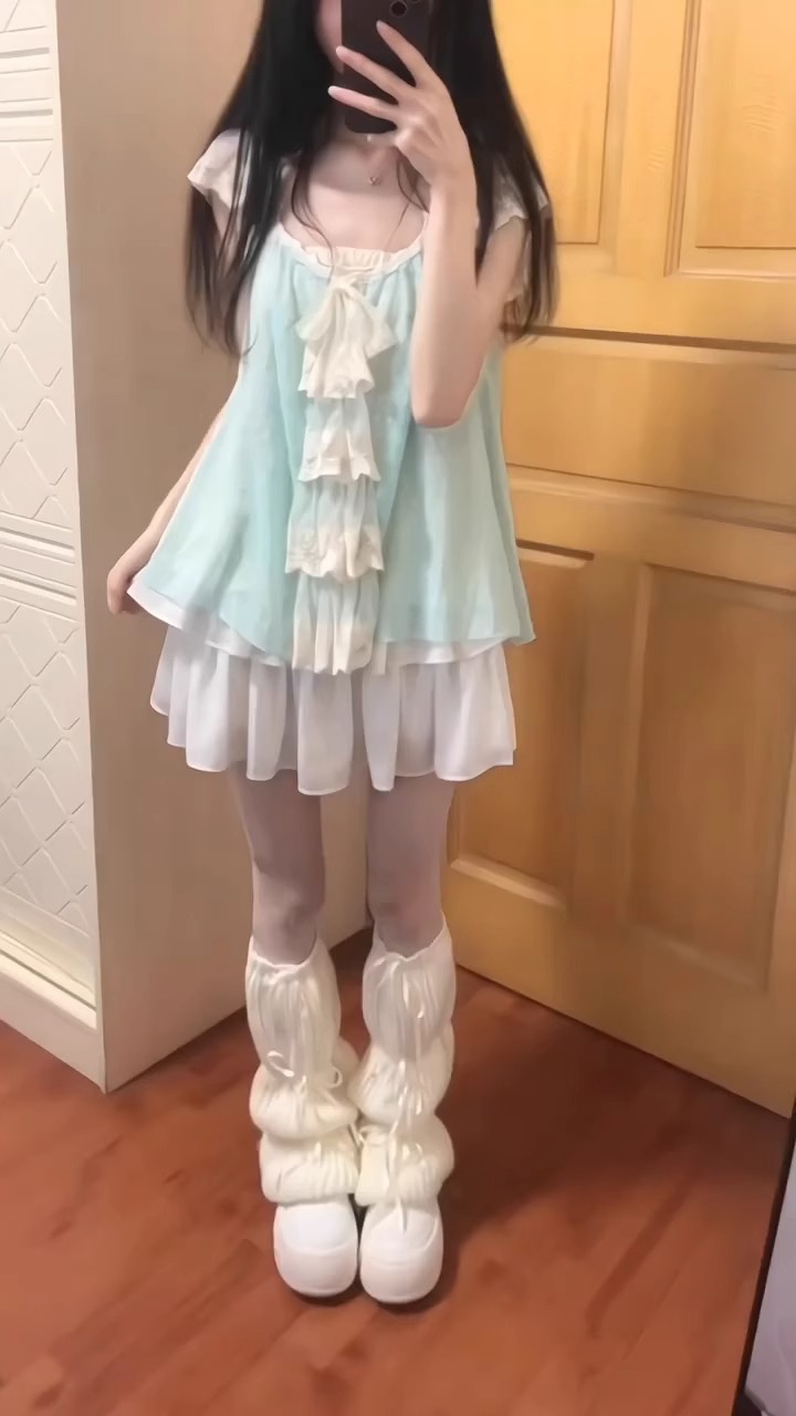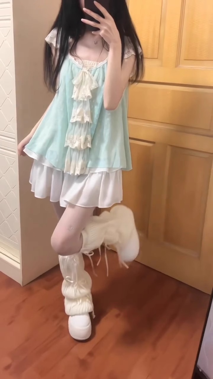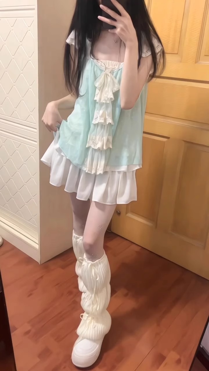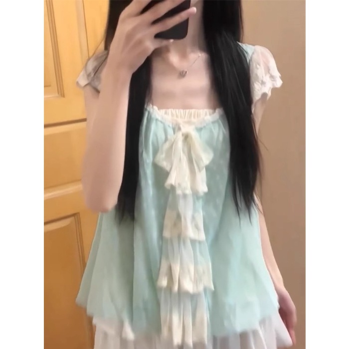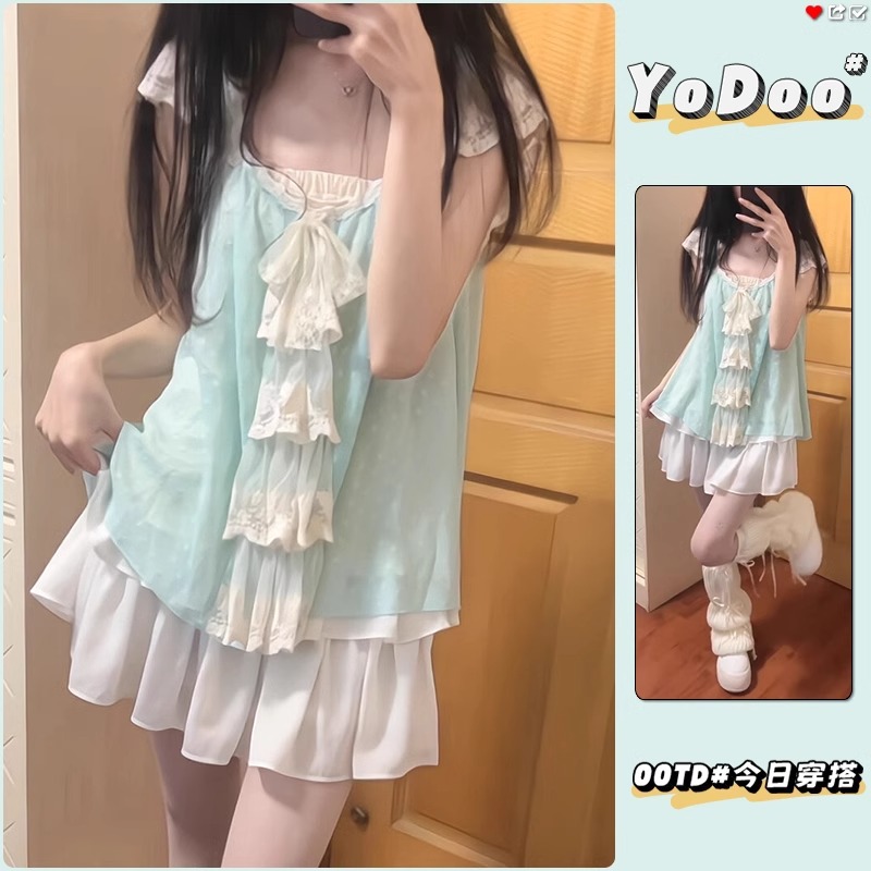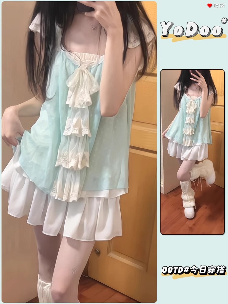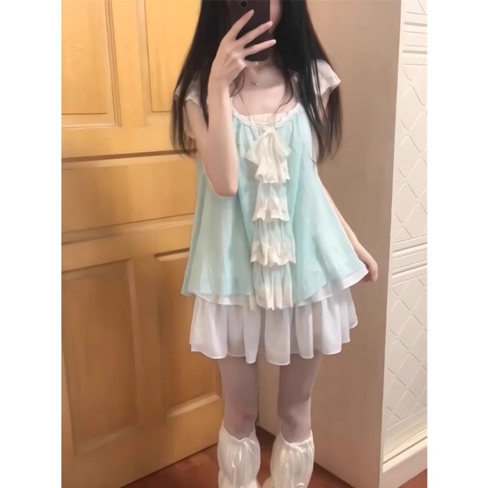 여름 민트 캔디 얇은 봄 나들이 쉬폰 여성 달콤한 작은 플라잉 슬리브 티셔츠 짧은 치마 정장 빈티지 나나 스타일 핫 소녀스토어 가기