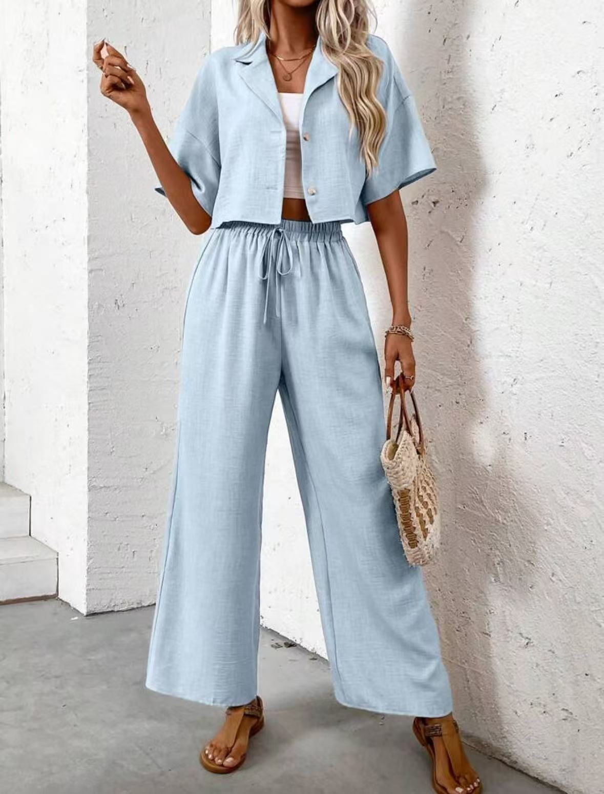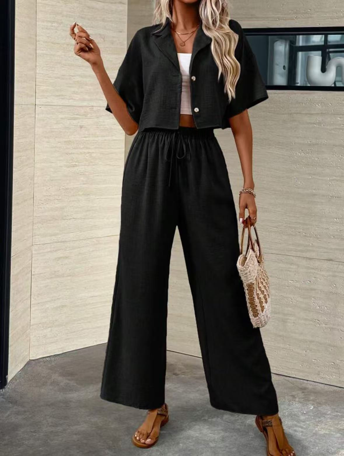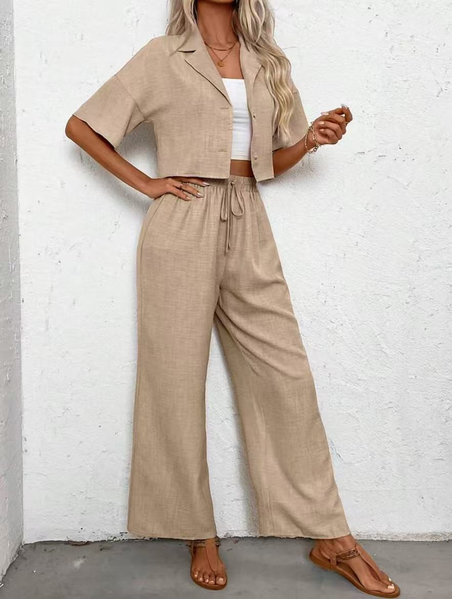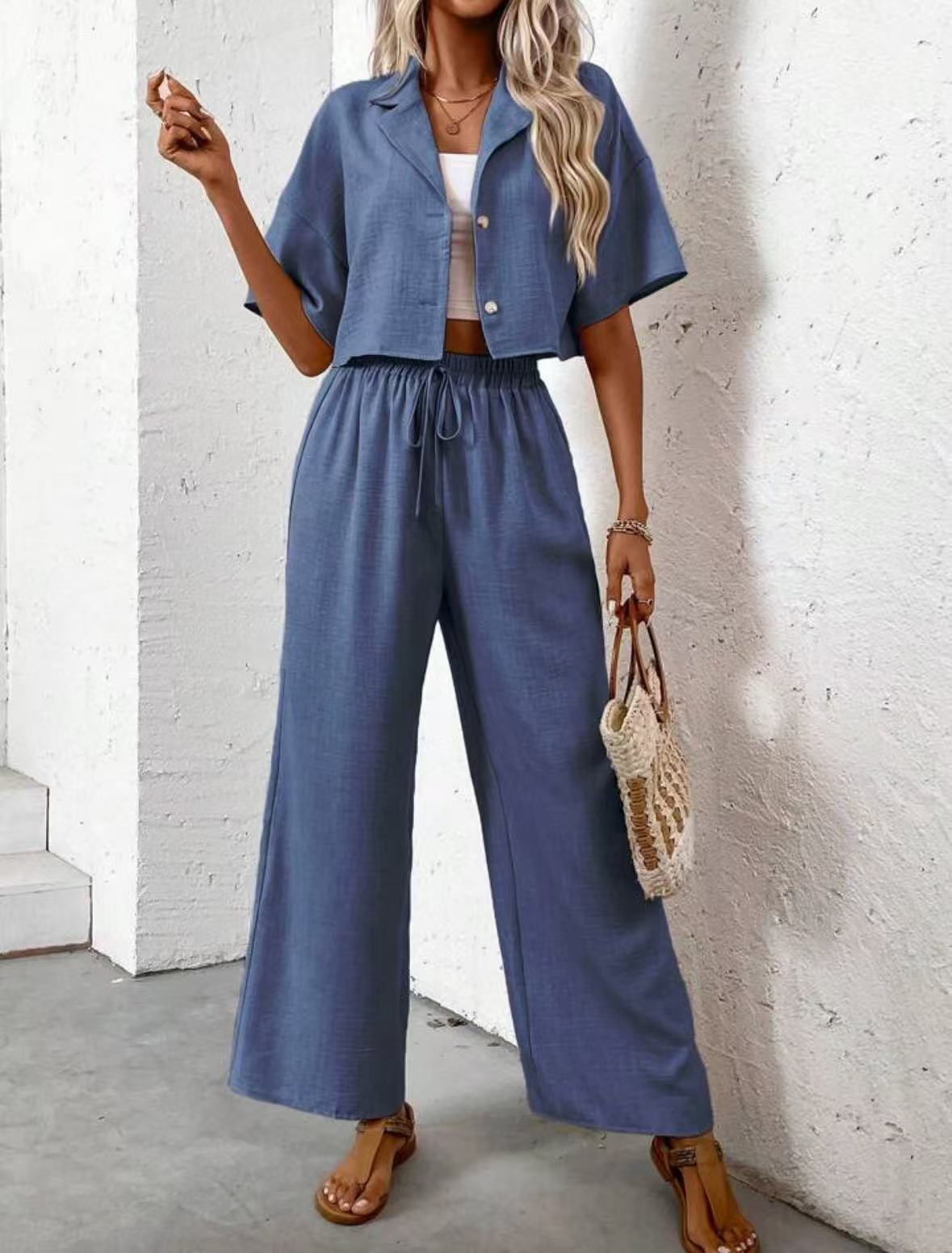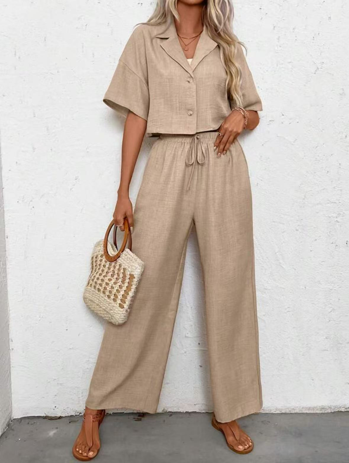 2025년 크로스보더 핫 스타일 솔리드 컬러 우아한 투피스 세트 패셔너블하고 우아한 캐주얼 정장 재킷과 여성용 와이드 팬츠 슈트