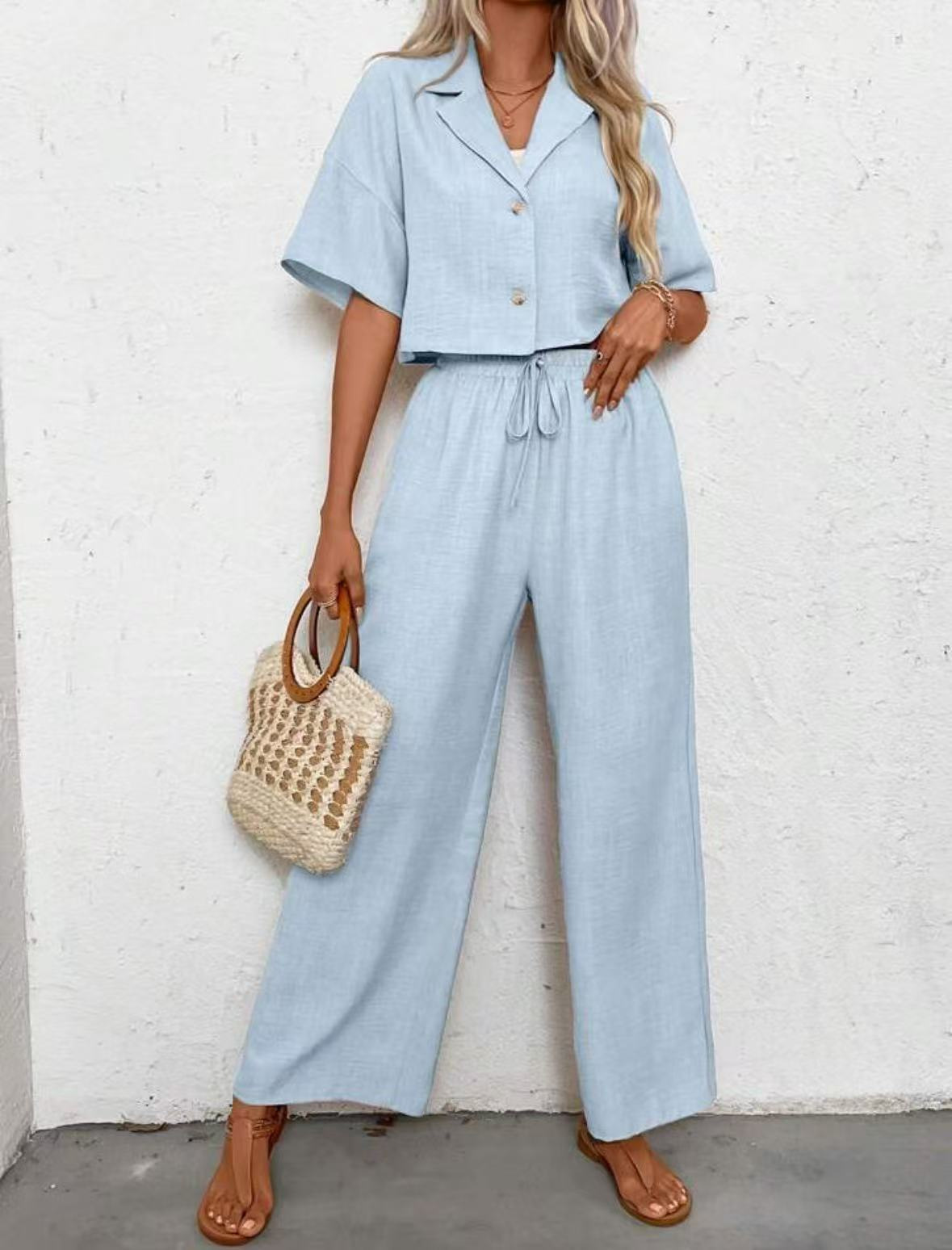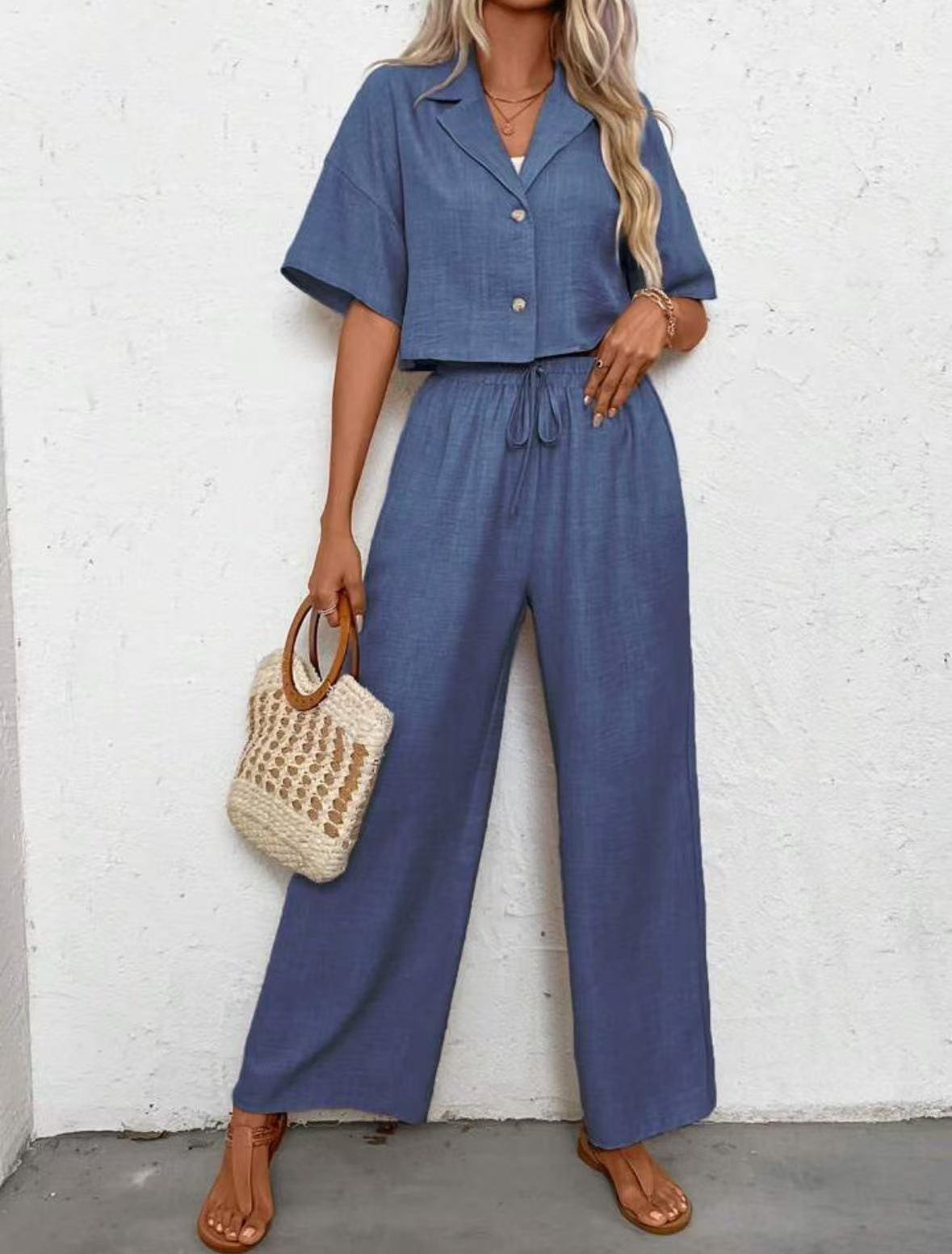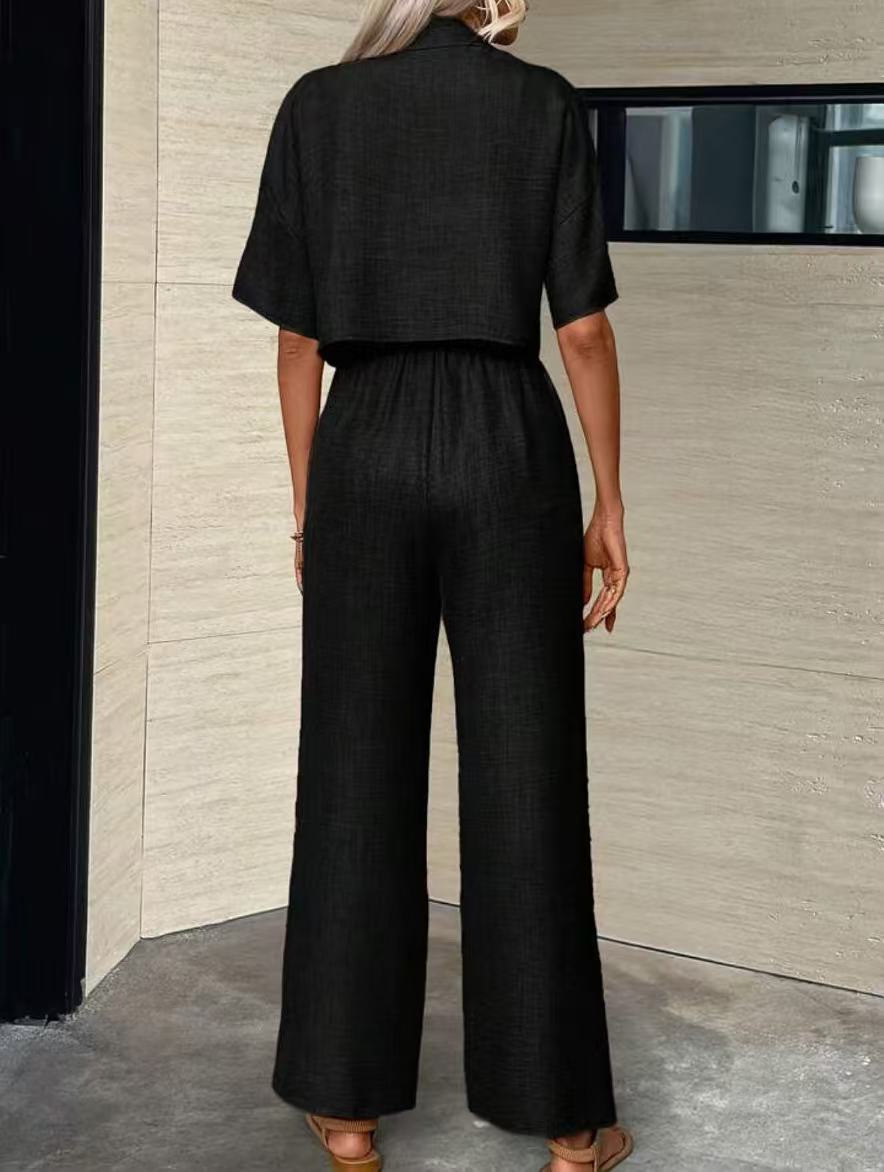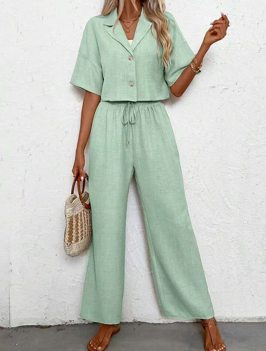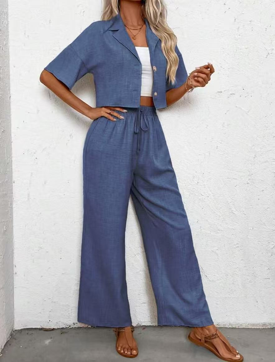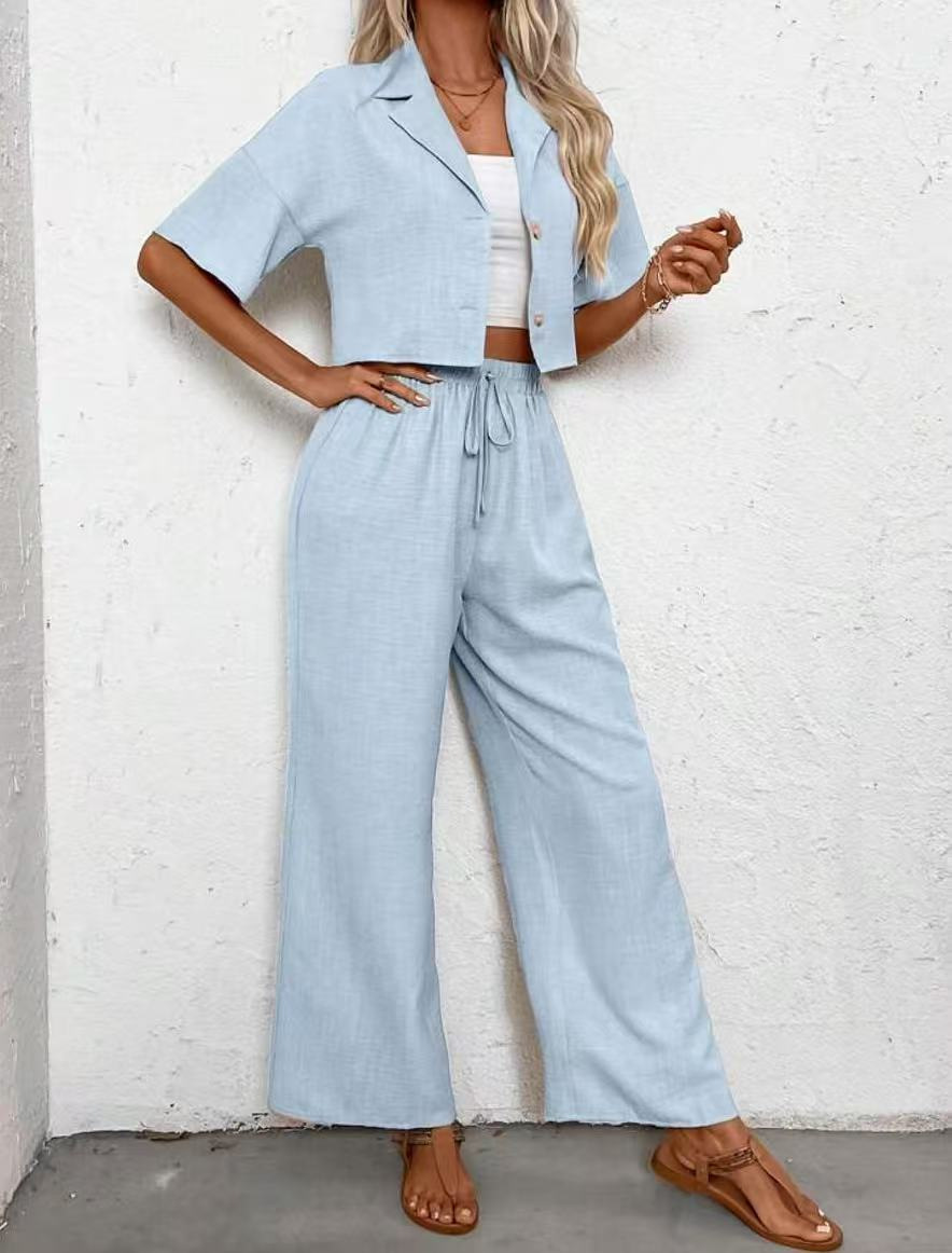 2025년 크로스보더 핫 스타일 솔리드 컬러 우아한 투피스 세트 패셔너블하고 우아한 캐주얼 정장 재킷과 여성용 와이드 팬츠 슈트