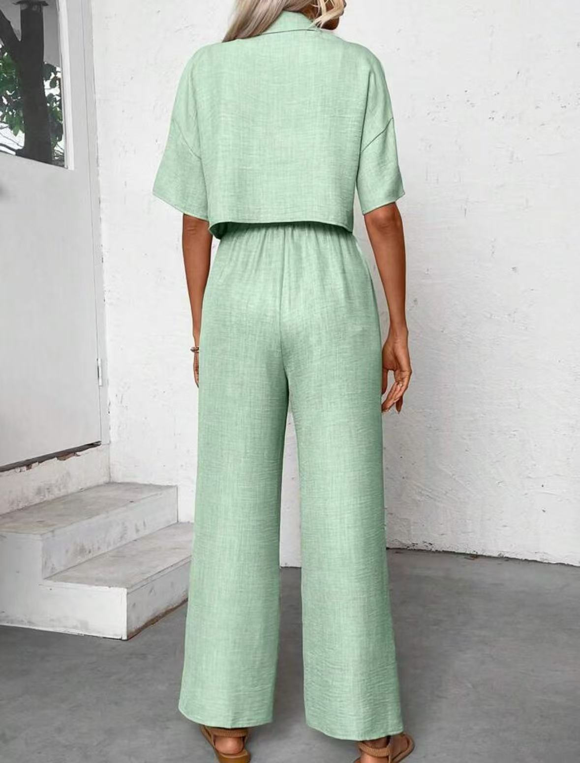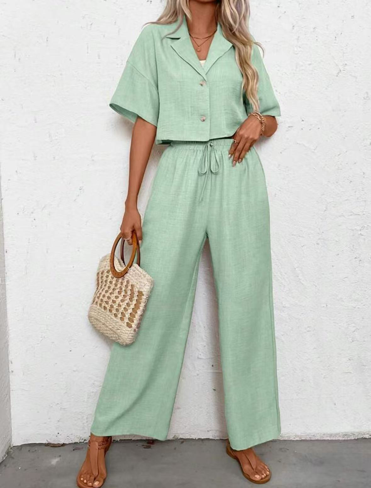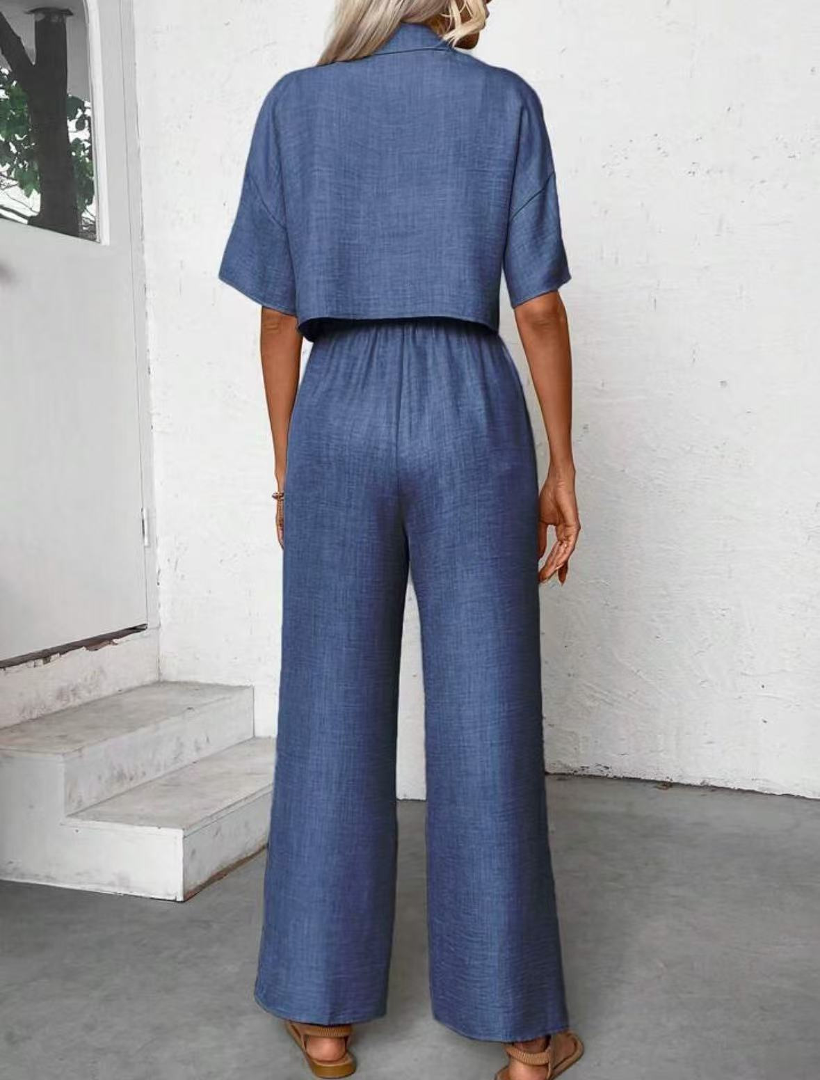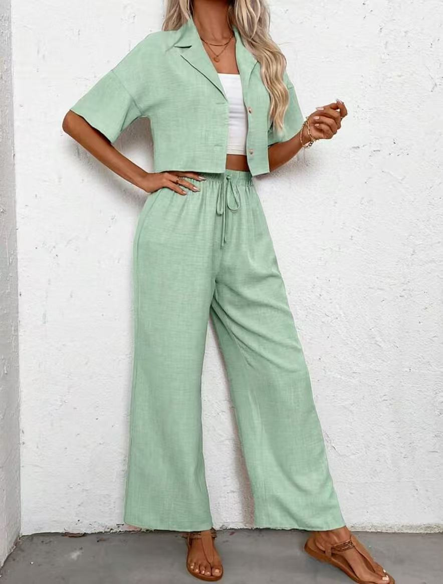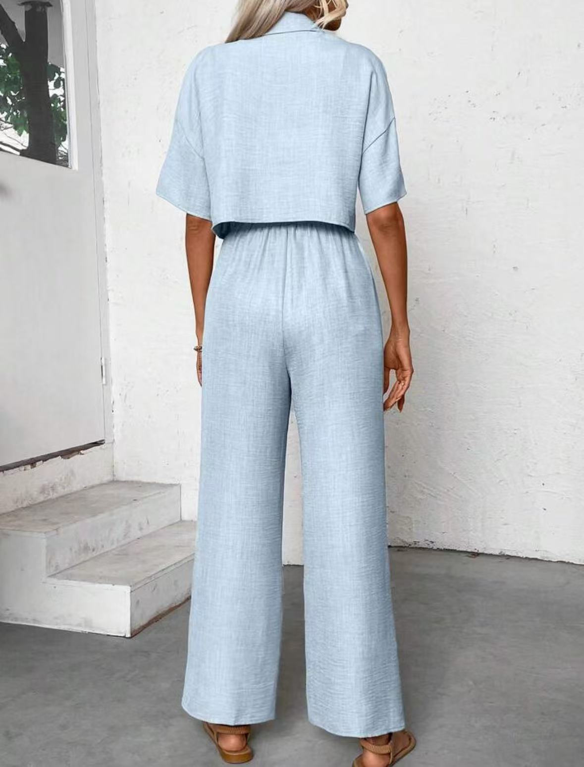 2025년 크로스보더 핫 스타일 솔리드 컬러 우아한 투피스 세트 패셔너블하고 우아한 캐주얼 정장 재킷과 여성용 와이드 팬츠 슈트
