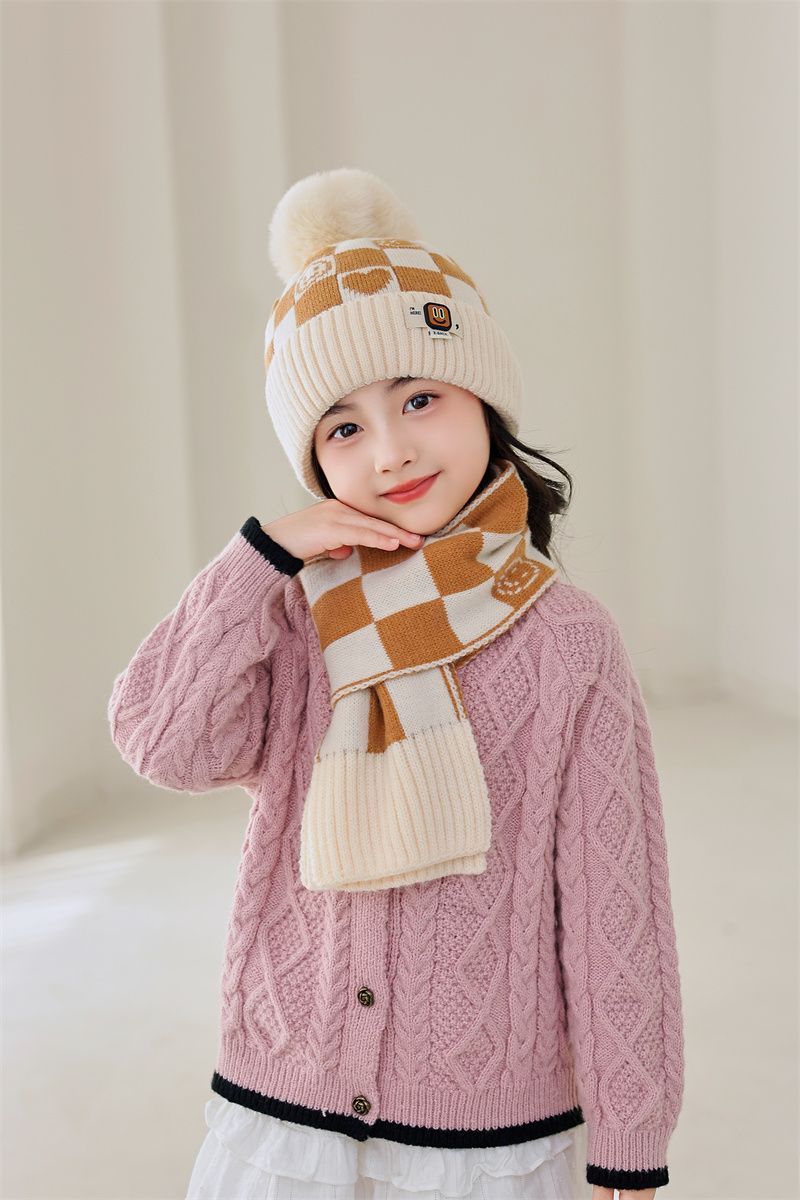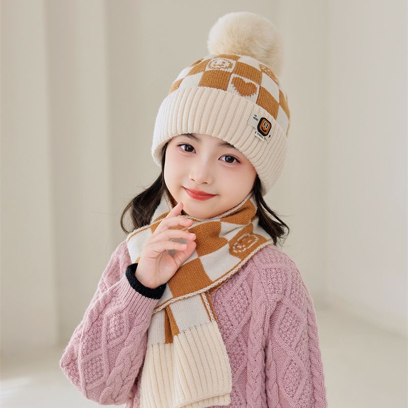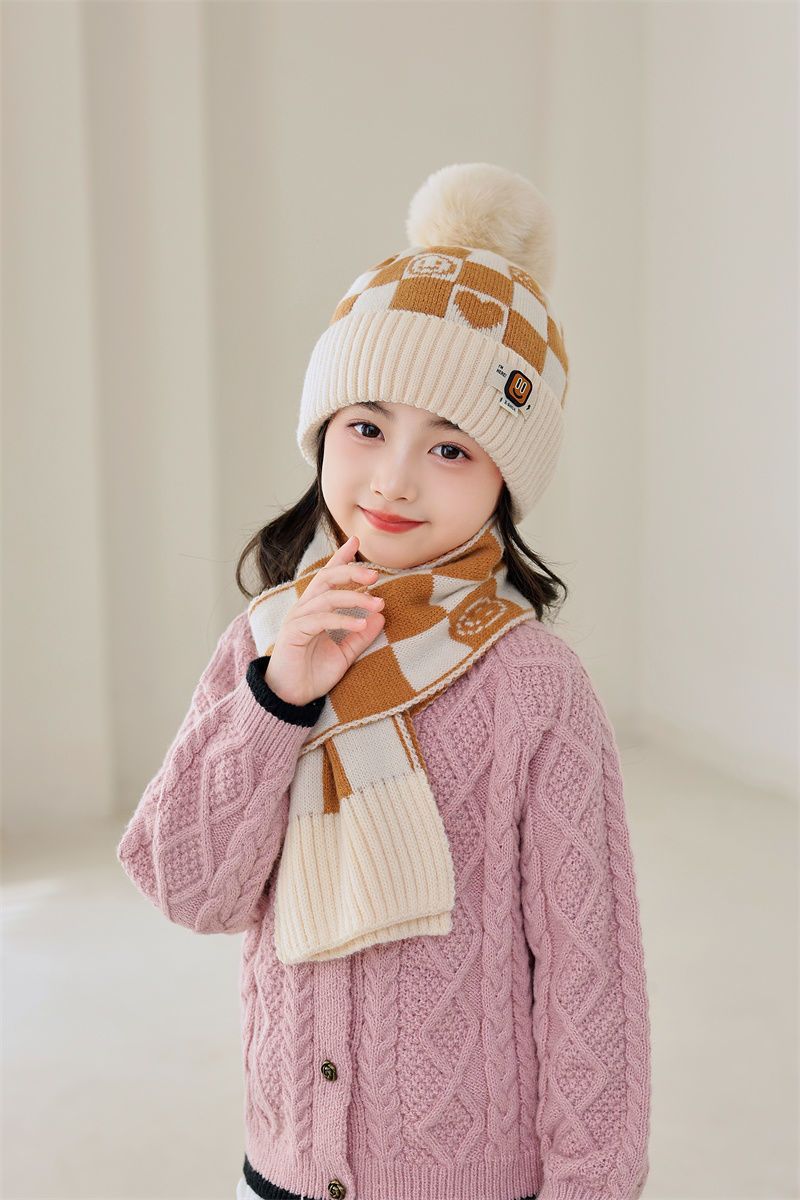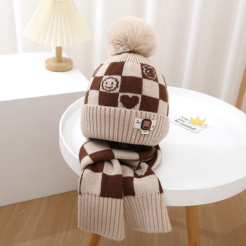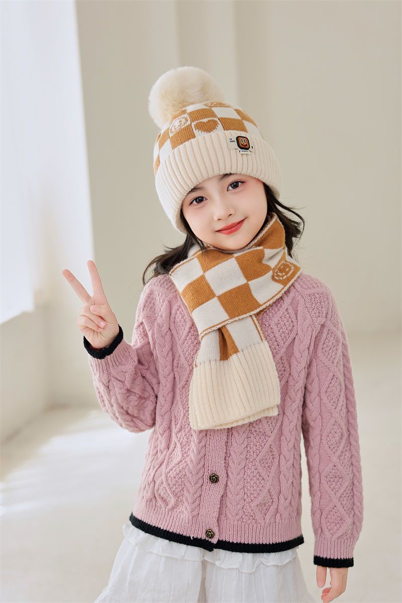 겨울 어린이 모자와 스카프 투피스 세트, 니트 플러스 벨벳, 따뜻하고 편안하며 남성과 여성 모두 같은 스타일, 귀엽고 세련된 스타일