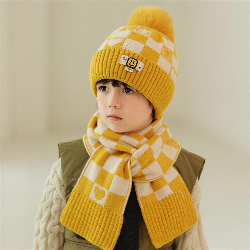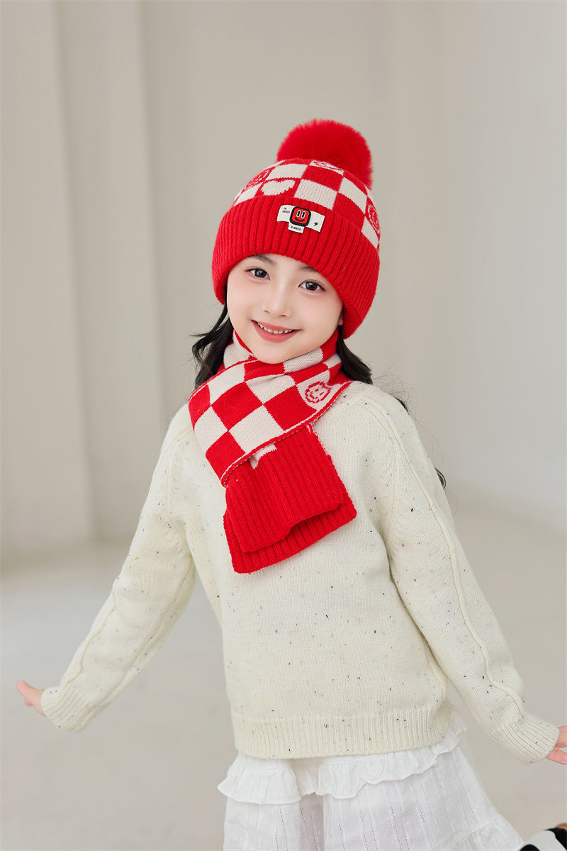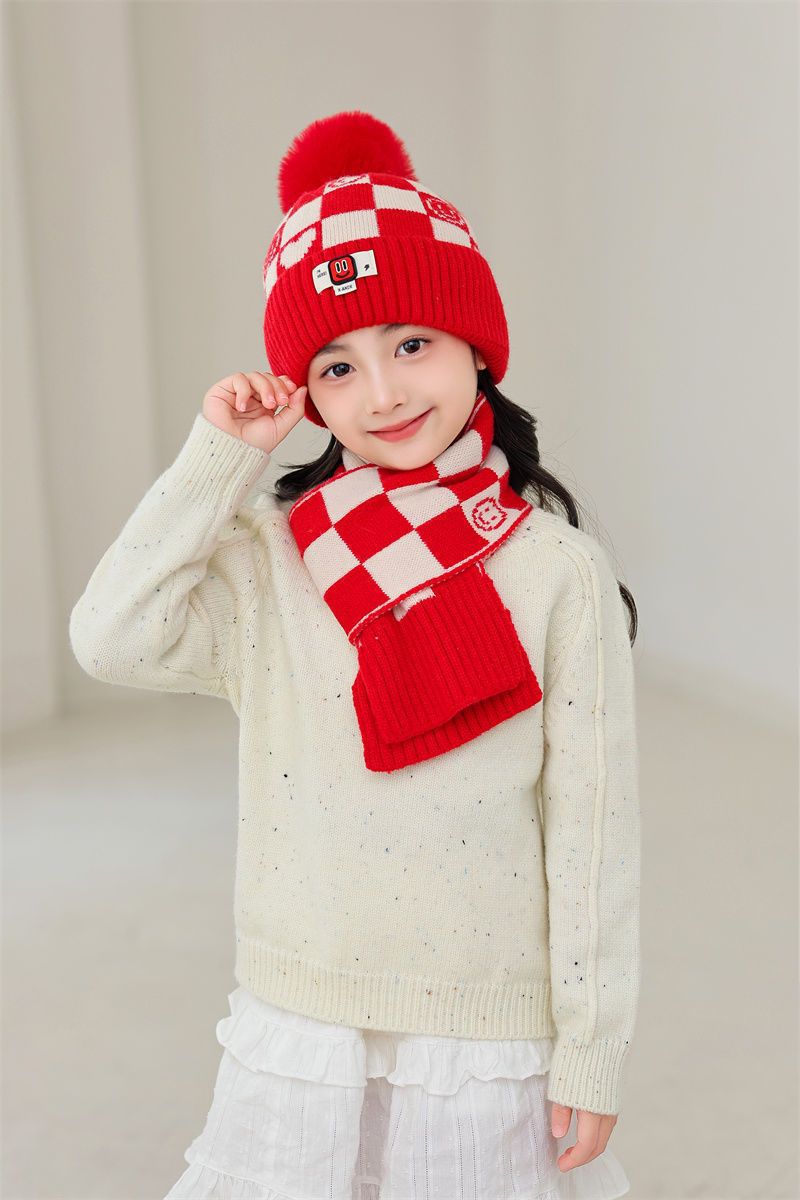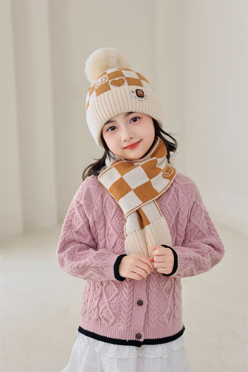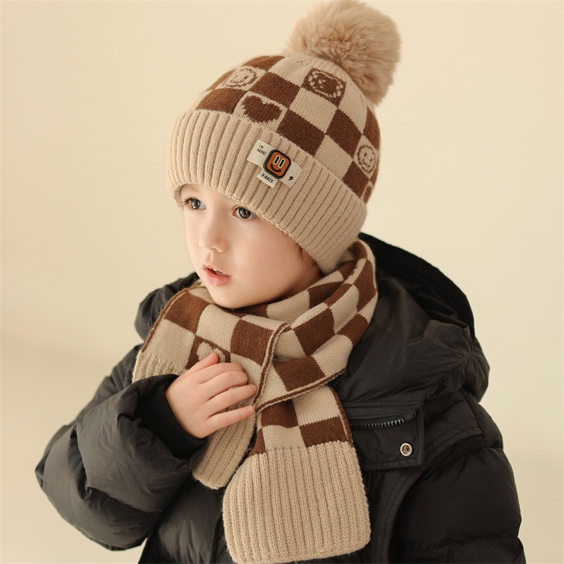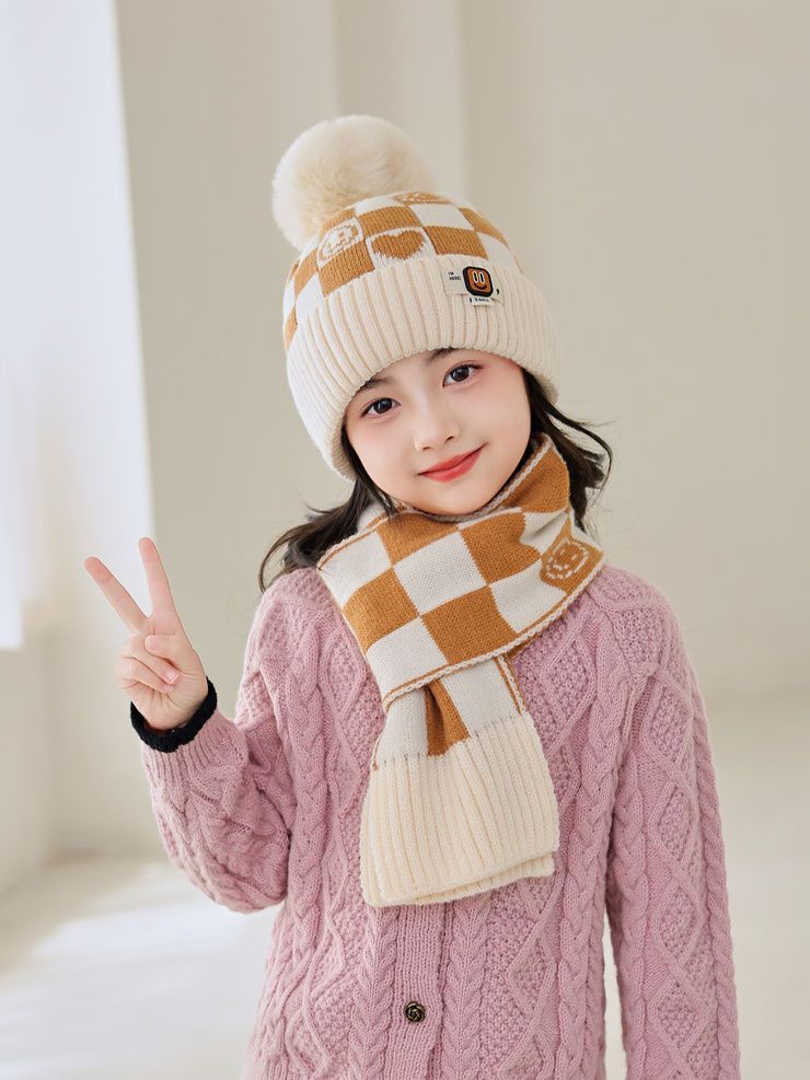 겨울 어린이 모자와 스카프 투피스 세트, 니트 플러스 벨벳, 따뜻하고 편안하며 남성과 여성 모두 같은 스타일, 귀엽고 세련된 스타일