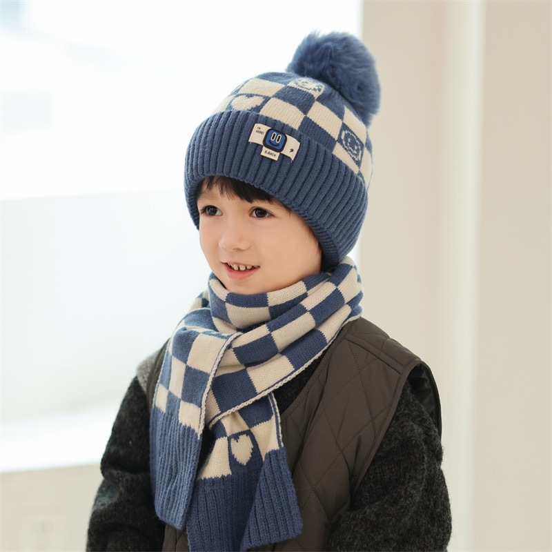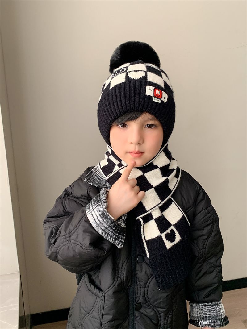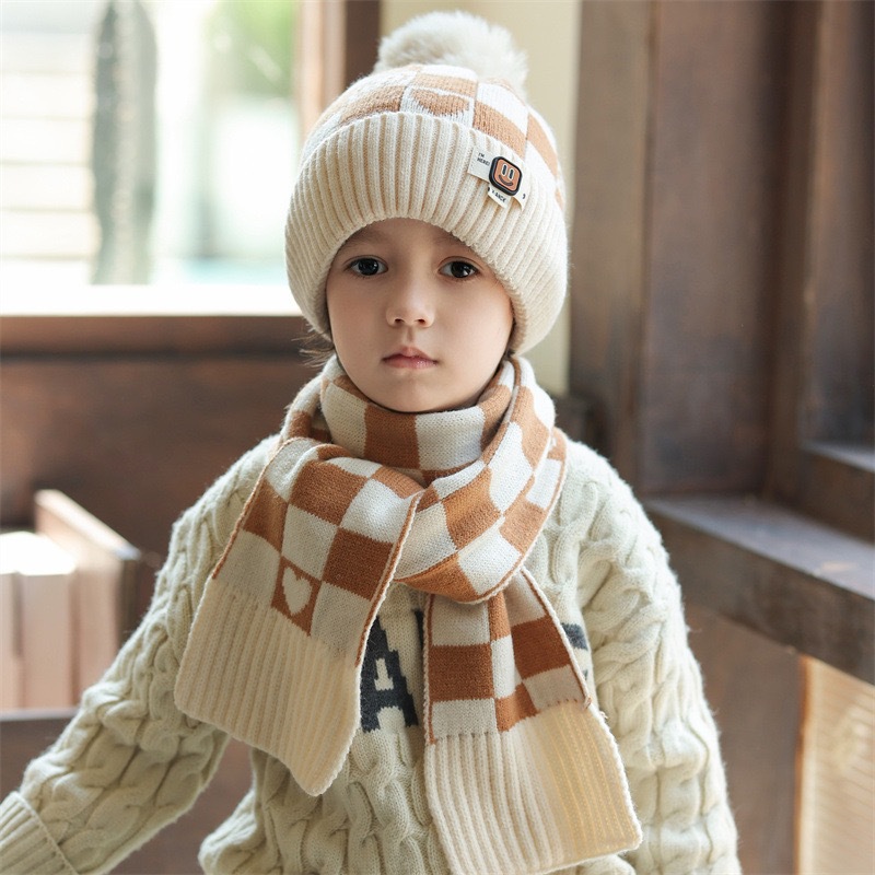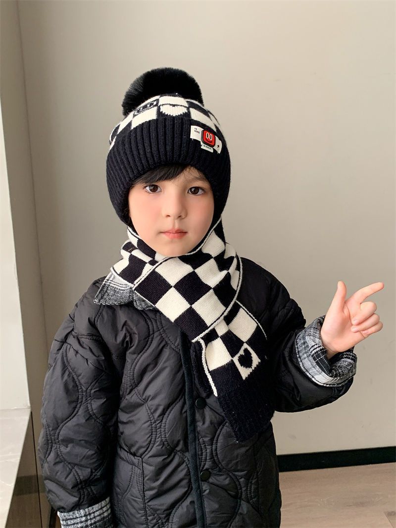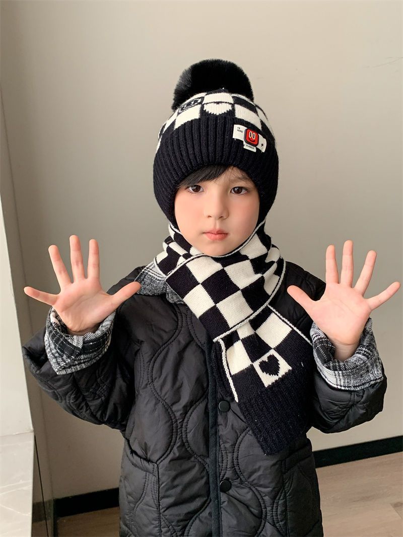 겨울 어린이 모자와 스카프 투피스 세트, 니트 플러스 벨벳, 따뜻하고 편안하며 남성과 여성 모두 같은 스타일, 귀엽고 세련된 스타일스토어 가기