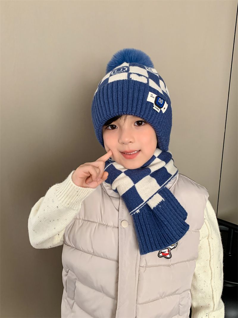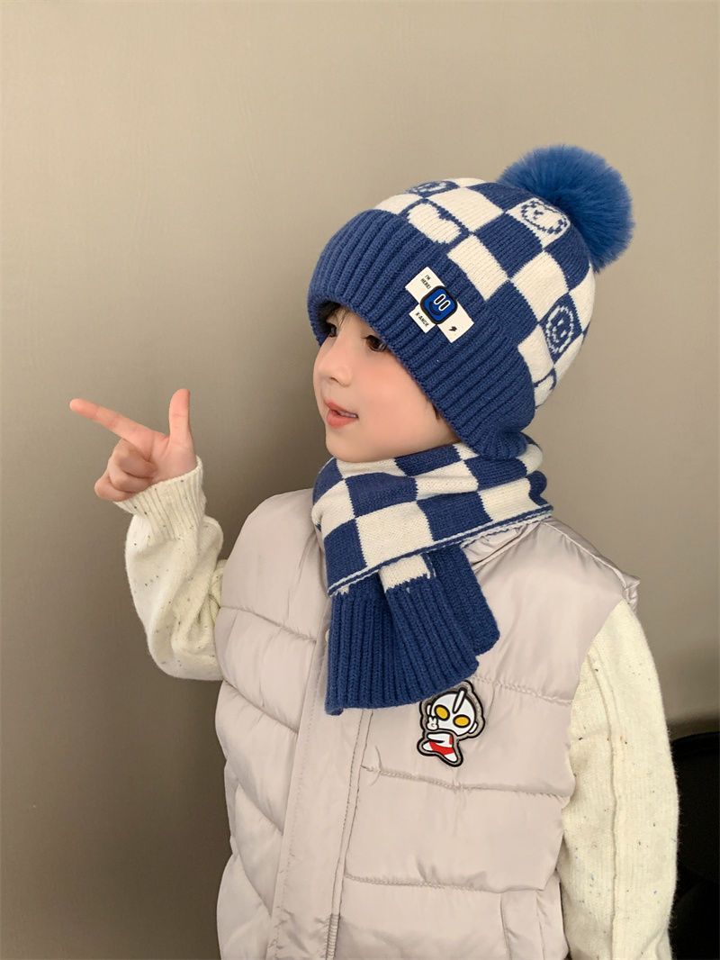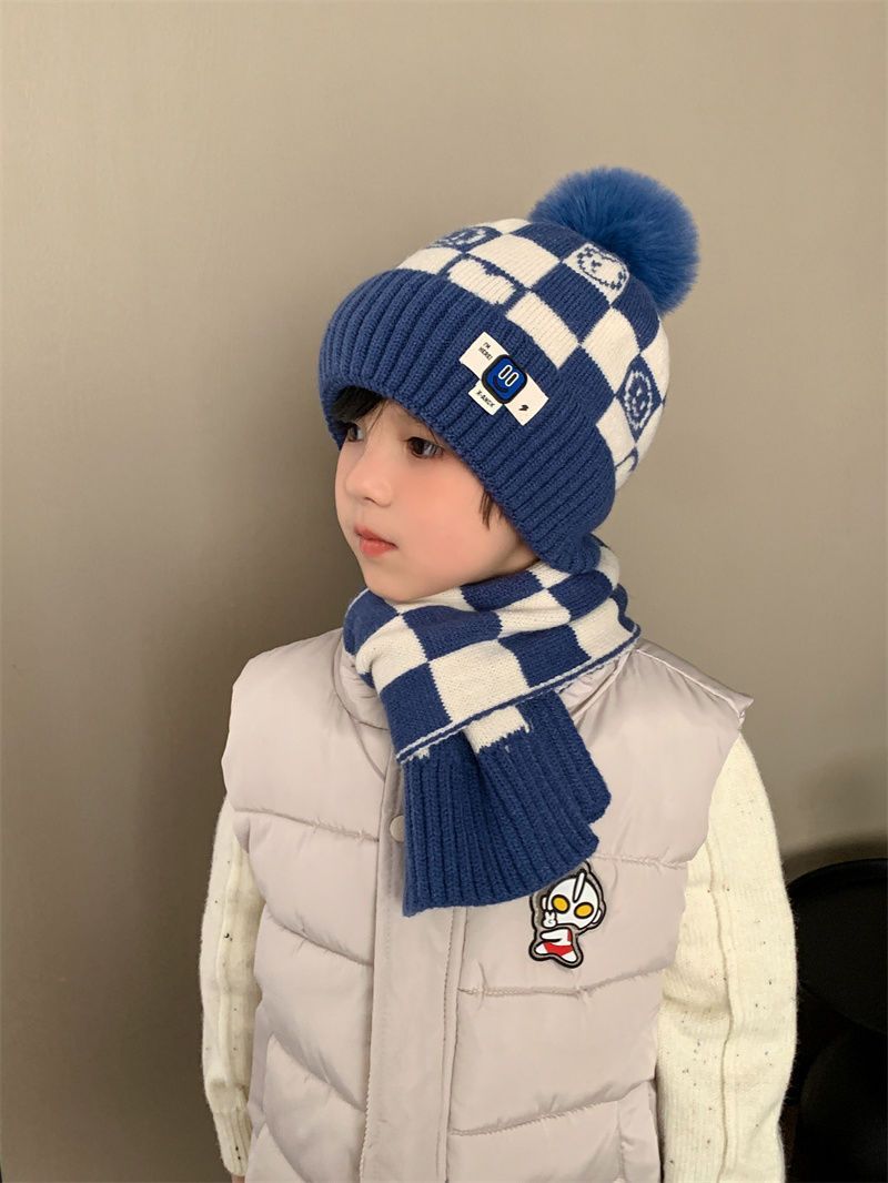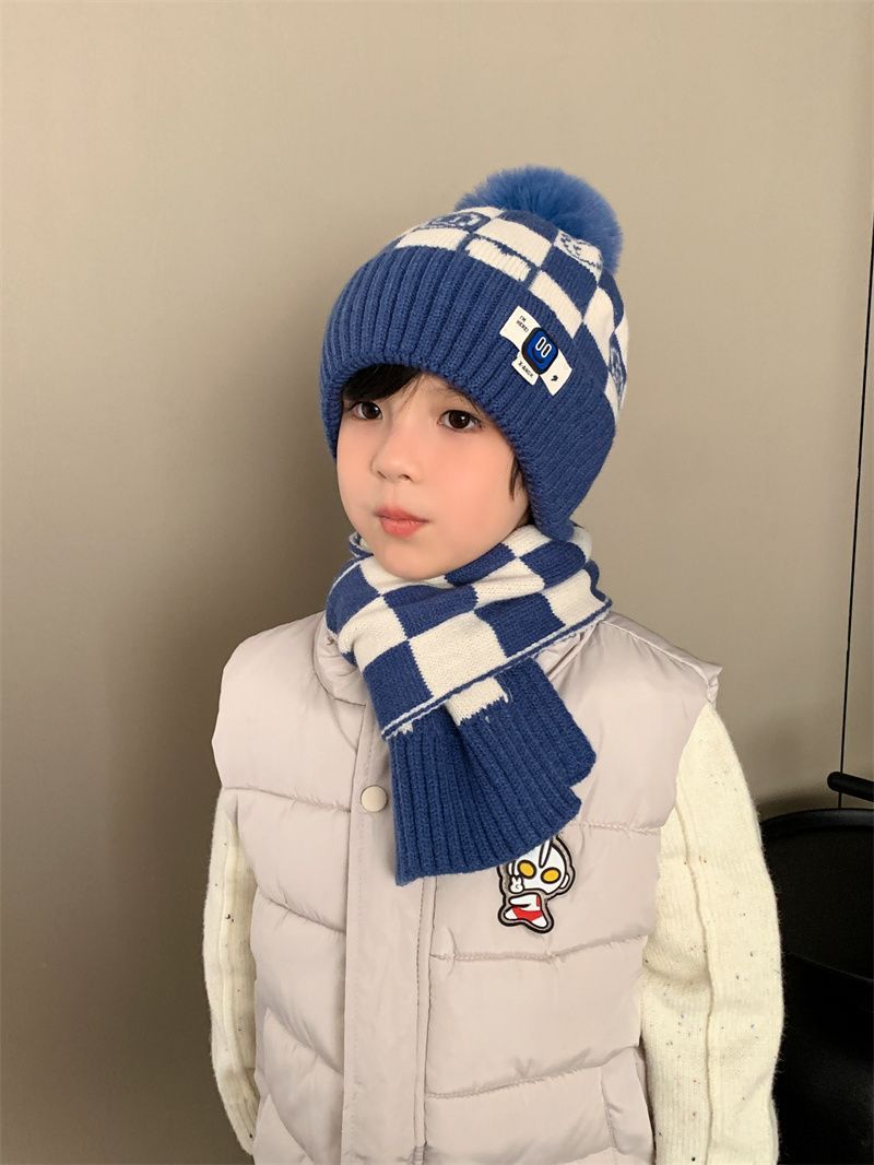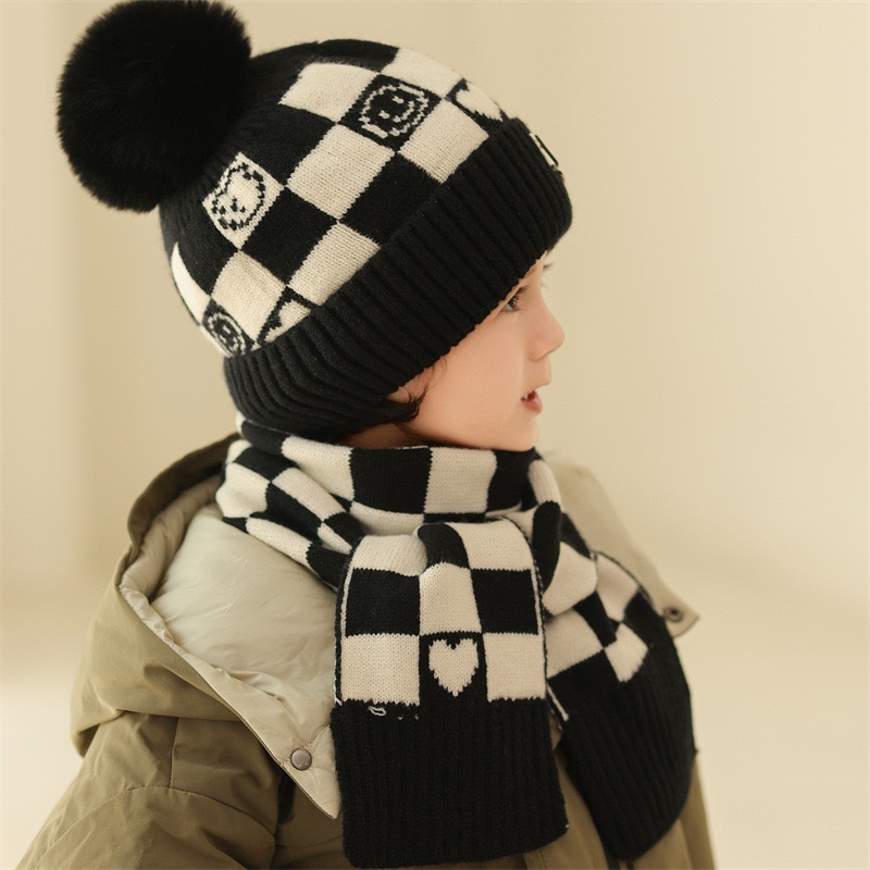 겨울 어린이 모자와 스카프 투피스 세트, 니트 플러스 벨벳, 따뜻하고 편안하며 남성과 여성 모두 같은 스타일, 귀엽고 세련된 스타일스토어 가기