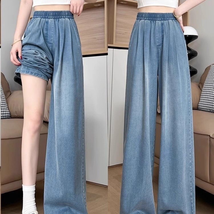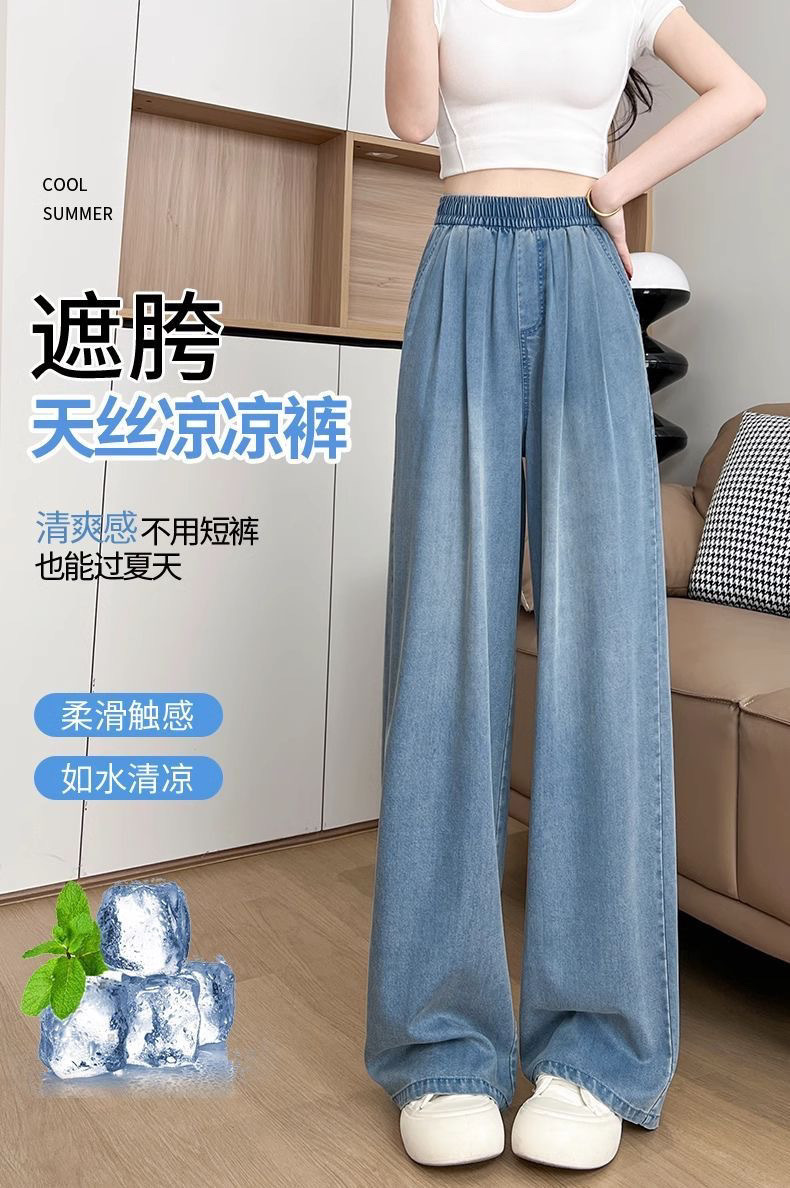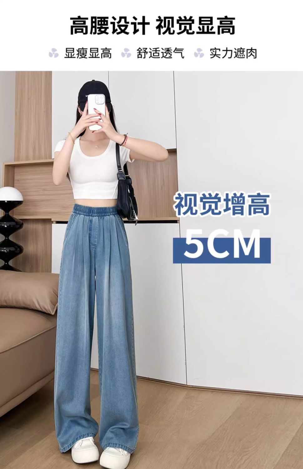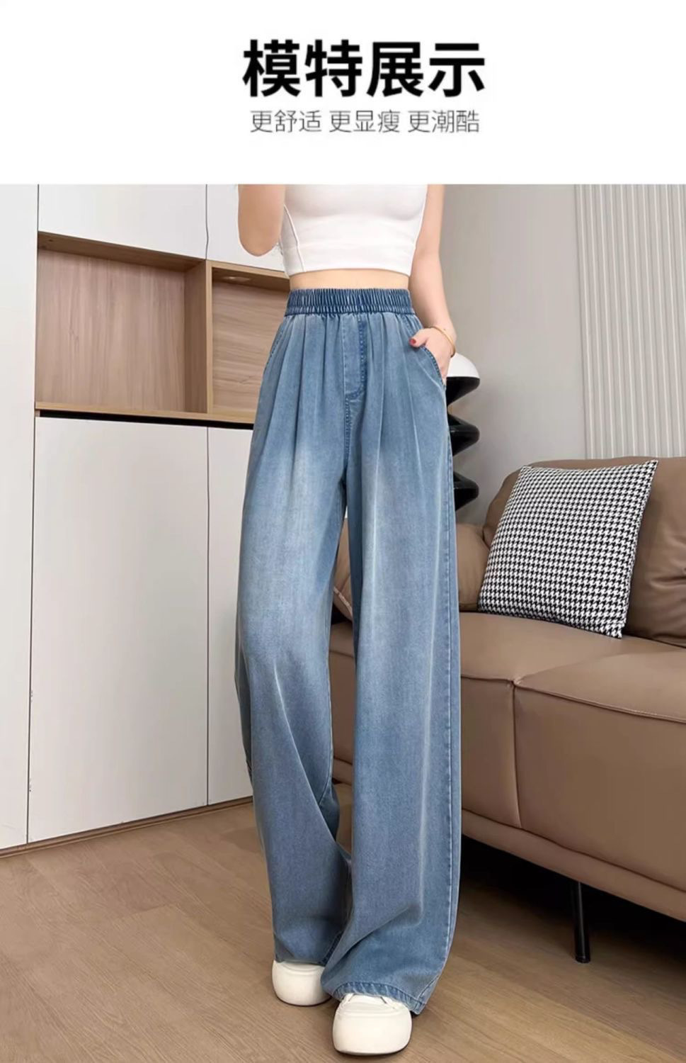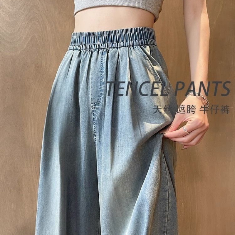 여성용 텐셀 청바지 여름 얇은 하이 웨이스트 와이드 레그 루즈 스몰 네로우 버전 아이스 실크 스트레이트 팬츠스토어 가기