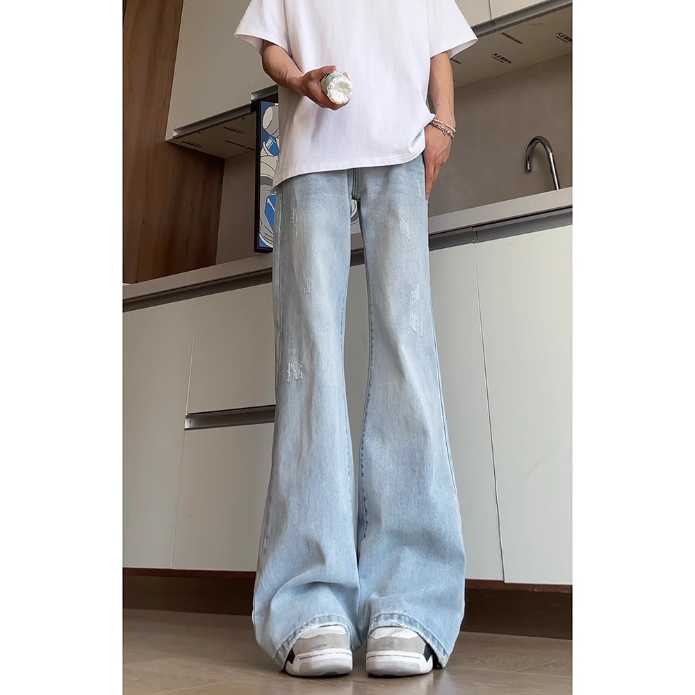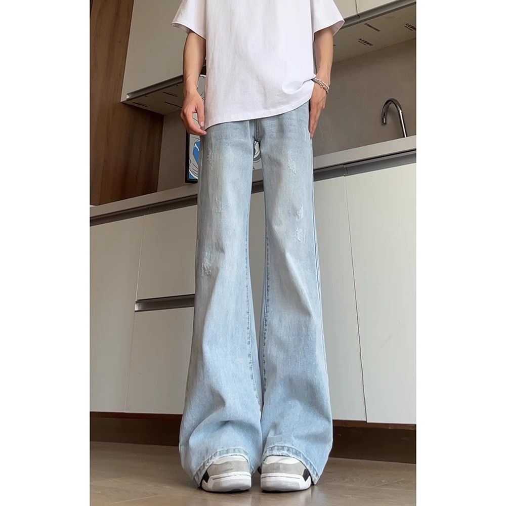 남성용 찢어진 청바지 여름 얇은 와이드 레그 스트레이트 아메리칸 바이브 팬츠 키 큰 사람들을 위한 확장 버전 세이버 부츠컷 팬츠