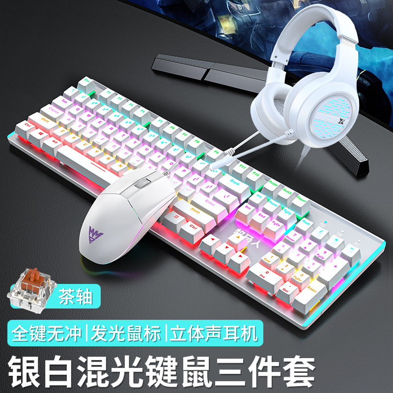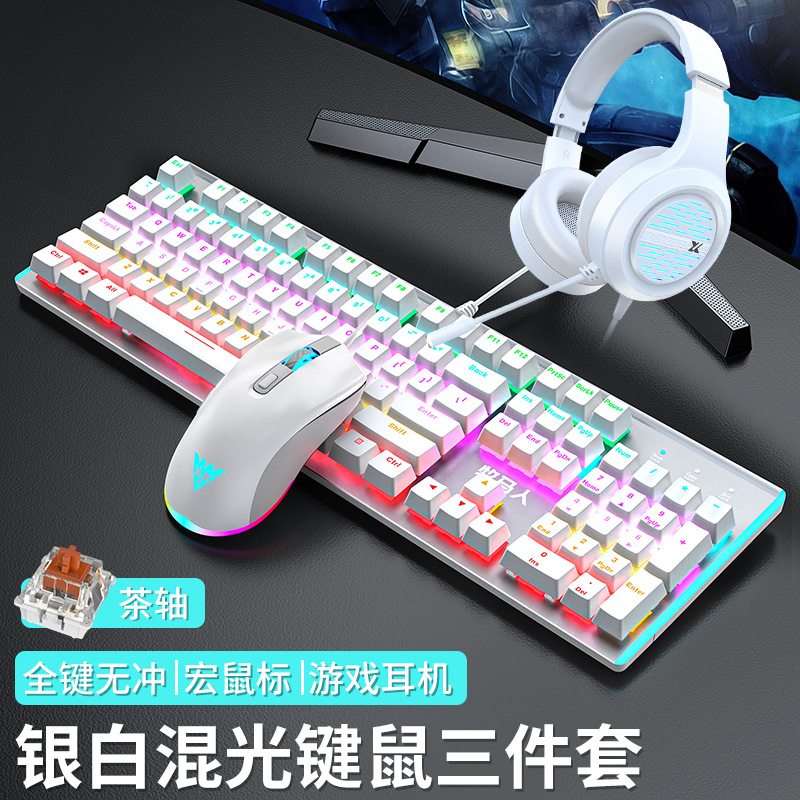 • E-스포츠 트루 메카니컬 샤프트 - 실버 화이트 혼합 조명 [3종 세트 - 브라운 샤프트] + M1 E-스포츠 매크로 마우스 + 게이밍 헤드셋 - 없음 - 104키 - 표준 구성