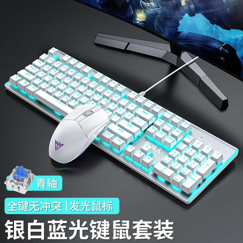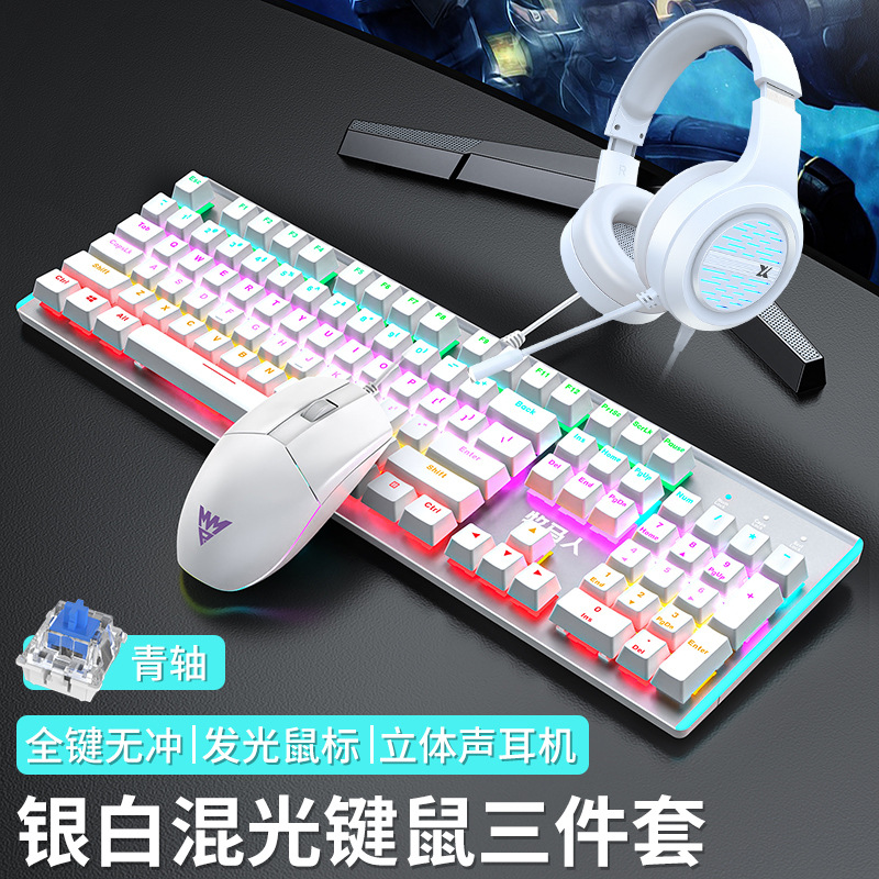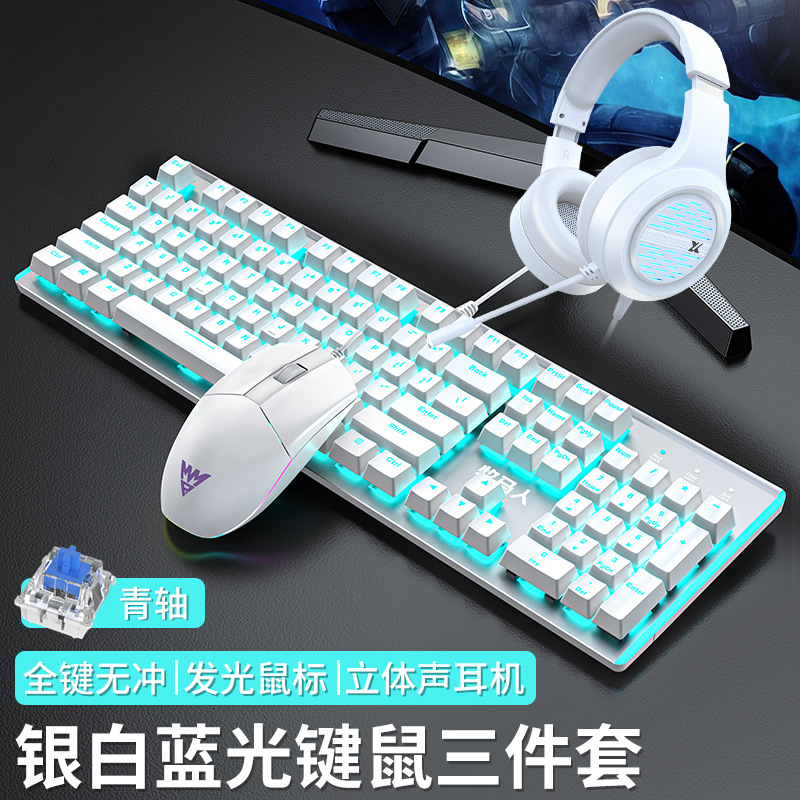 • E-스포츠 트루 메카니컬 샤프트 - 실버 화이트 블루 라이트 [3종 세트 - 브라운 샤프트] + M2 야광 마우스 + 스테레오 헤드셋 - 없음 - 104 키 - 표준