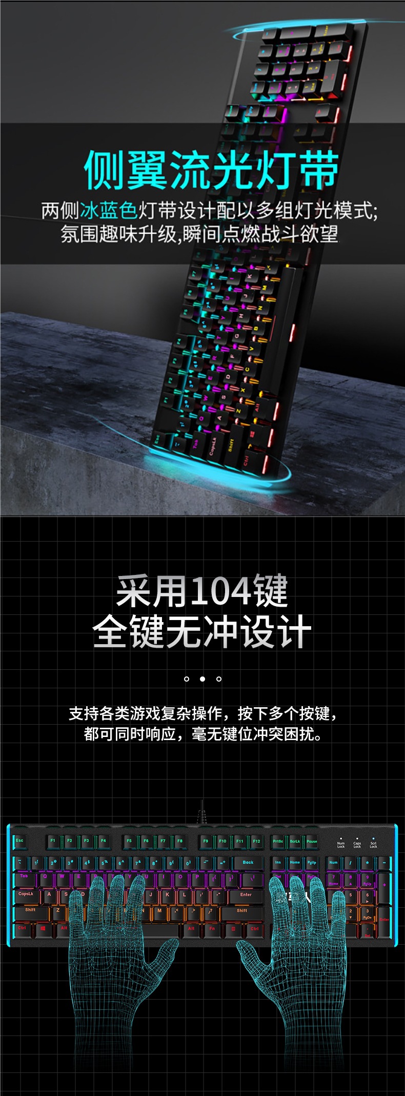 • E-스포츠 트루 메카니컬 샤프트 - 실버 화이트 블루 라이트 [라이트 티 샤프트] 사이드 윙 스트리머丨 풀 키 롤오버 없음 - 104 키 - 표준 구성