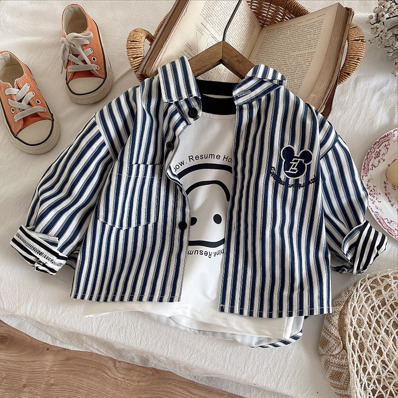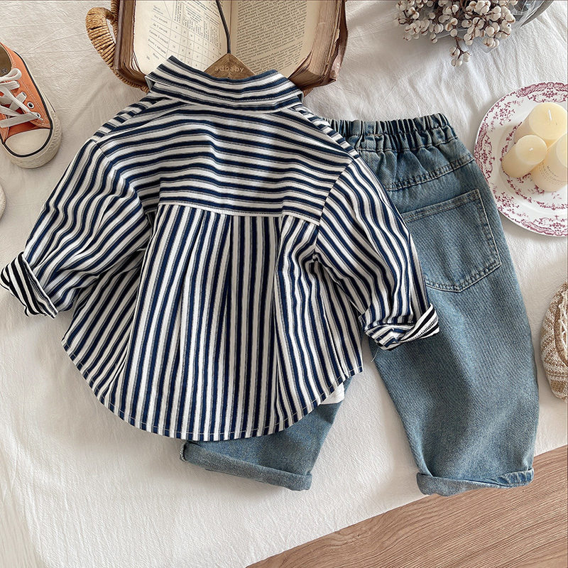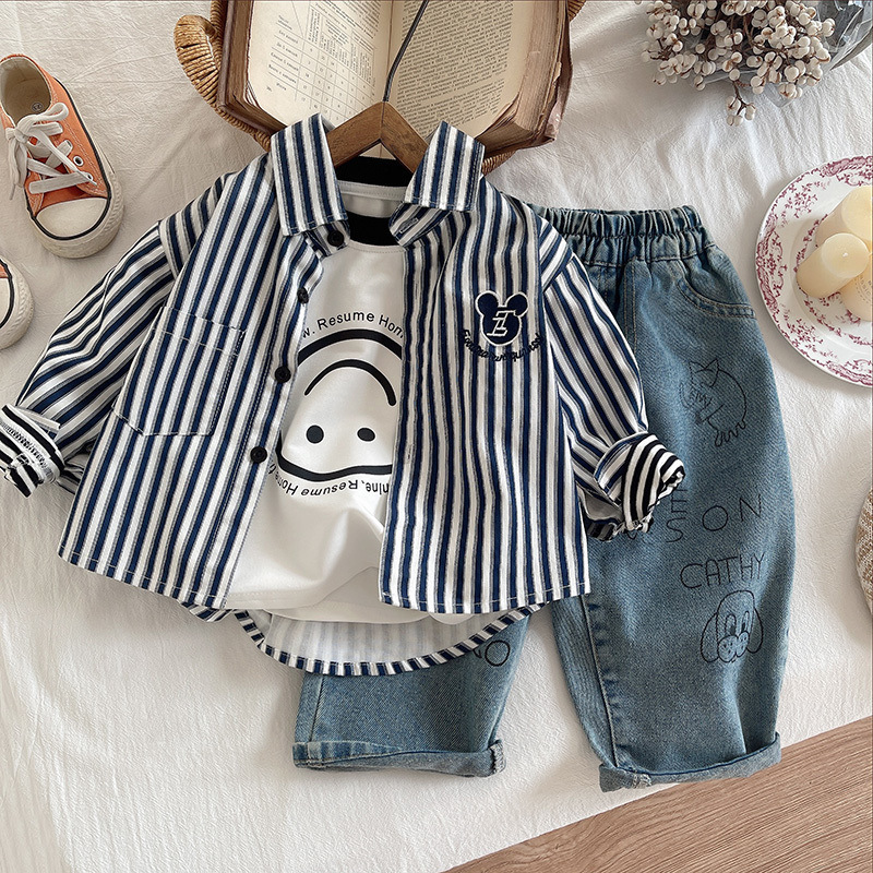 25 트렌디 한 어린이 봄, 가을 긴팔 가짜 투피스 T 소년 베이비 슈트 스트라이프 셔츠 소년 한국 스타일 청바지 3 피스 세트