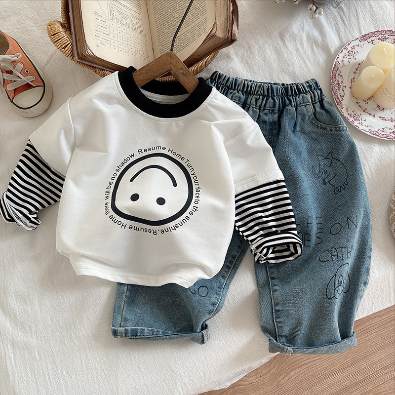 25 트렌디 한 어린이 봄, 가을 긴팔 가짜 투피스 T 소년 베이비 슈트 스트라이프 셔츠 소년 한국 스타일 청바지 3 피스 세트스토어 가기