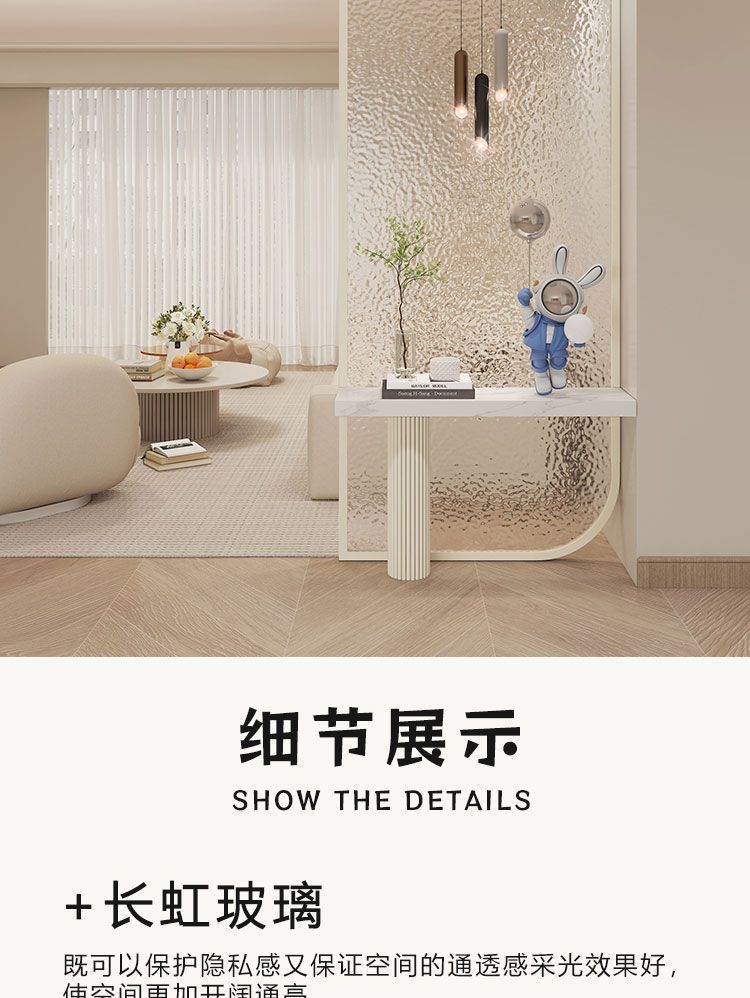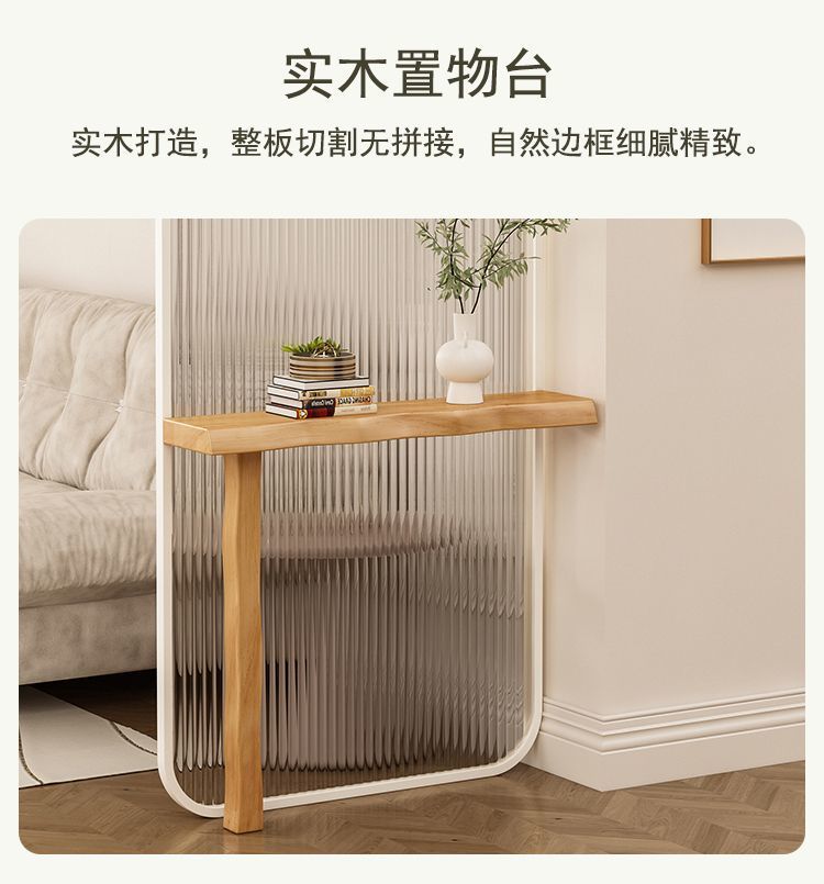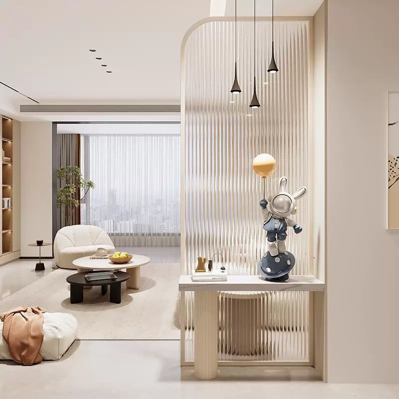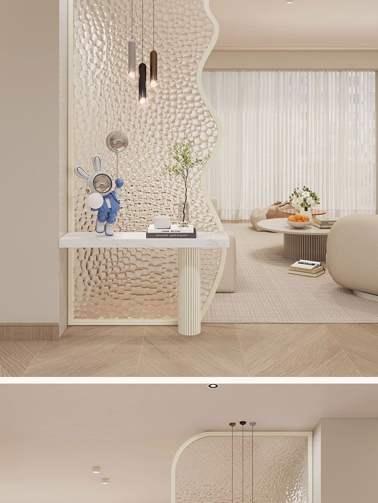 창의적인 크림 스타일의 물결 모양의 스크린 파티션, 현관에 직면한 거실, 현관 보관함을 가리키는 세면대