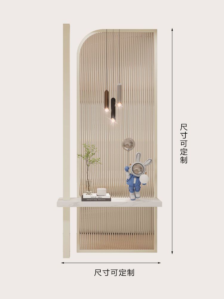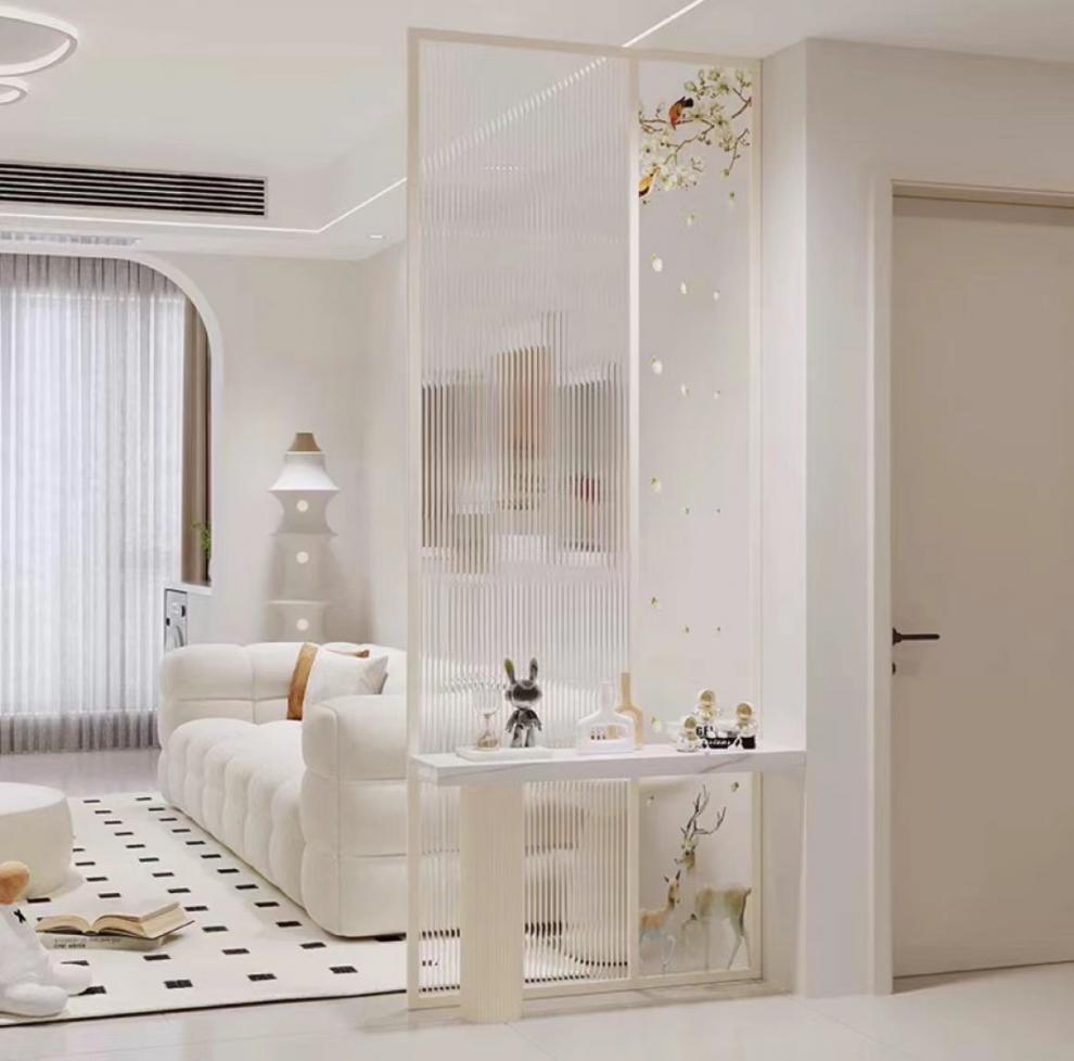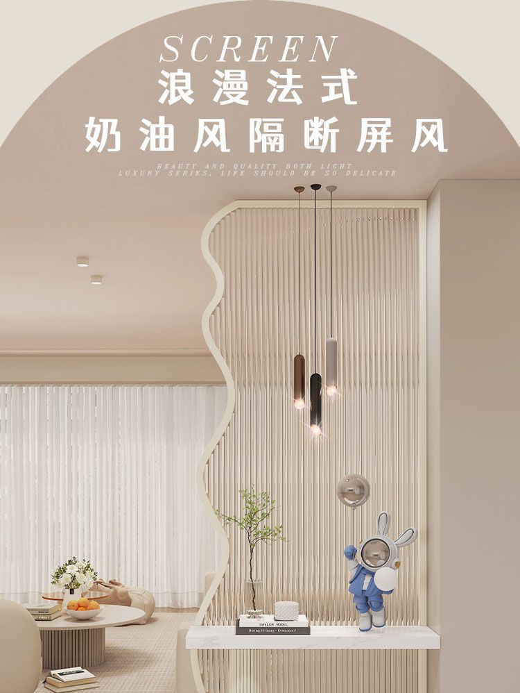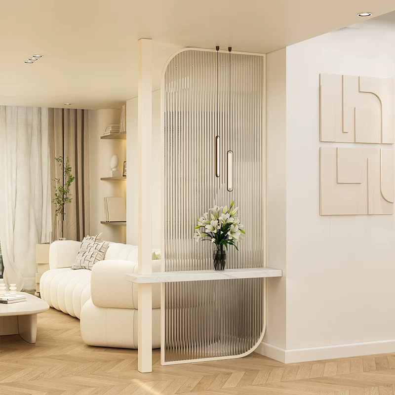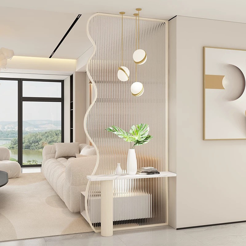 창의적인 크림 스타일의 물결 모양의 스크린 파티션, 현관에 직면한 거실, 현관 보관함을 가리키는 세면대스토어 가기
