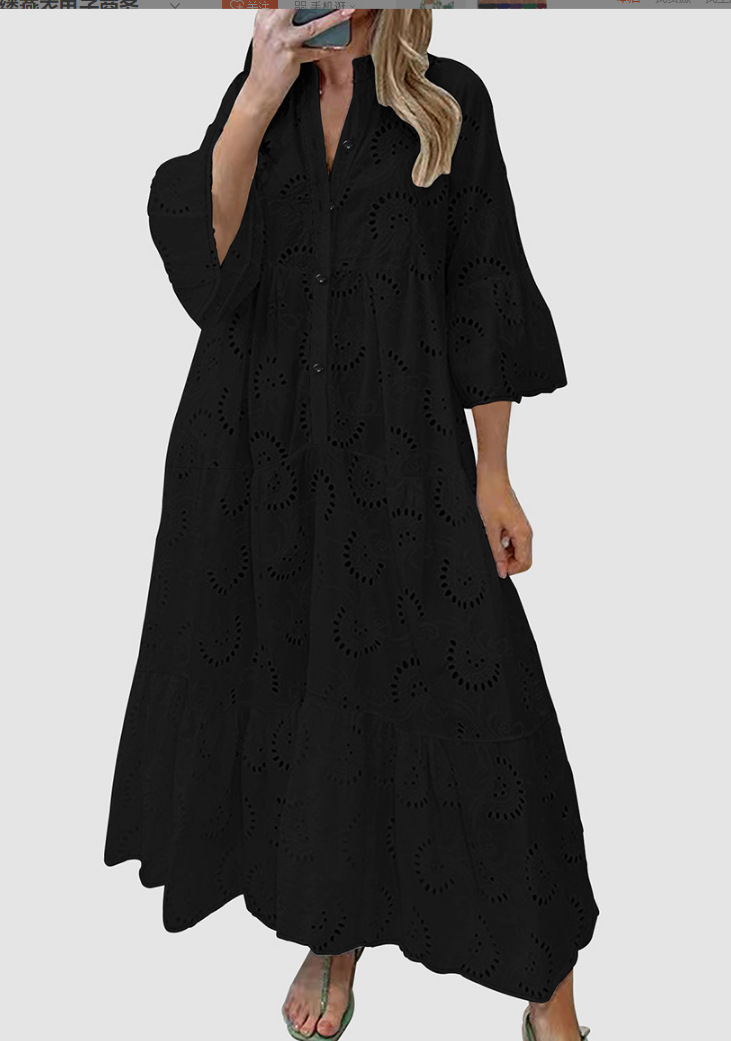 2025 유럽과 미국의 국경 간 여름과 가을 프렌치 브이넥 벨 슬리브 레이스 중공 솔리드 컬러 섹시한 롱 드레스 여성용