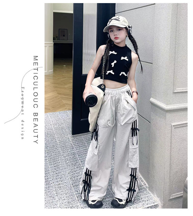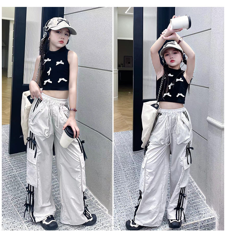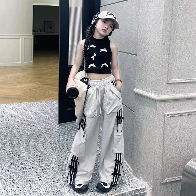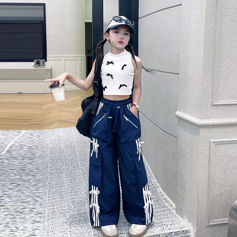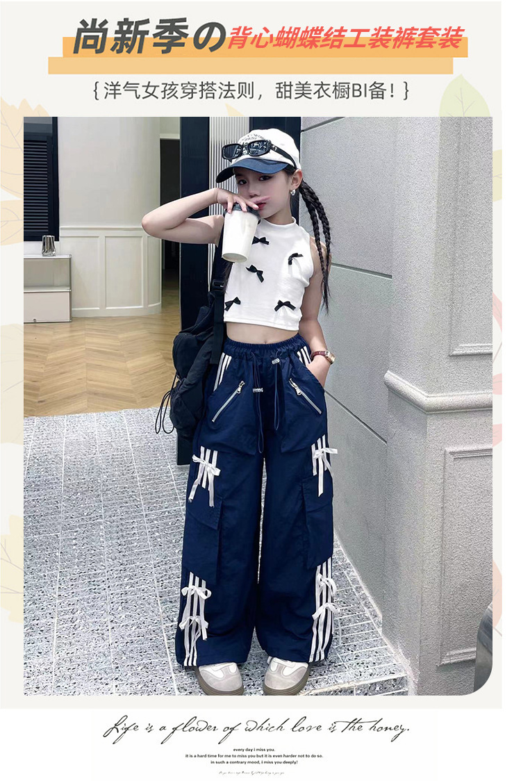 여자 작업복 정장 여름 2024 새로운 중대형 어린이 패션 조끼 나비 넥타이 캐주얼 바지