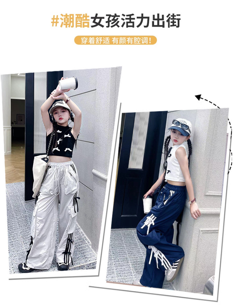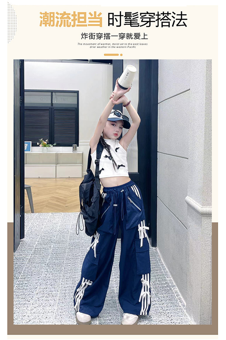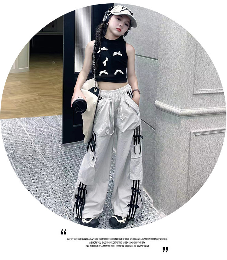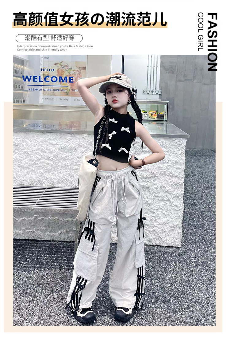 여자 작업복 정장 여름 2024 새로운 중대형 어린이 패션 조끼 나비 넥타이 캐주얼 바지