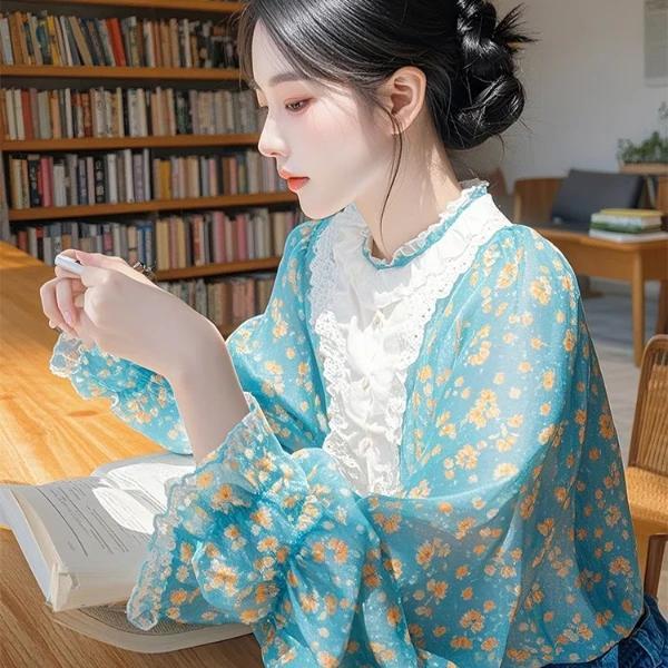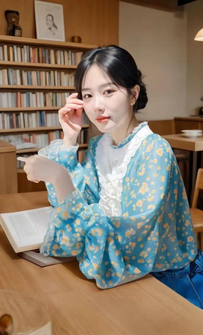 2025 봄 신상 프렌치 달콤하고 성숙한 셔츠, 매우 아름답고 독특하고 아름다운 파란색 꽃무늬 퍼프 슬리브 셔츠스토어 가기