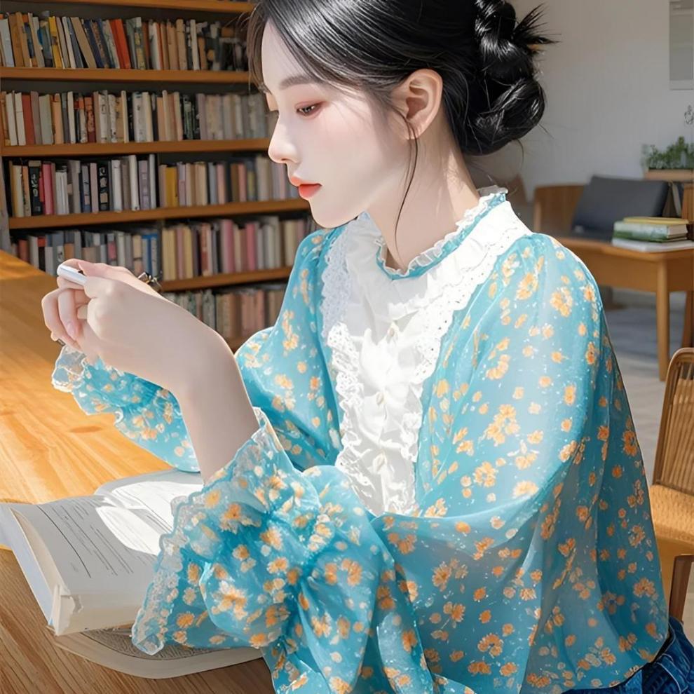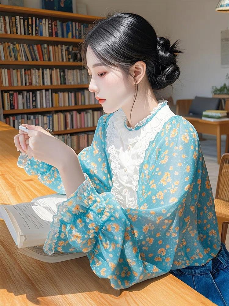 2025 봄 신상 프렌치 달콤하고 성숙한 셔츠, 매우 아름답고 독특하고 아름다운 파란색 꽃무늬 퍼프 슬리브 셔츠