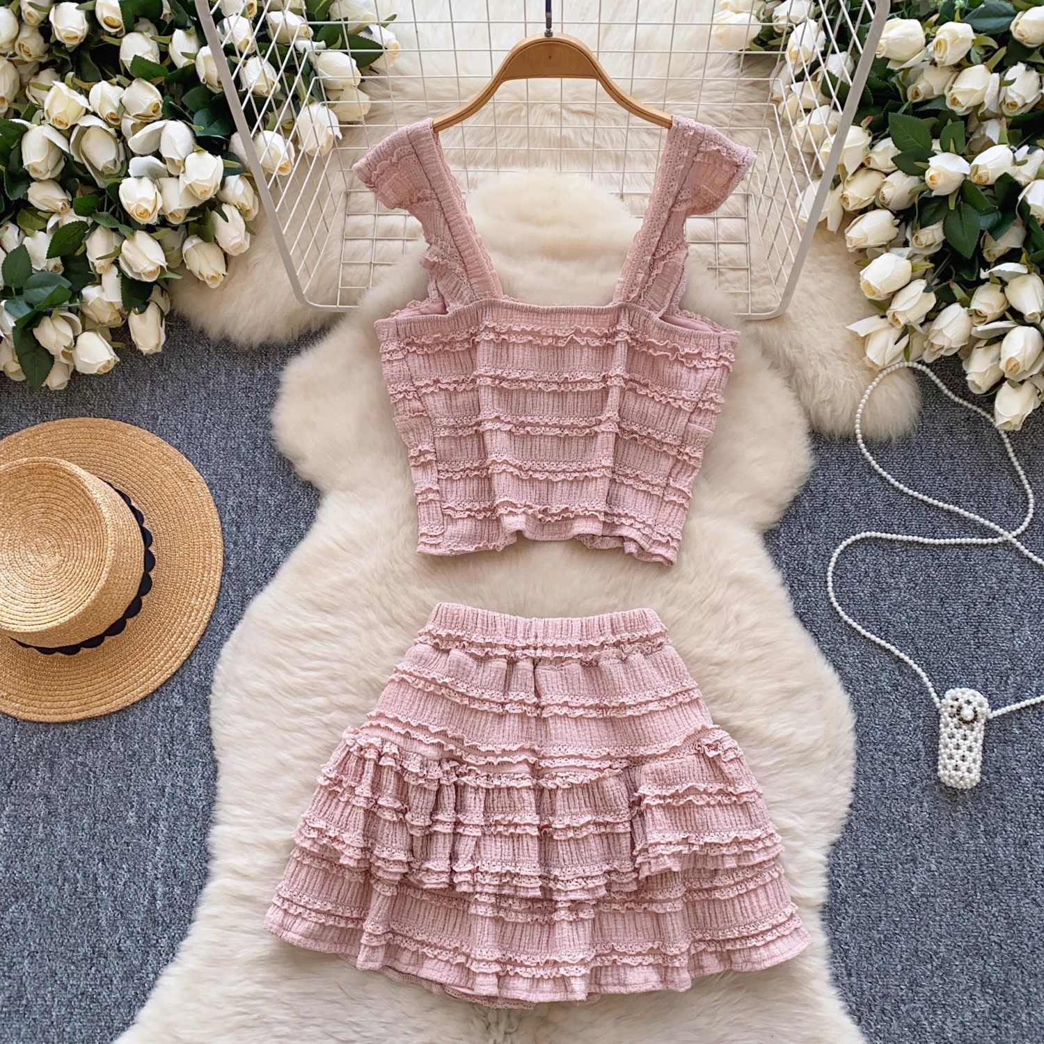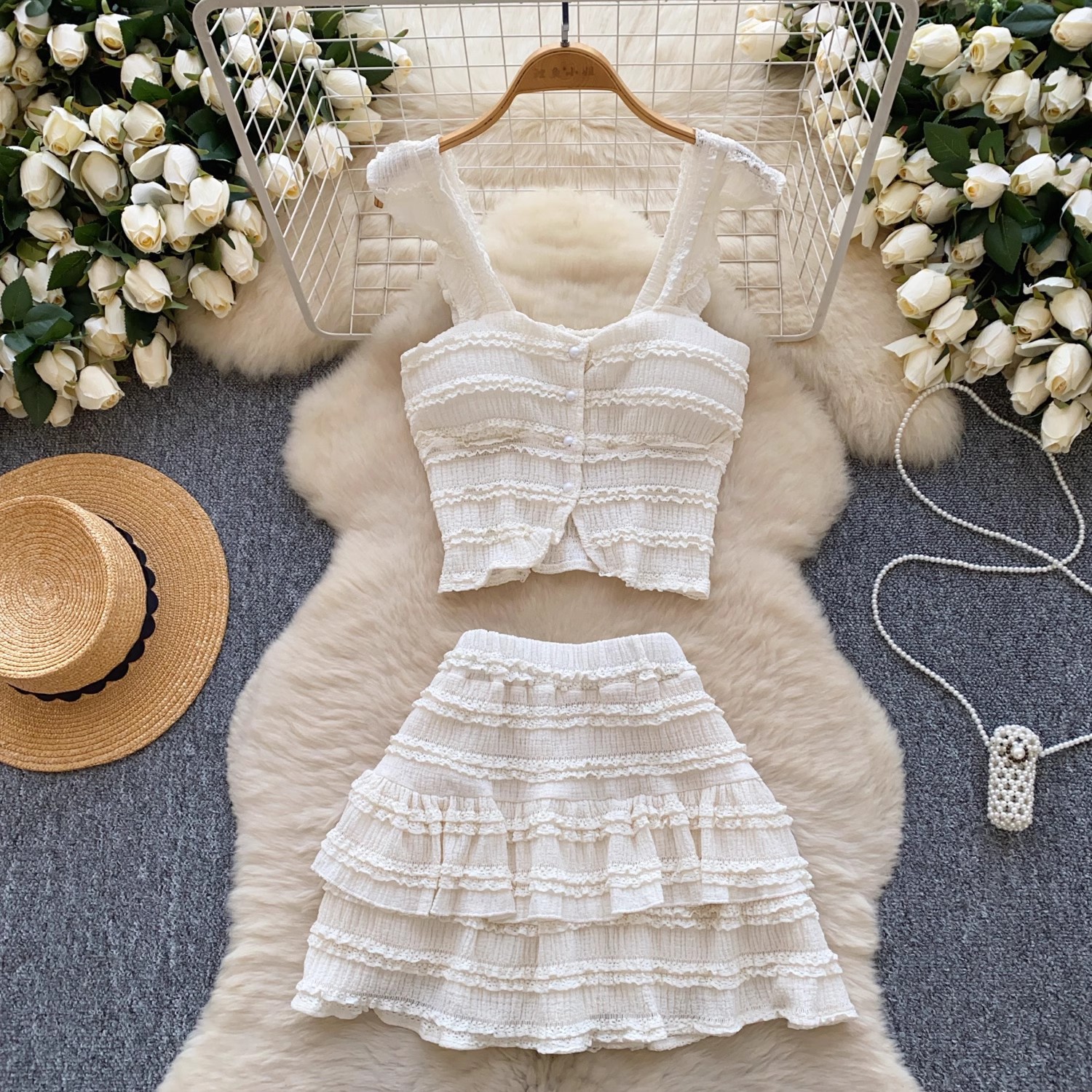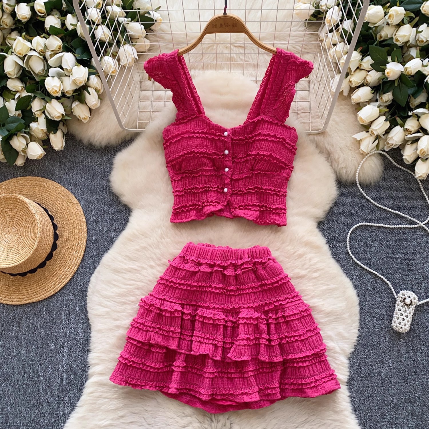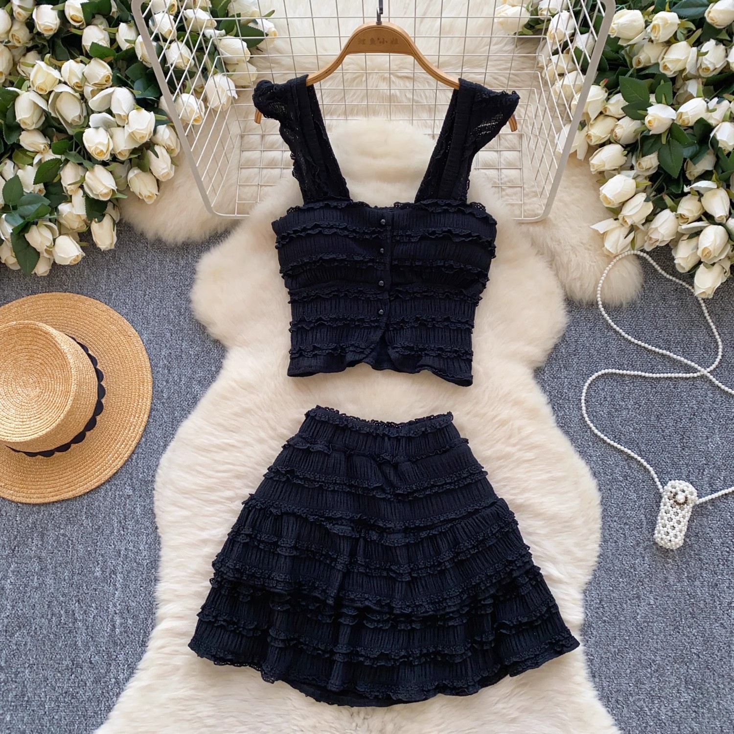 유럽과 미국의 핫걸 스타일 작은 귀 디자인 순수한 욕망 정장 여성 서스펜더 튜브 탑 + 하이 웨이스트 스커트