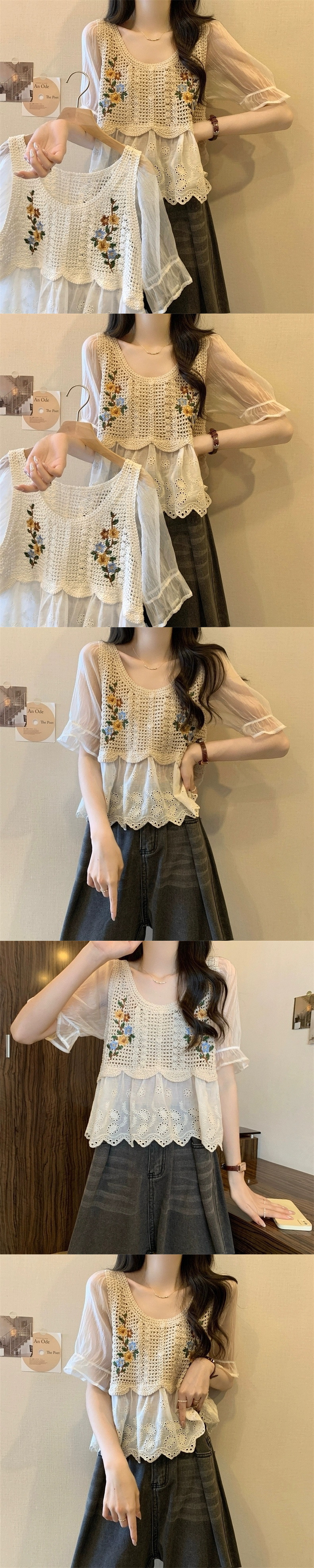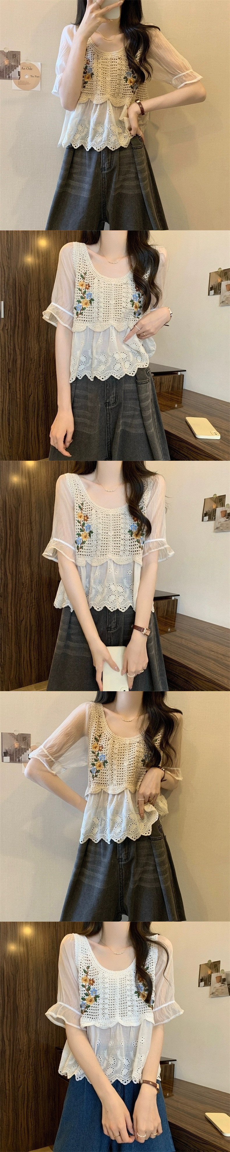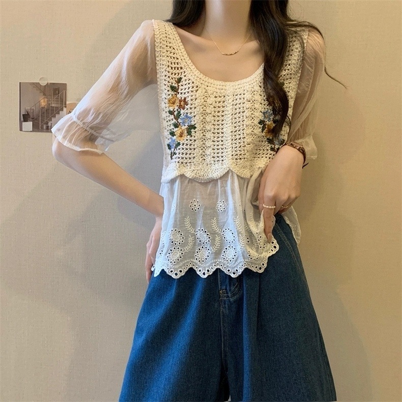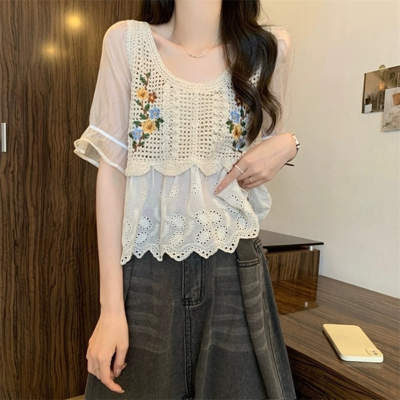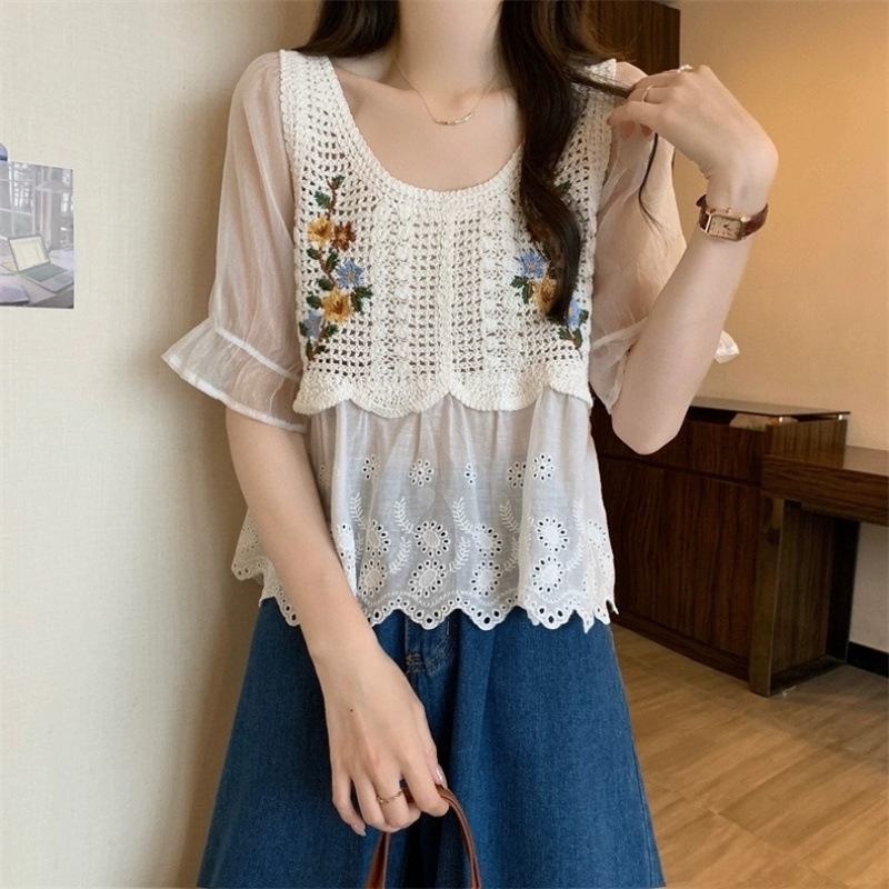 여성을위한 프랑스 복고풍 자수 뜨개질 중공 접합 반팔 쉬폰 셔츠 여름 달콤한 보헤미안 민족 스타일 탑