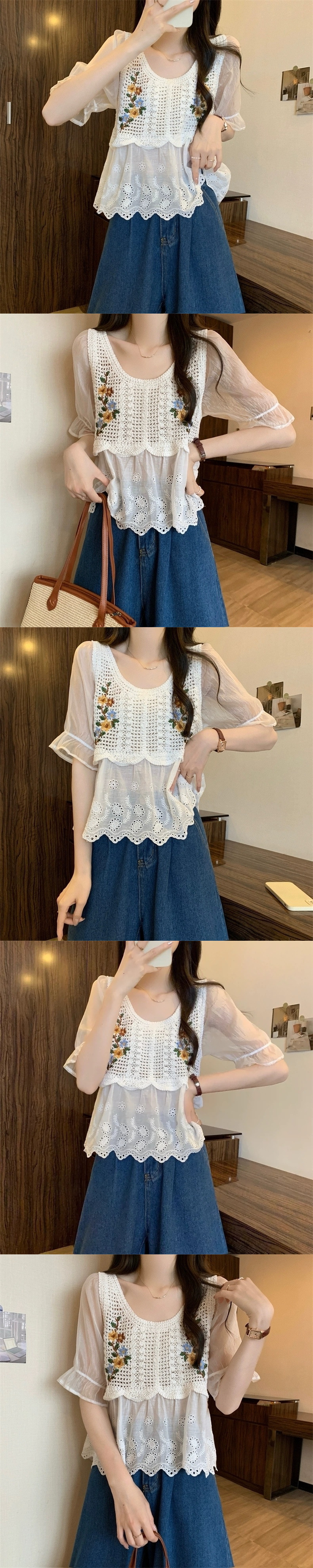여성을위한 프랑스 복고풍 자수 뜨개질 중공 접합 반팔 쉬폰 셔츠 여름 달콤한 보헤미안 민족 스타일 탑스토어 가기