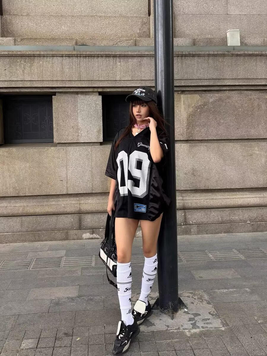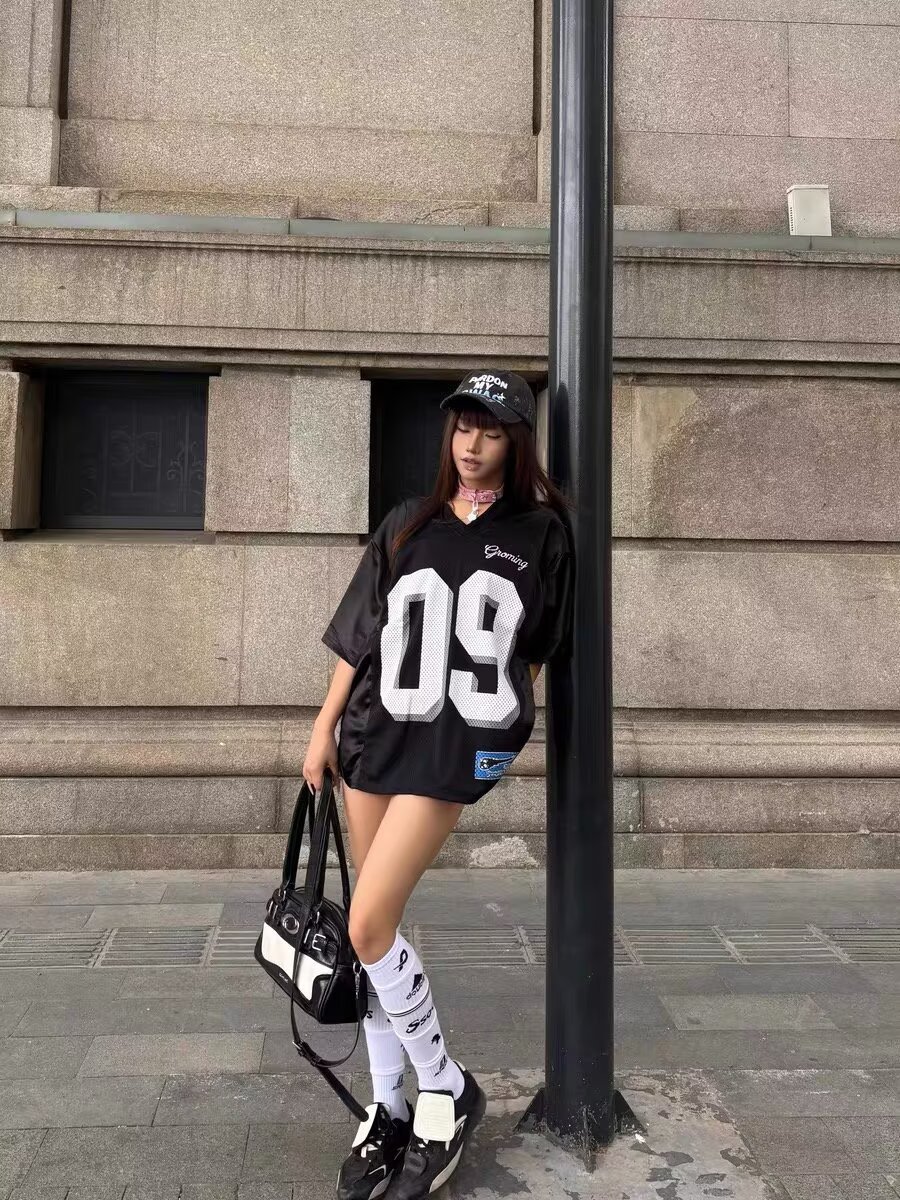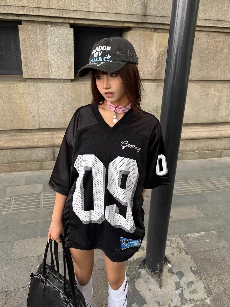 여름 여성용 아메리칸 스포츠 스타일 반팔 티셔츠 대비 색상 디지털 저지 디자인 V 넥 메쉬 힙합 반팔 탑스토어 가기