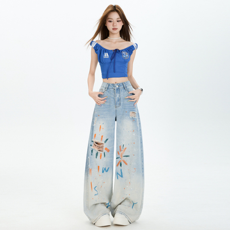 여성용 찢어진 페인트 청바지 2025 여름 새로운 스타일 하이 웨이스트 루즈 와이드 레그 바닥 길이 디자인 좁은 버전 스트레이트 팬츠스토어 가기