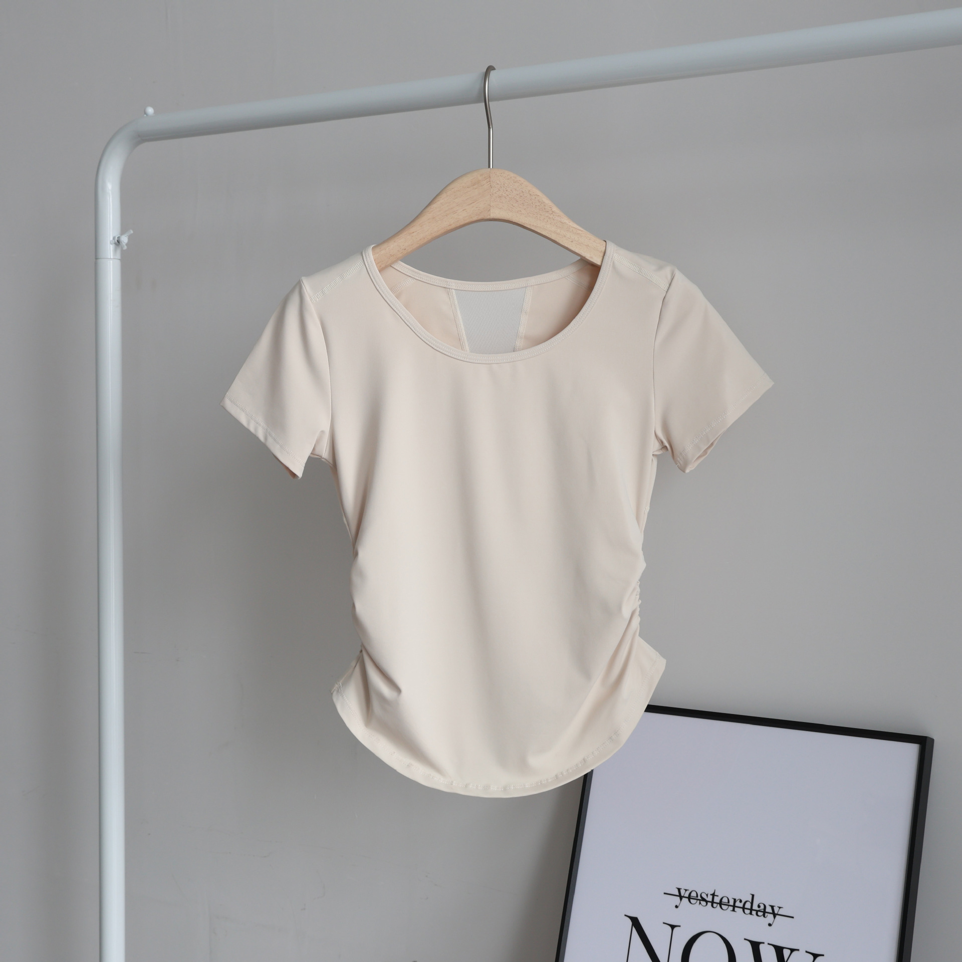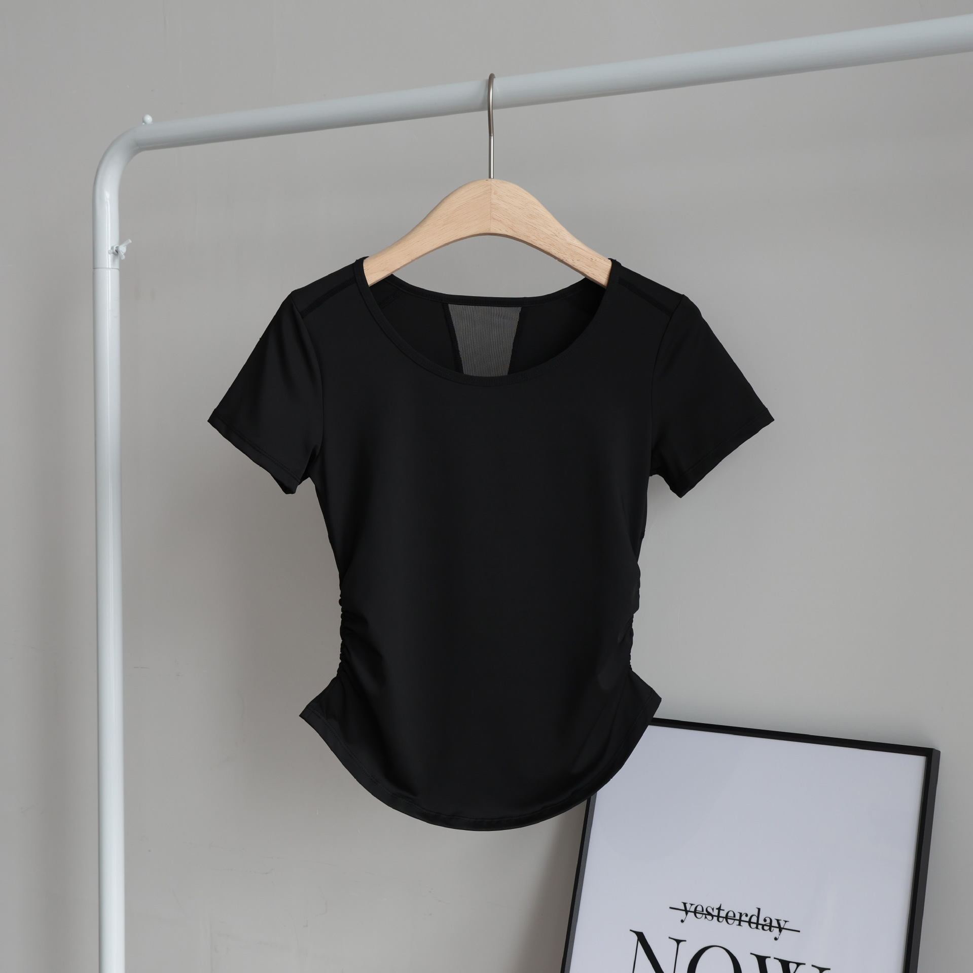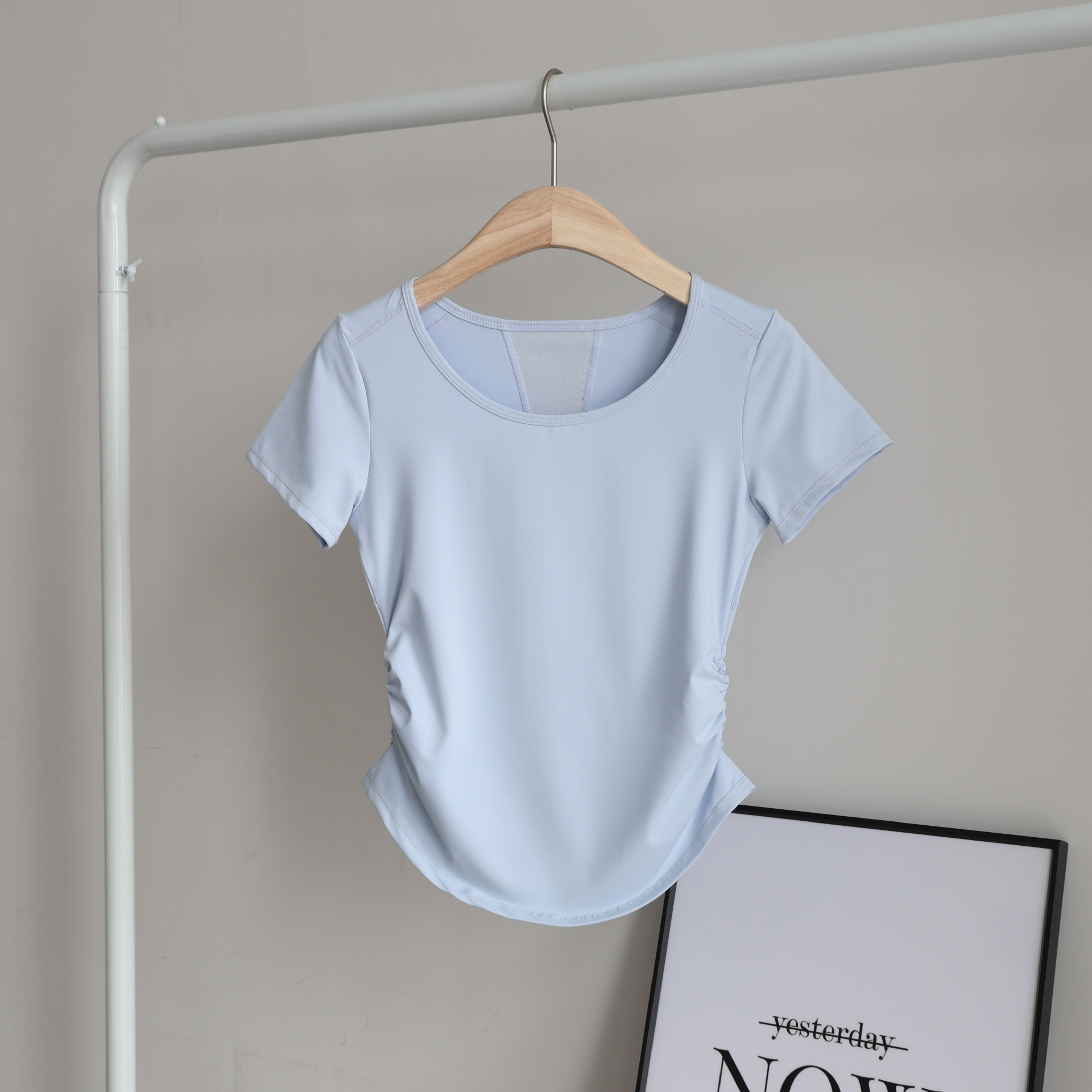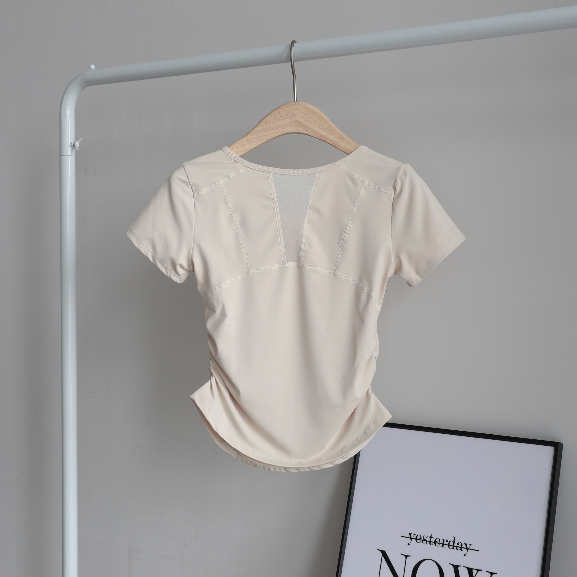 스포츠 반팔 여성 여름 주름 허리 피트니스 트레이닝 탑 메쉬 스플 라이스 통기성 속건 요가웨어 티셔츠