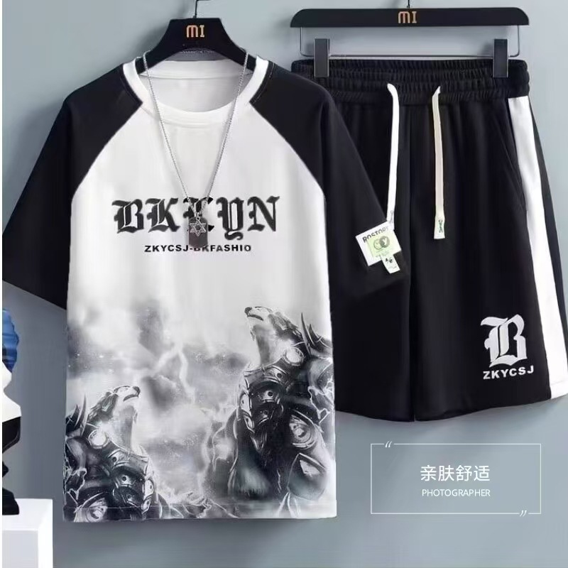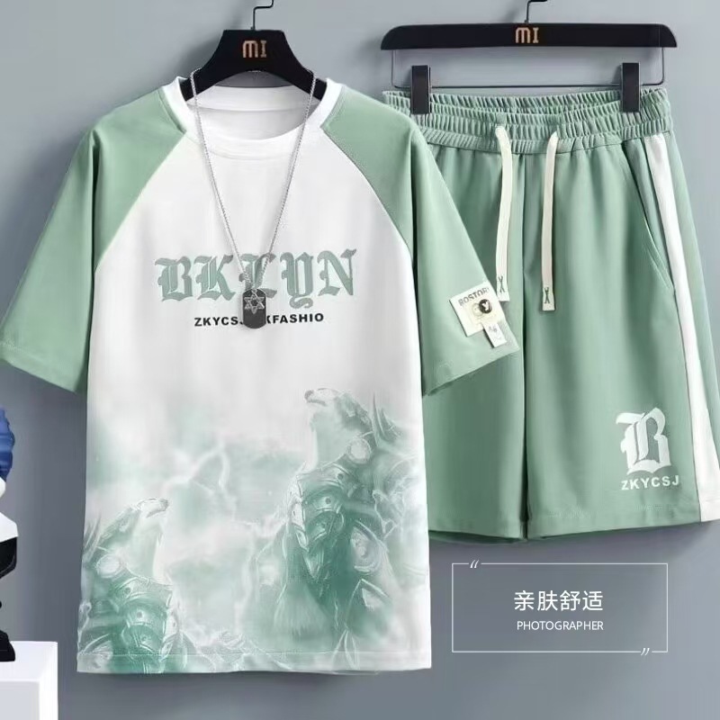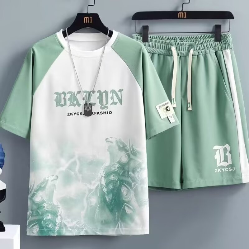 남성과 청소년을 위한 여름 신상 아이스 실크 캐주얼 패션 스포츠 슈트 홍콩 스타일 루즈하고 멋진 트렌디 티셔츠 세트
