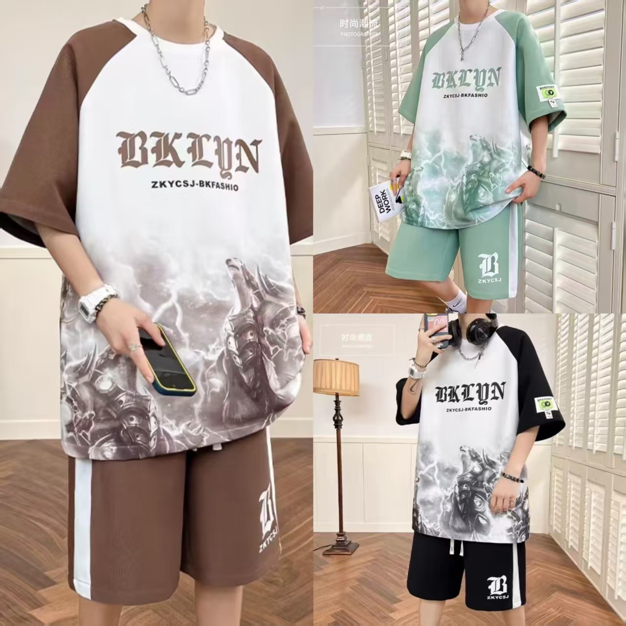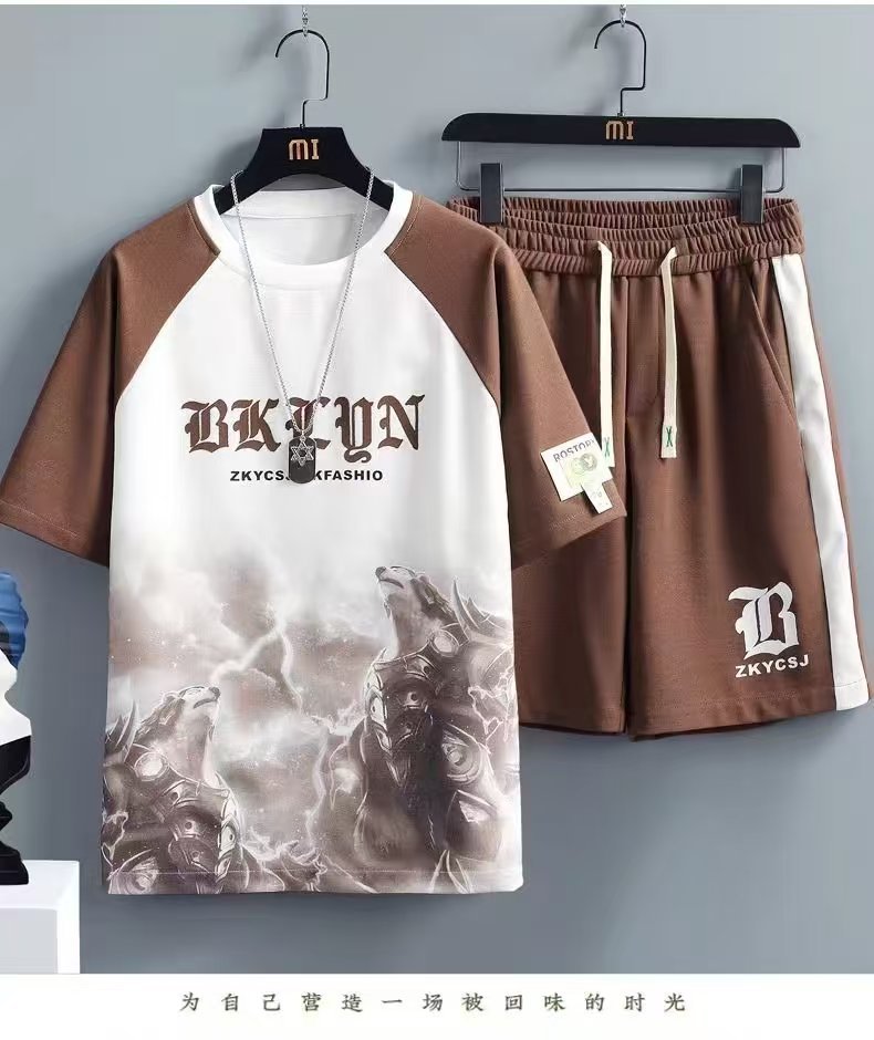 남성과 청소년을 위한 여름 신상 아이스 실크 캐주얼 패션 스포츠 슈트 홍콩 스타일 루즈하고 멋진 트렌디 티셔츠 세트스토어 가기