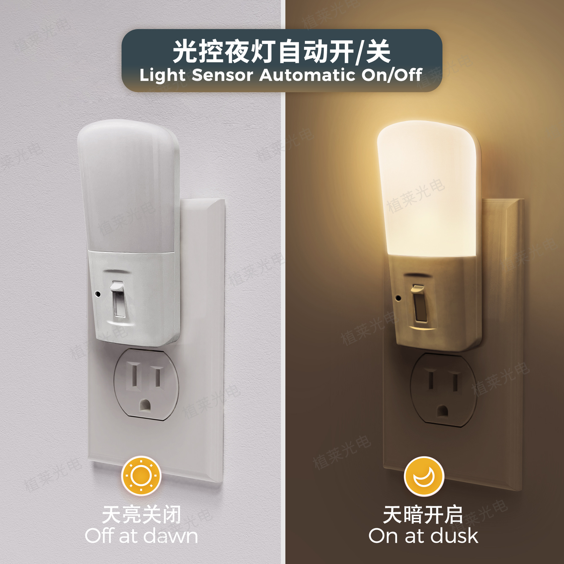 • Auto On/Off: The special smart light sensor chip will detect the luminance of surrounding environment, make it turn on automatically at night and turn off in the daytime. Do not need to switch on manually.
