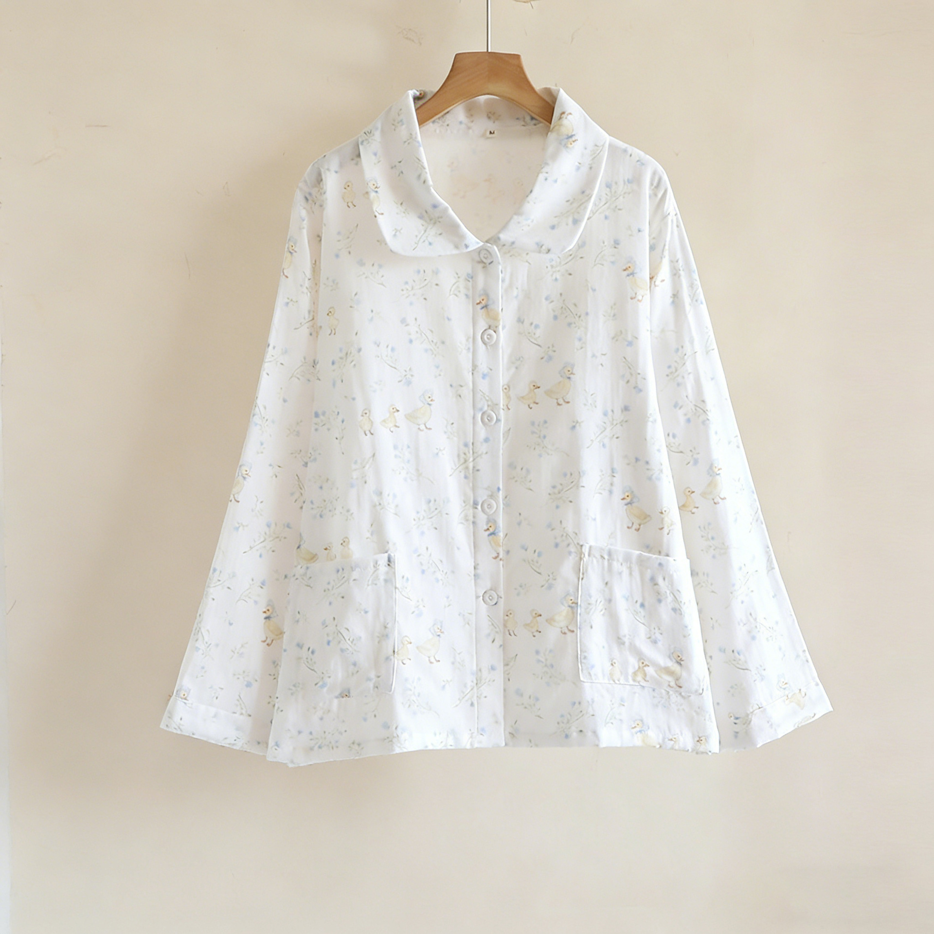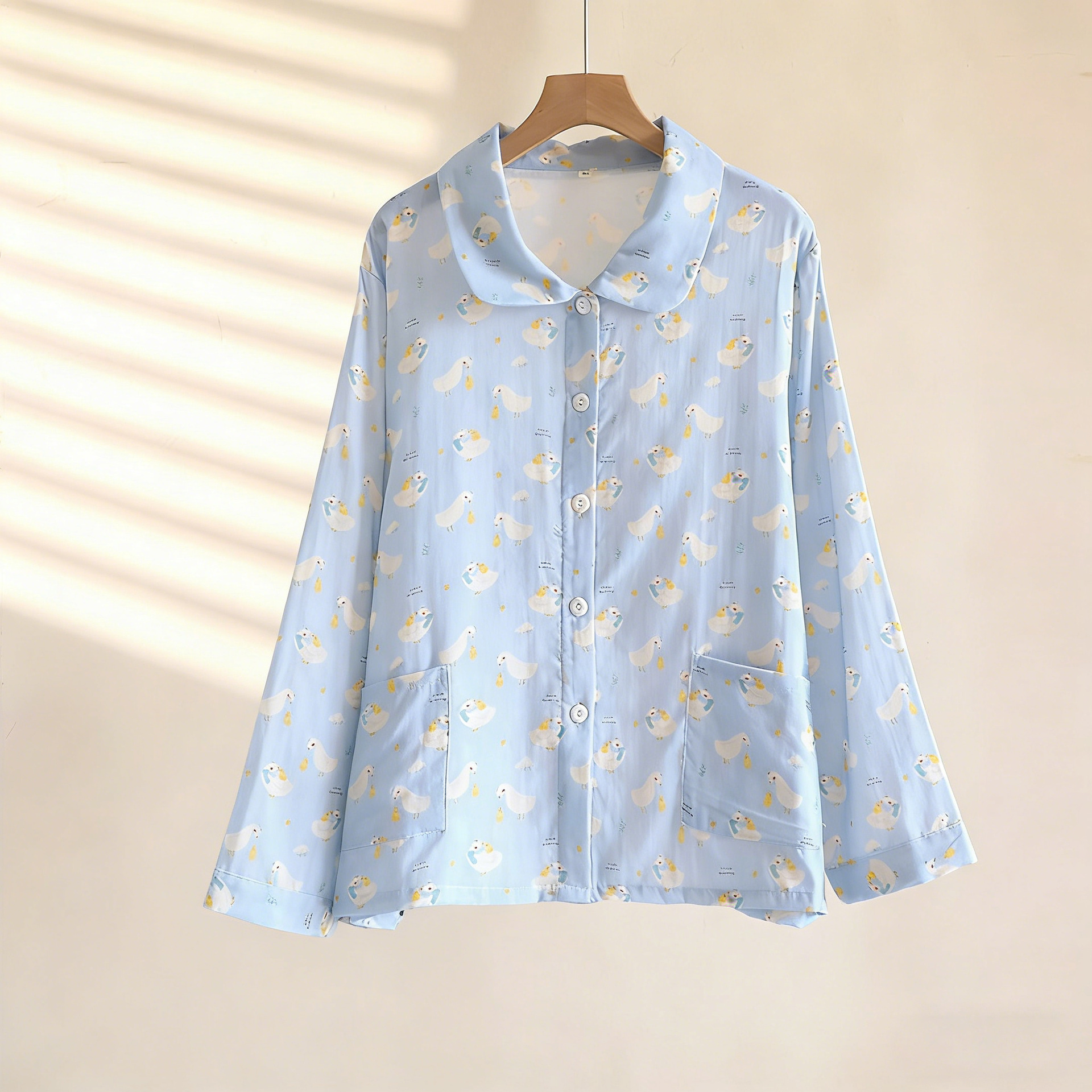 여성을위한 만화 흰색 거위 잠옷 봄, 가을, 여름 순수 코튼 거즈 긴팔 가정 의류 세트 얇은 에어컨 룸스토어 가기
