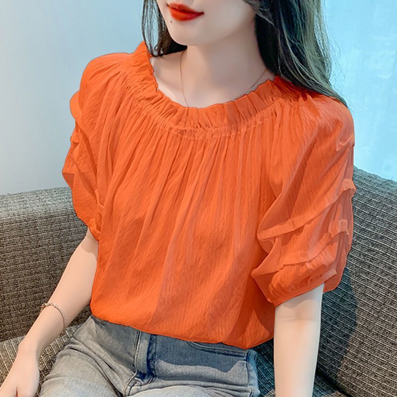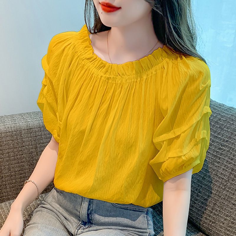 2025년 여름 여성을 위한 반팔 배 커버 쉬폰/폴리에스터 셔츠 새로운 스타일의 쇄골 프렌치 스타일