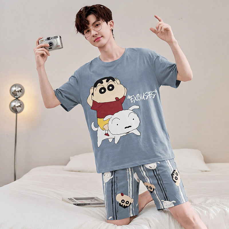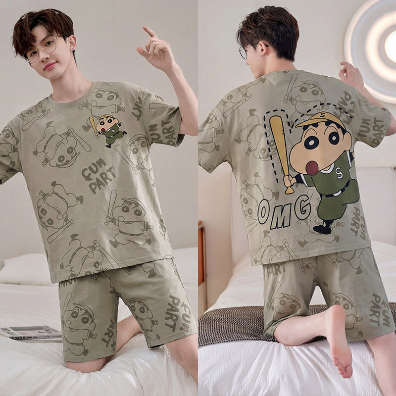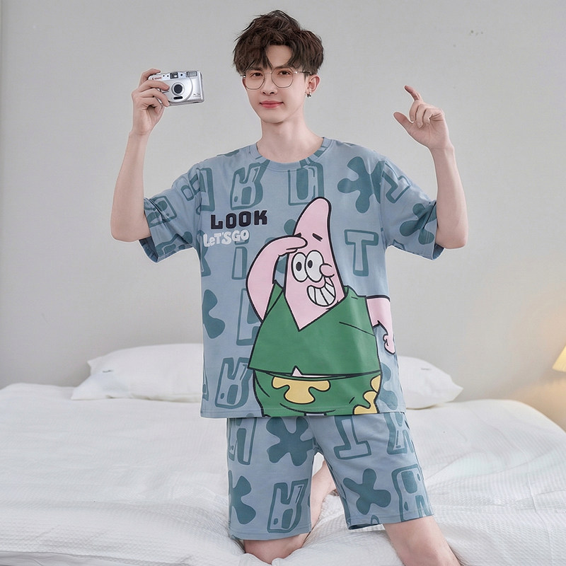 남성용 잠옷 반팔 얇은 여름 캐주얼 루즈 플러스 사이즈 여름 라운드 넥 심플 청소년 홈웨어 세트스토어 가기