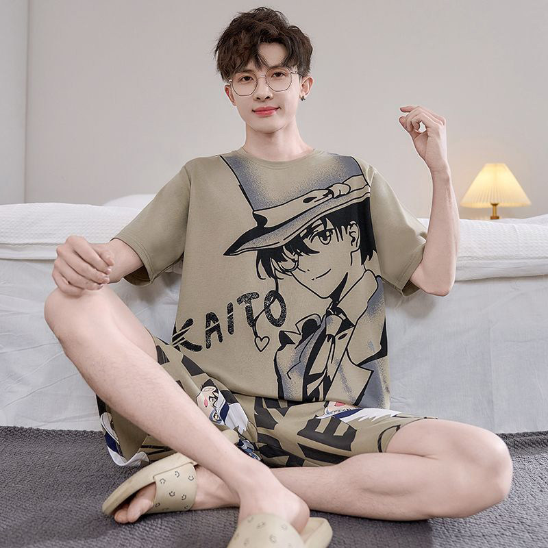 남성용 잠옷 반팔 얇은 여름 캐주얼 루즈 플러스 사이즈 여름 라운드 넥 심플 청소년 홈웨어 세트