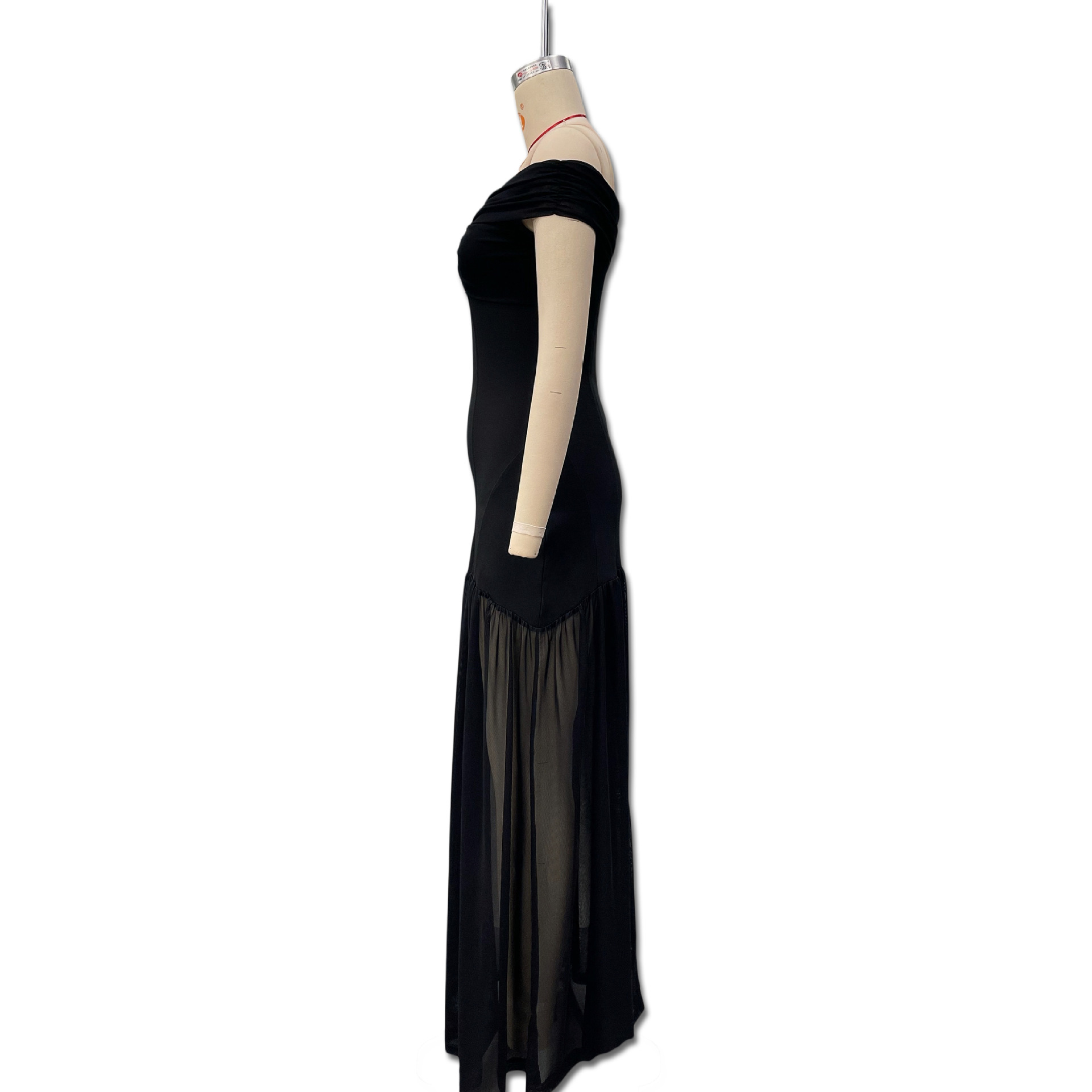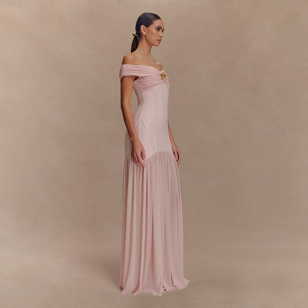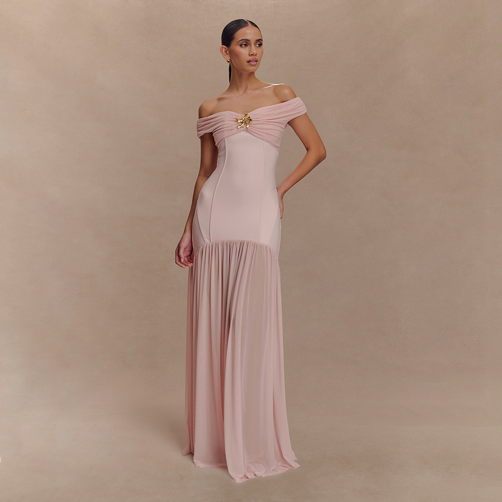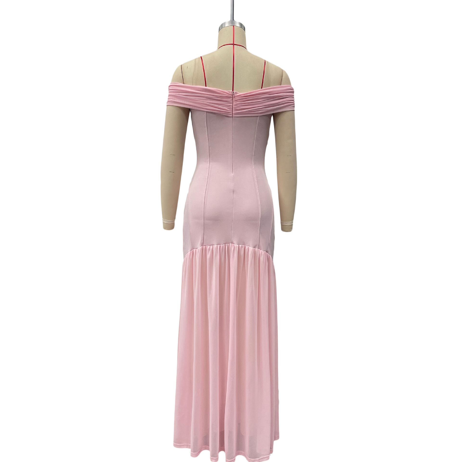 2025 새로운 크로스보더 스타일 우아한 원 숄더 롱 드레스 유럽과 미국 스타일의 백리스 섹시한 메쉬 스플라이싱 드레스