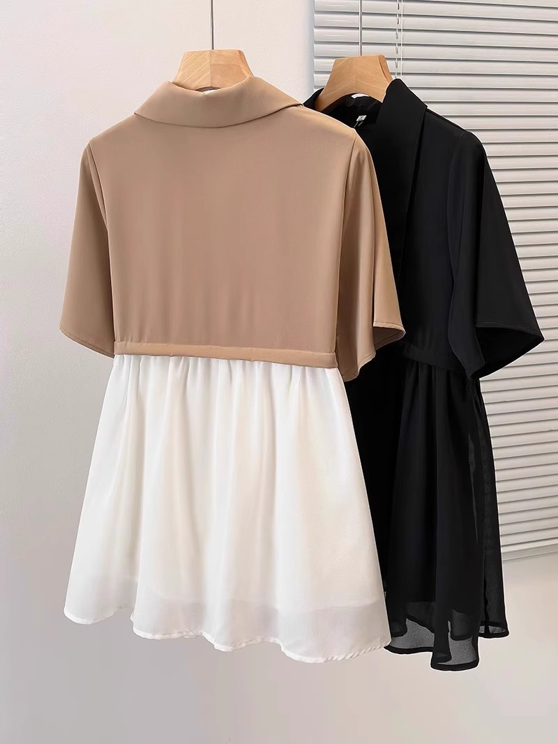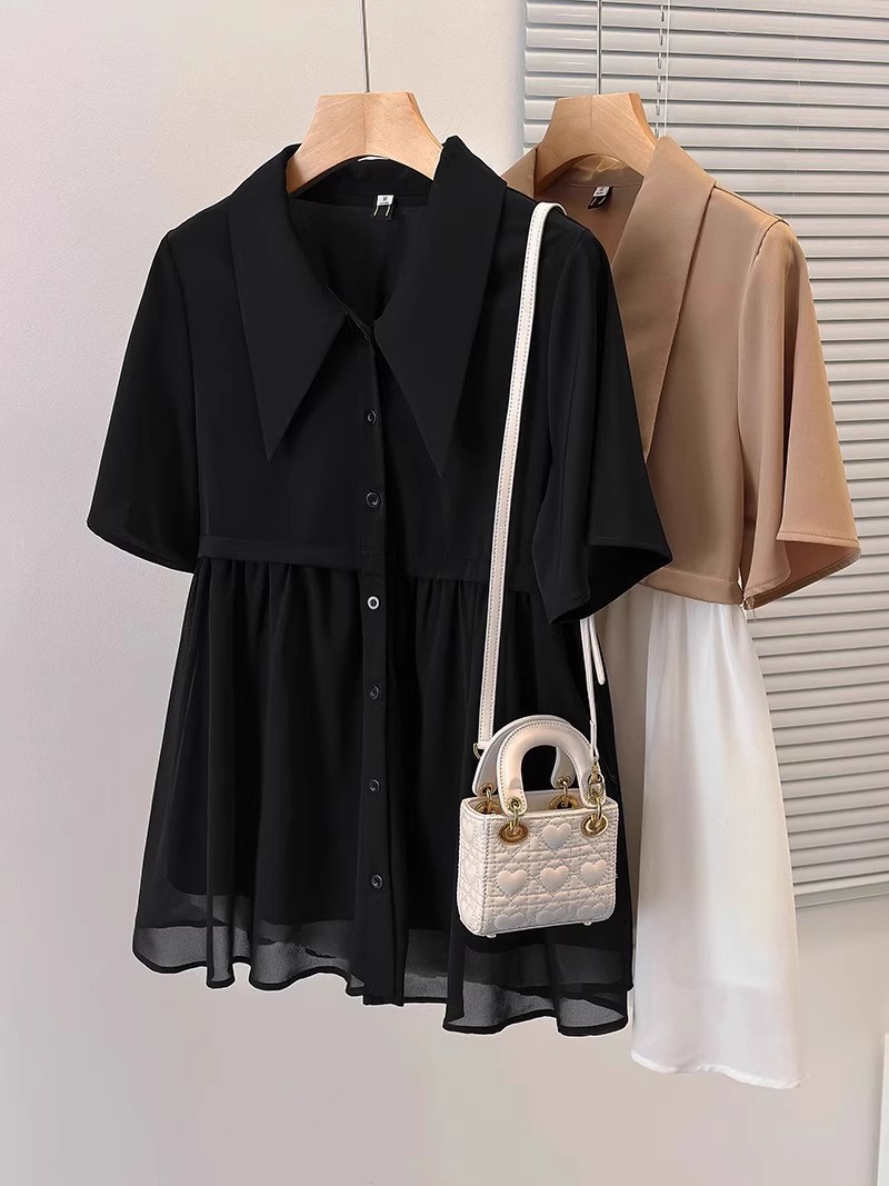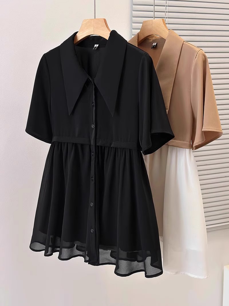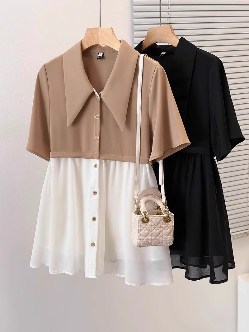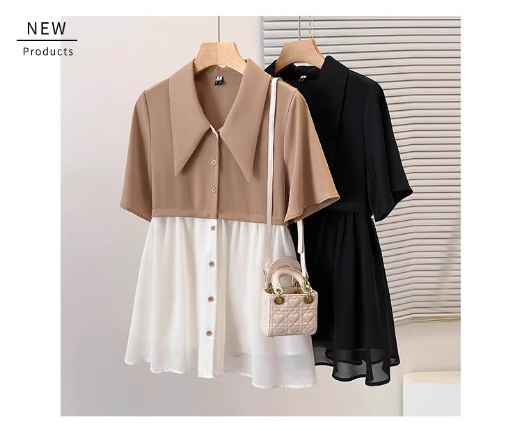 [오리지널 워크맨십] 뚱뚱한 여자를 위한 스플리싱 반팔 쉬폰 셔츠 MM 배 커버 스커트 미드기장 셔츠 블랙 슬리밍