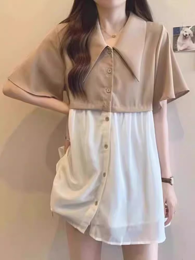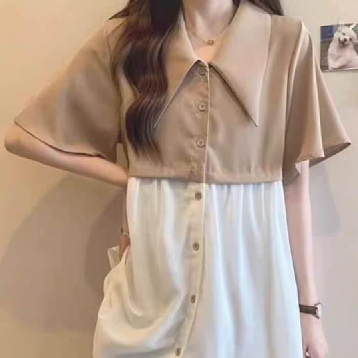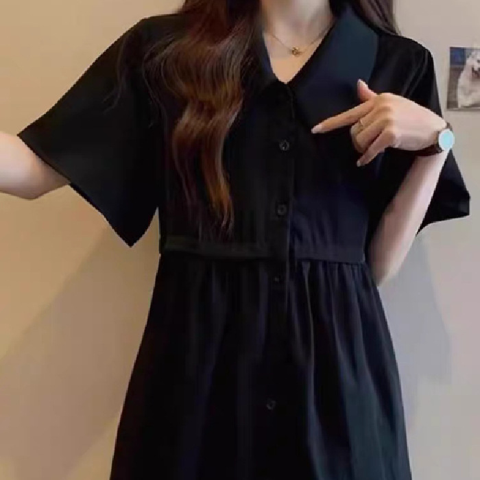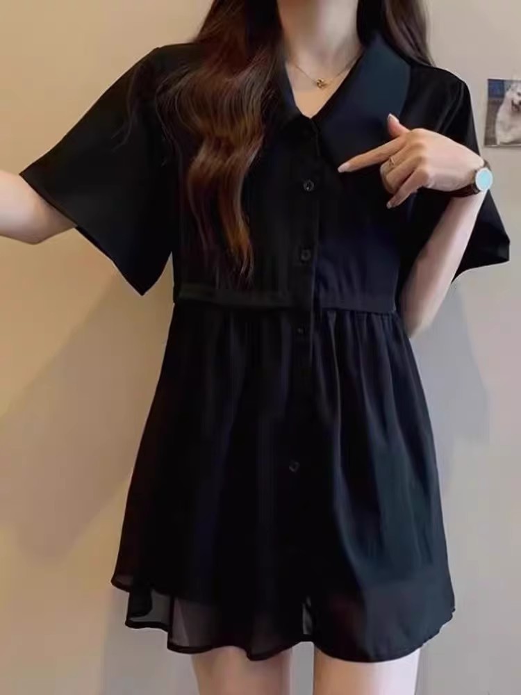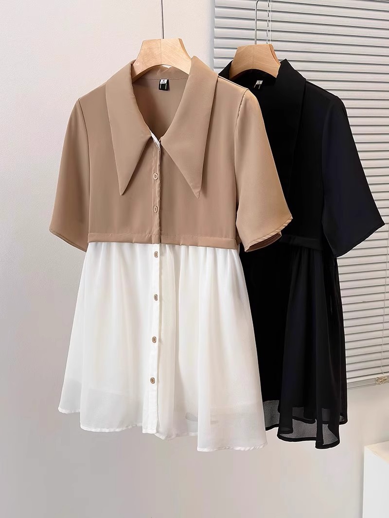 [오리지널 워크맨십] 뚱뚱한 여자를 위한 스플리싱 반팔 쉬폰 셔츠 MM 배 커버 스커트 미드기장 셔츠 블랙 슬리밍