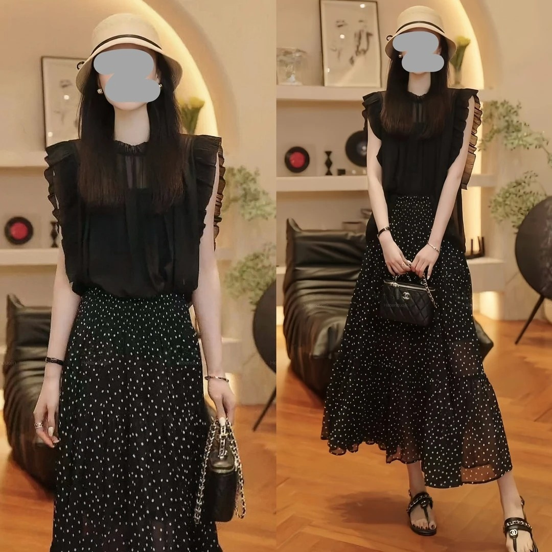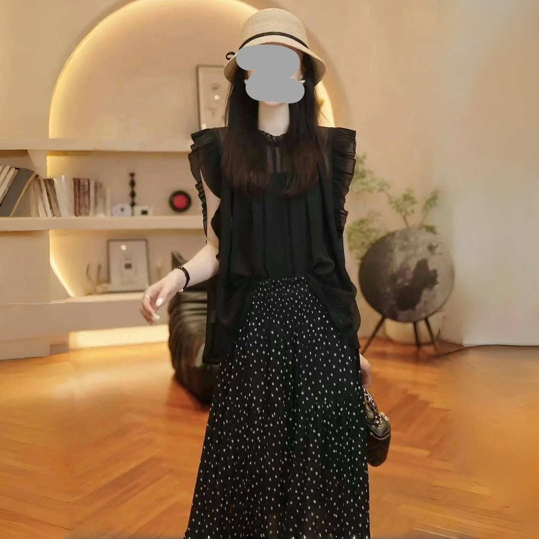 2025 여름 연령 감소 슬리밍 민소매 탑 통기성 블라우스 통근 다용도 폴카 도트 스커트 여성용 기질 슈트