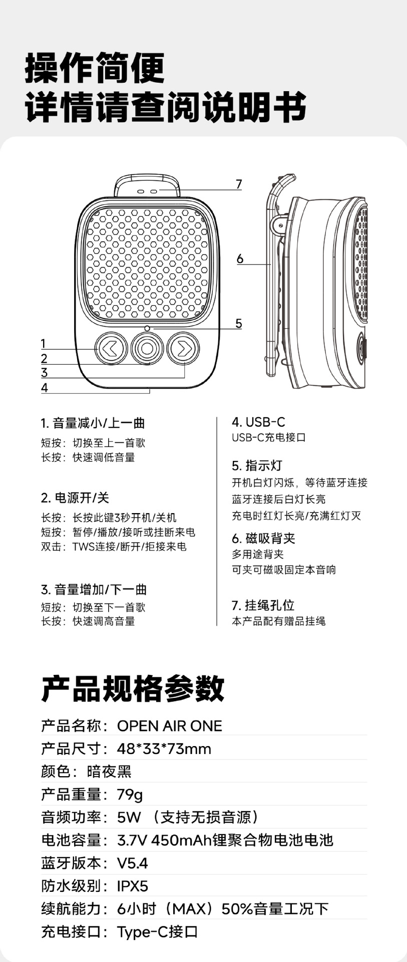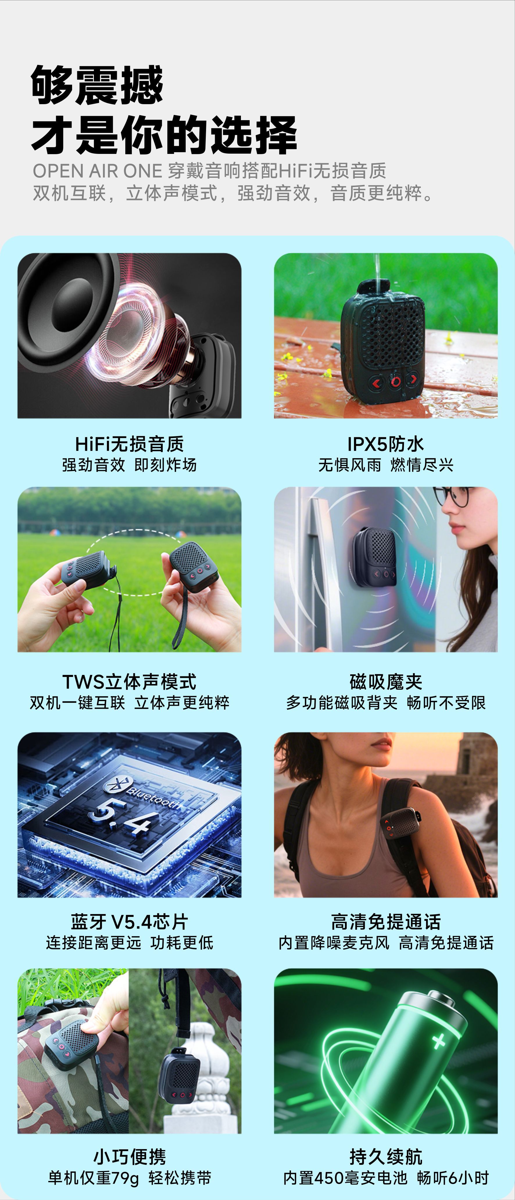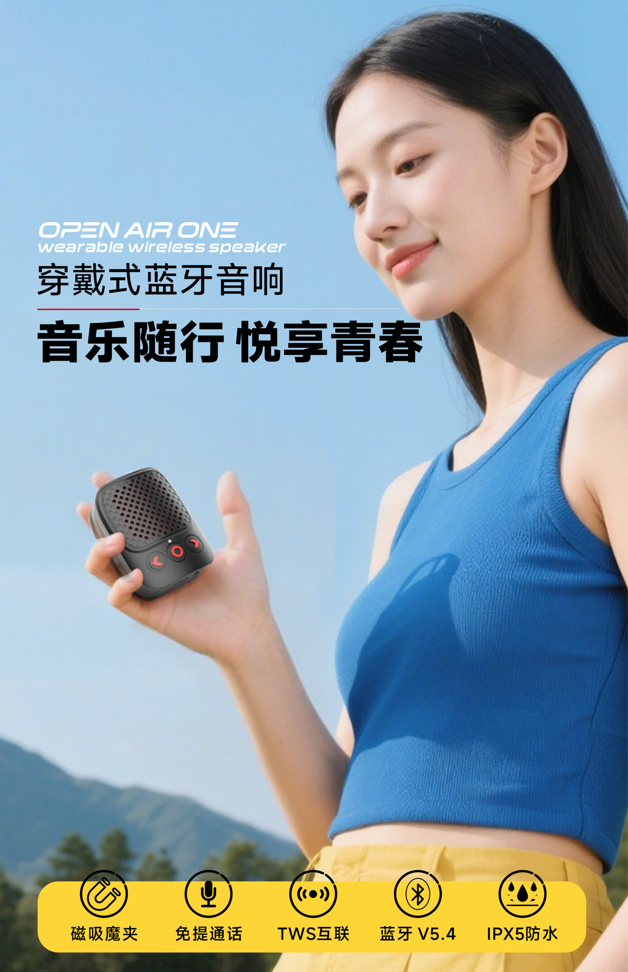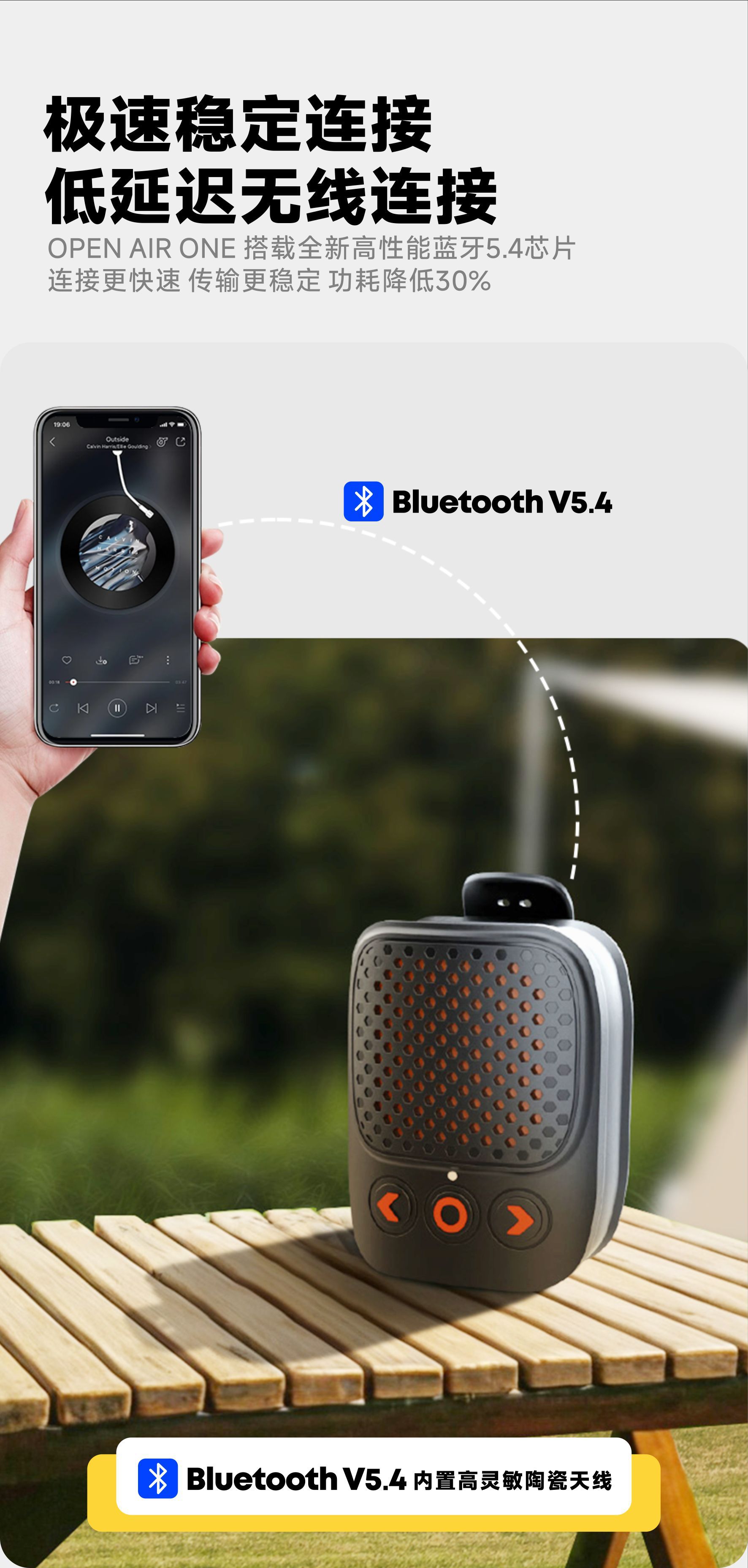Reimagine portable audio with the OpenAirOne — a mini wearable speaker engineered for adventure. Despite its small size (only 79g), it delivers powerful, crystal-clear sound thanks to a high-performance 6W driver. Featuring the latest Bluetooth 5.4, you’ll enjoy stable, extended wireless connectivity with seamless TWS stereo pairing.