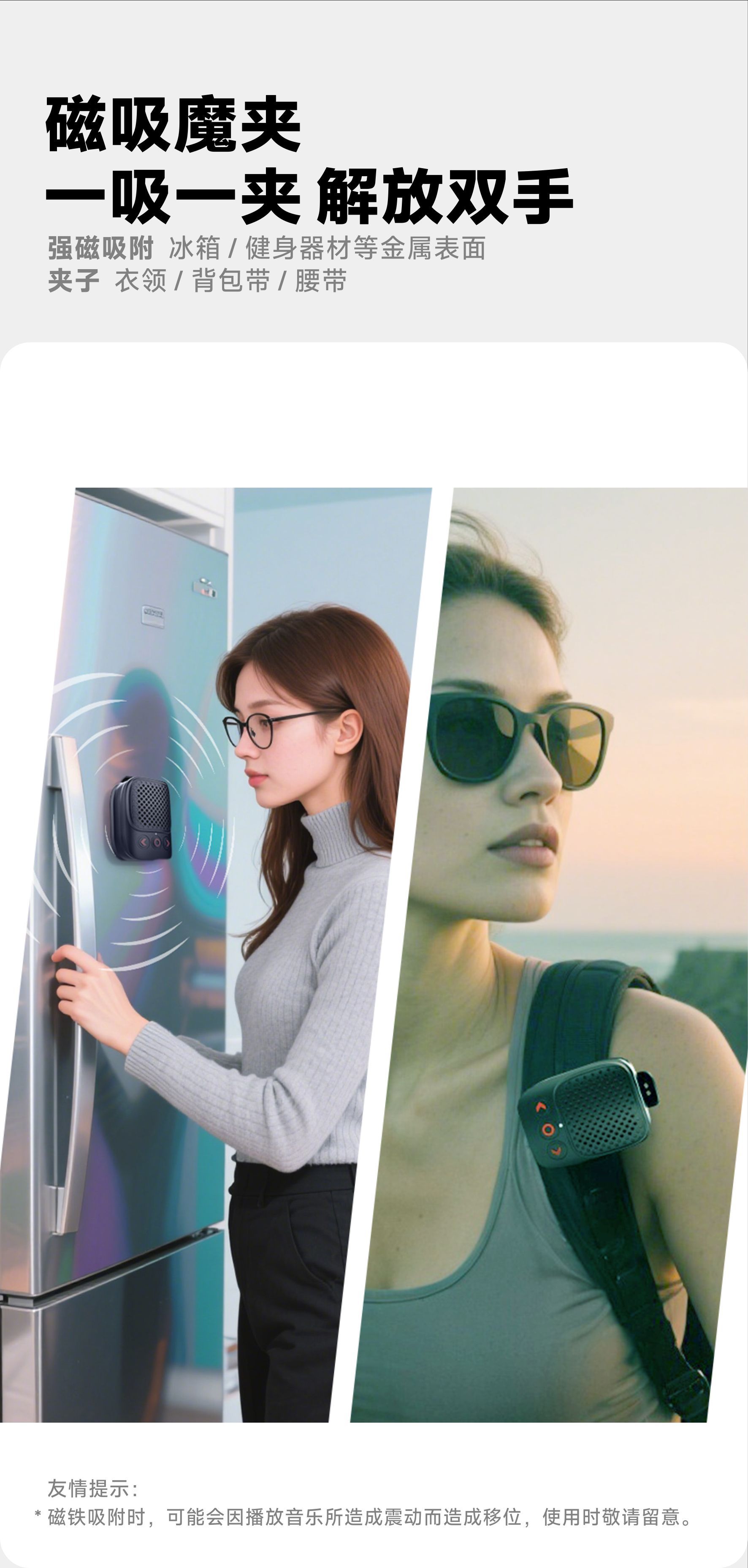 Its IPX5 waterproof rating makes it your ideal shower, poolside, or hiking companion. With a built-in magnetic base and wearable clip, you can attach it to your clothes, backpack, or metal surfaces — no pockets needed. Whether you're walking, cooking, or out in nature, enjoy music hands-free with built-in mic support for calls.