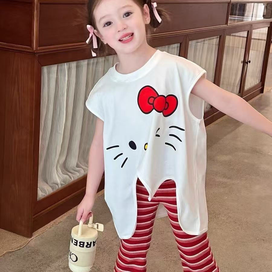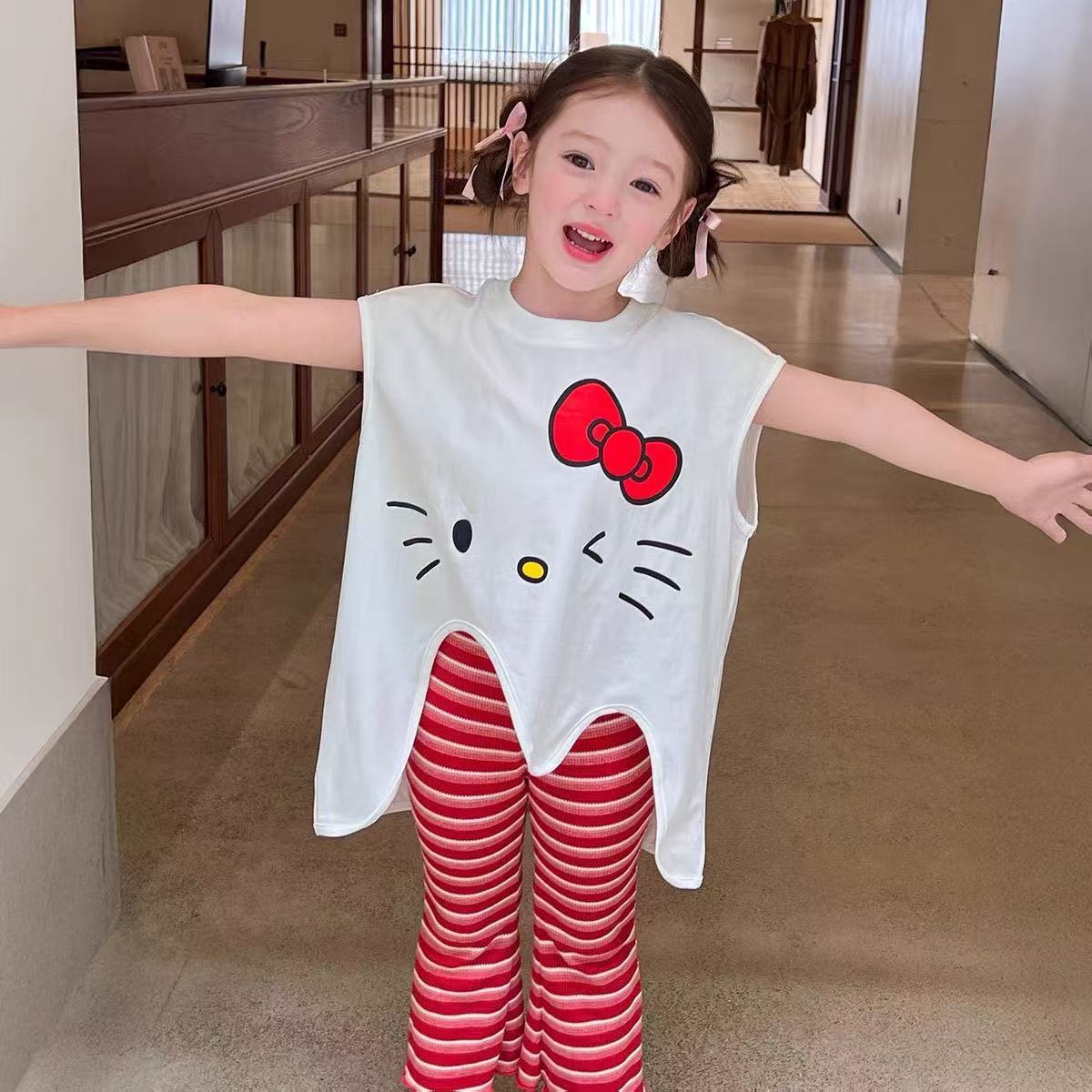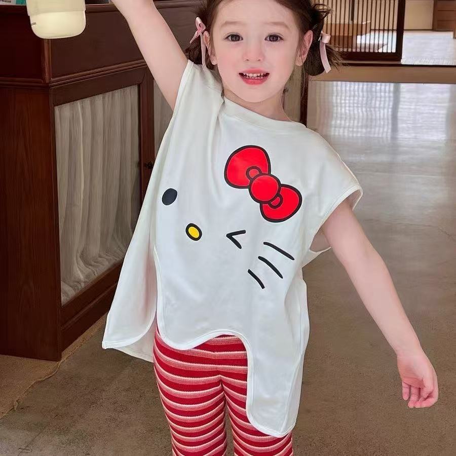 2025 새로운 여자 여름 정장 아기 불규칙한 느슨한 탑 스트라이프 바지 어린이 유행 투피스 세트