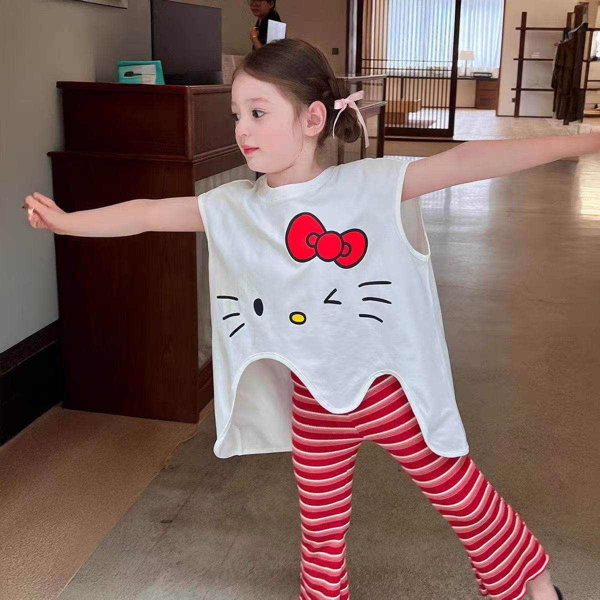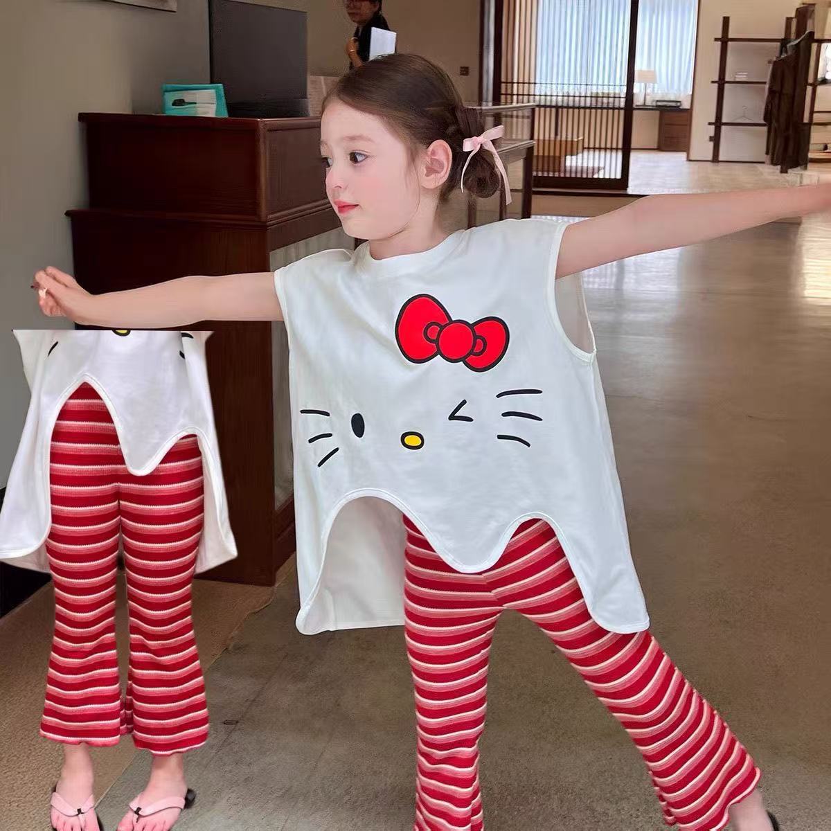 2025 새로운 여자 여름 정장 아기 불규칙한 느슨한 탑 스트라이프 바지 어린이 유행 투피스 세트스토어 가기