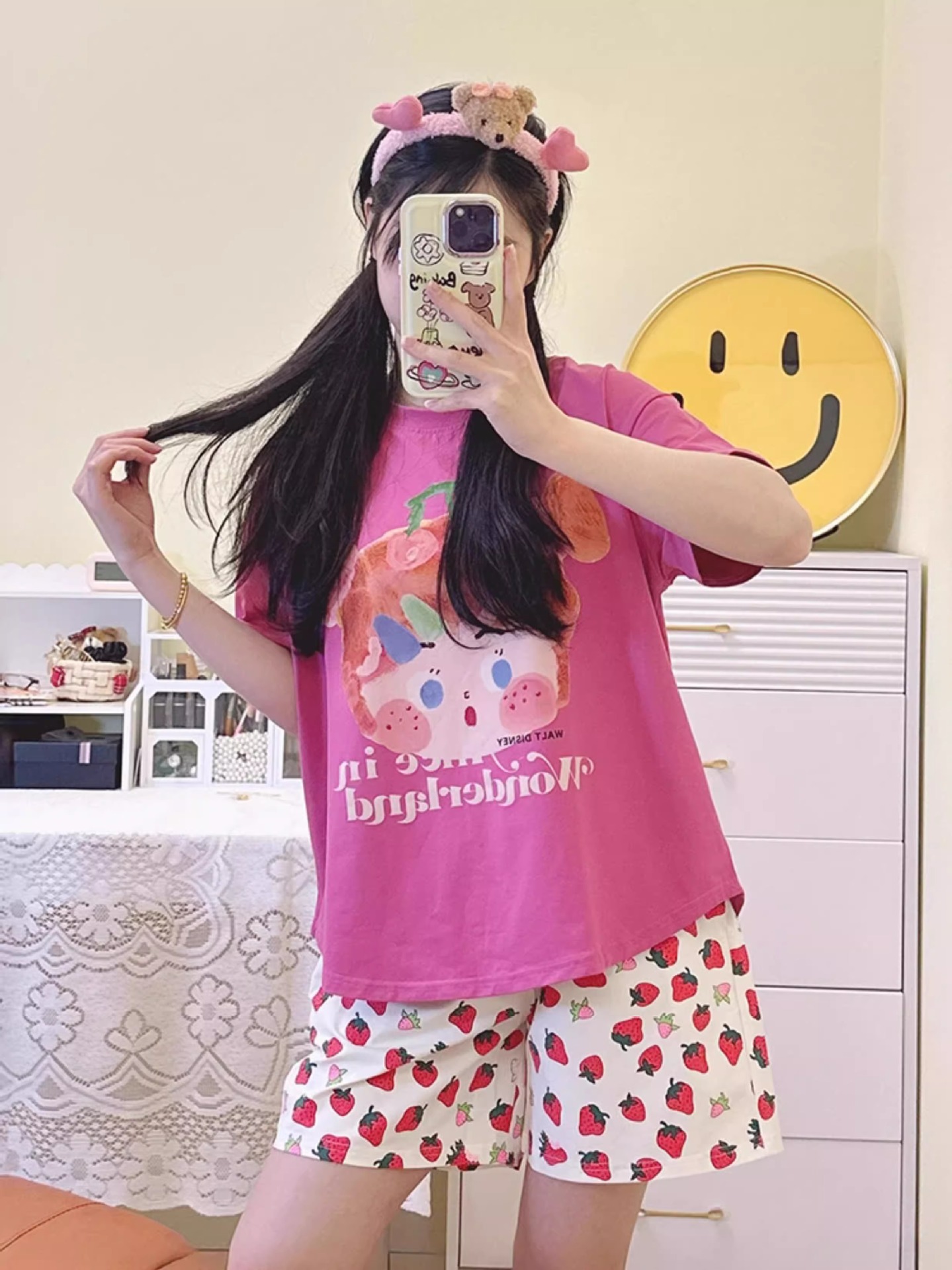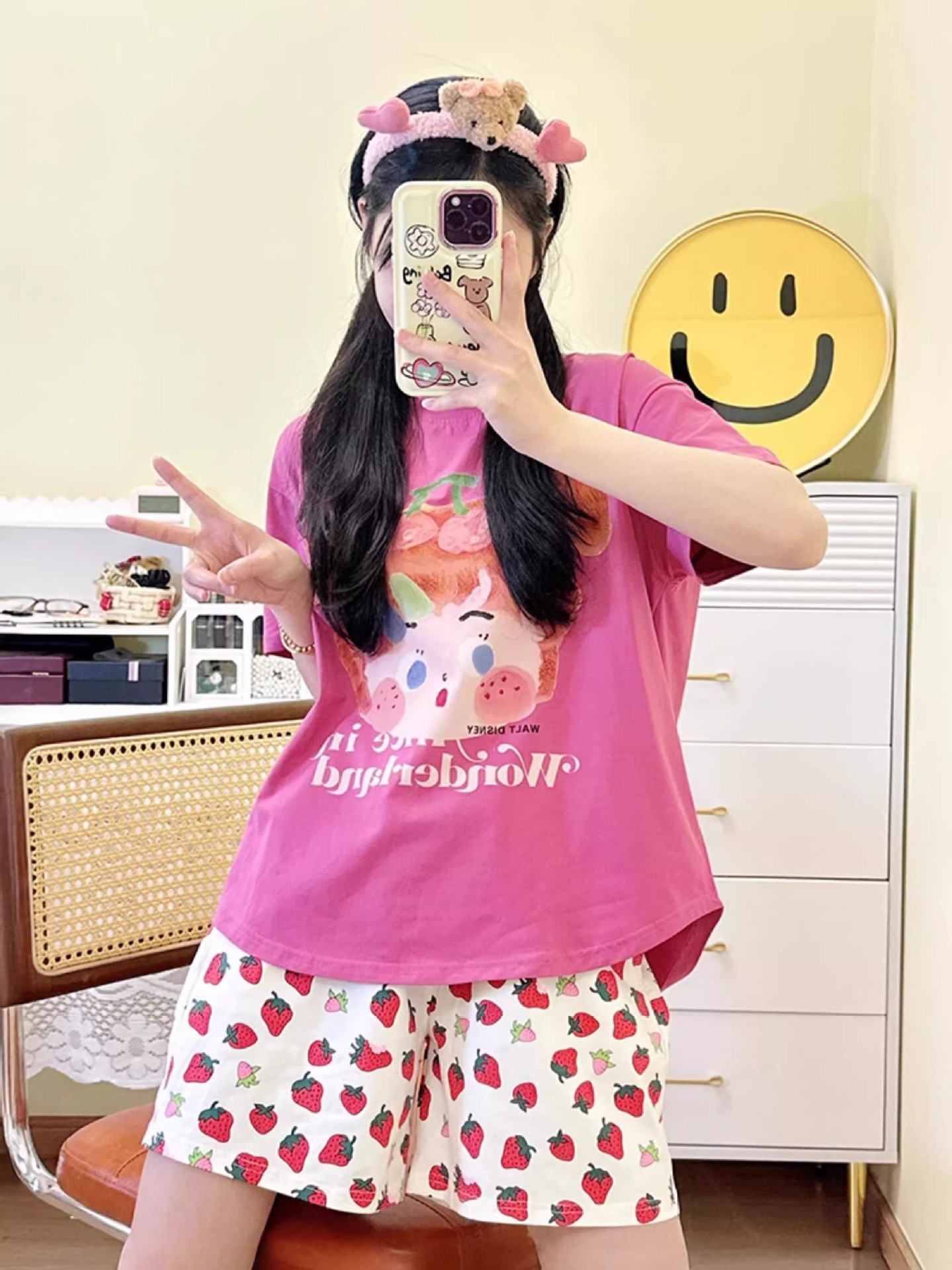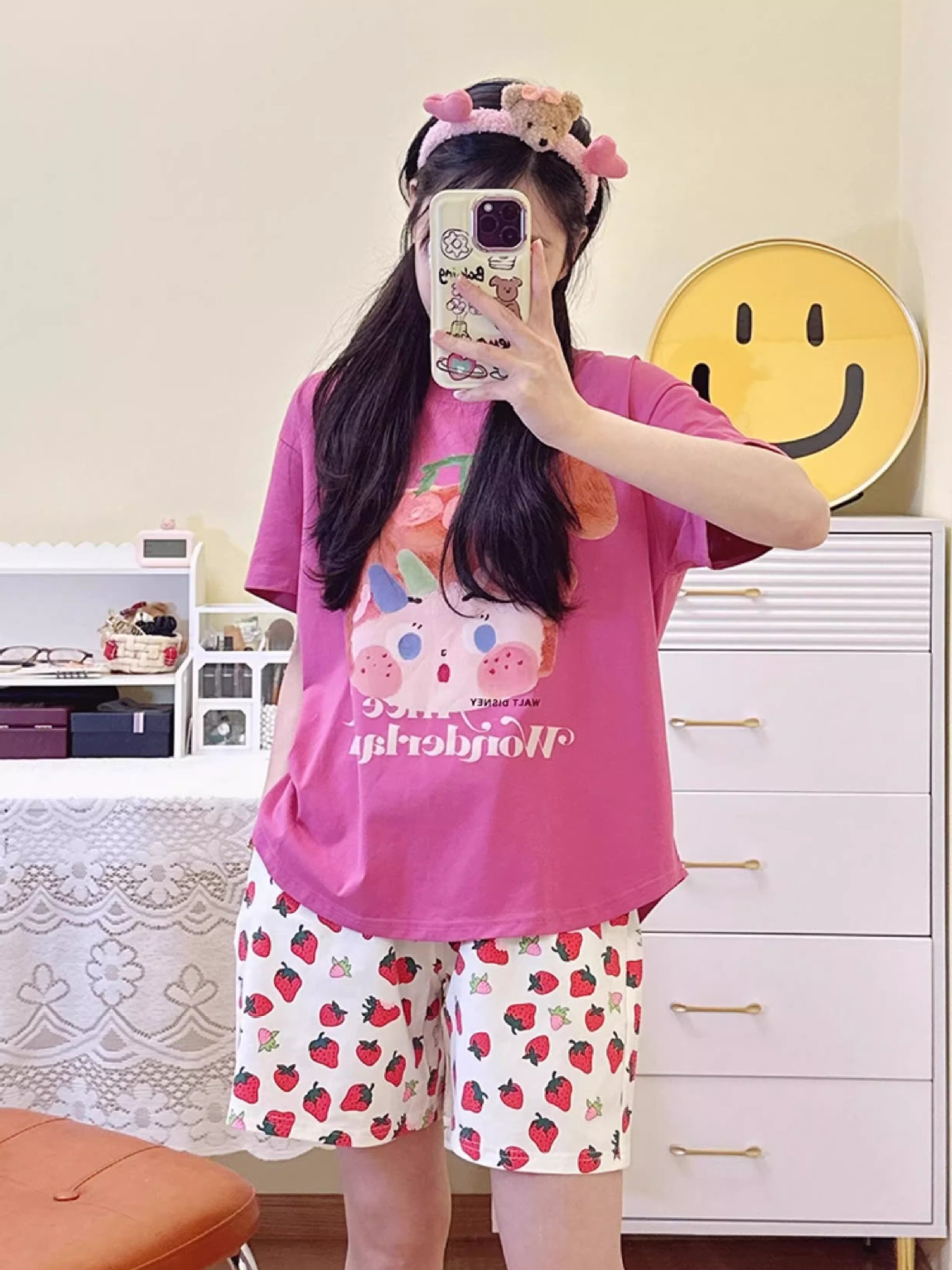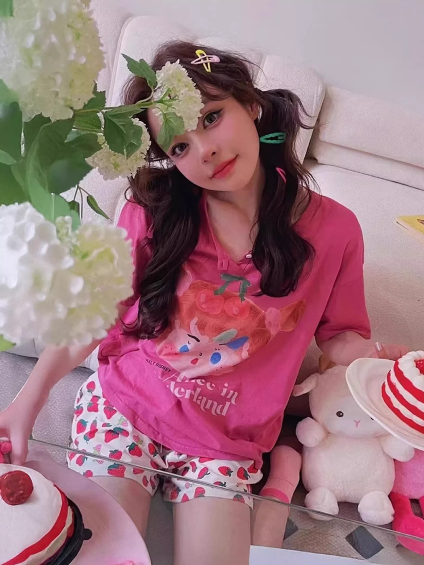 여자 잠옷 중학생 소녀 스타일 2025 새로운 여름 옷 여자 가정복 중대형 어린이 반팔 딸기 양복스토어 가기