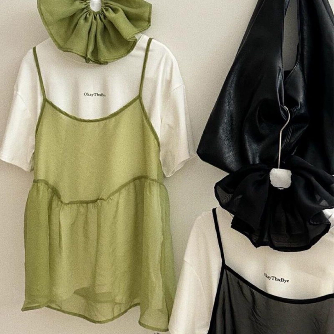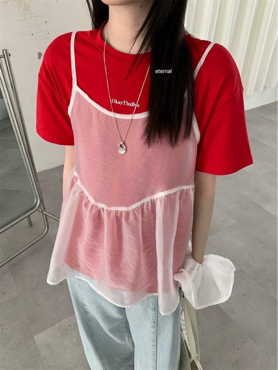 한국어 달콤한 레이어드 오간자 캐미솔 프린트 반팔 레이어드 캐미솔 캔디 컬러 조끼 여성용스토어 가기