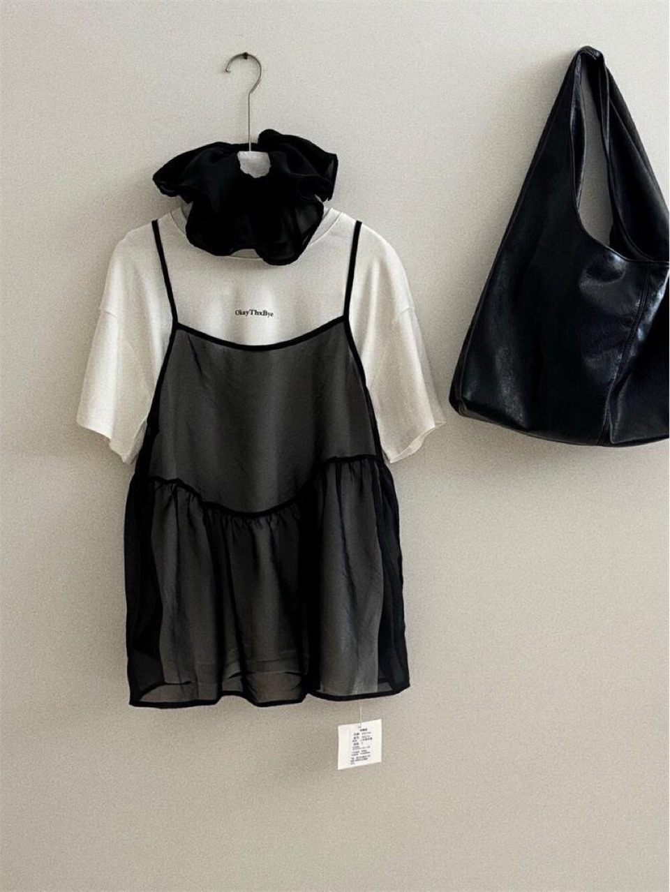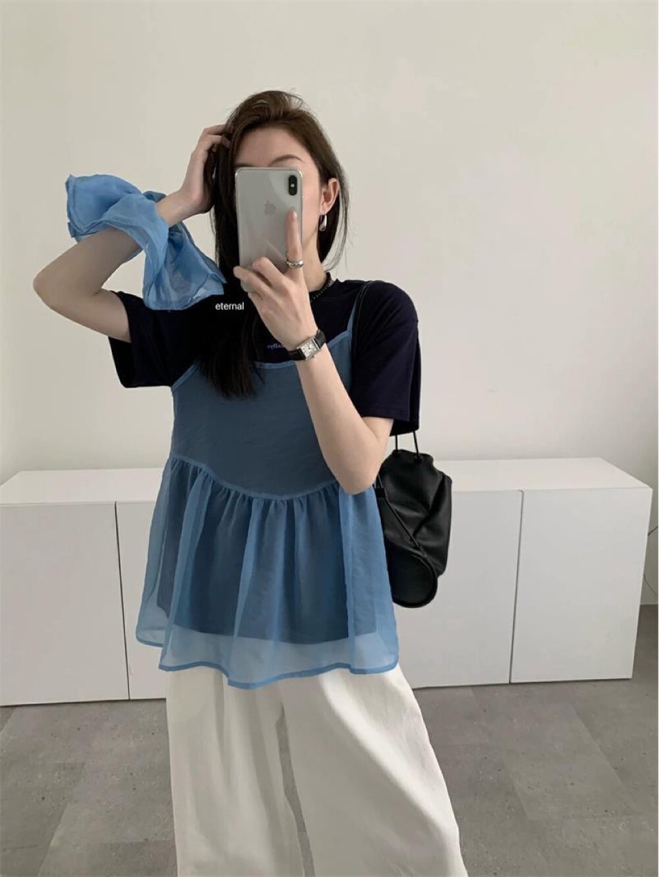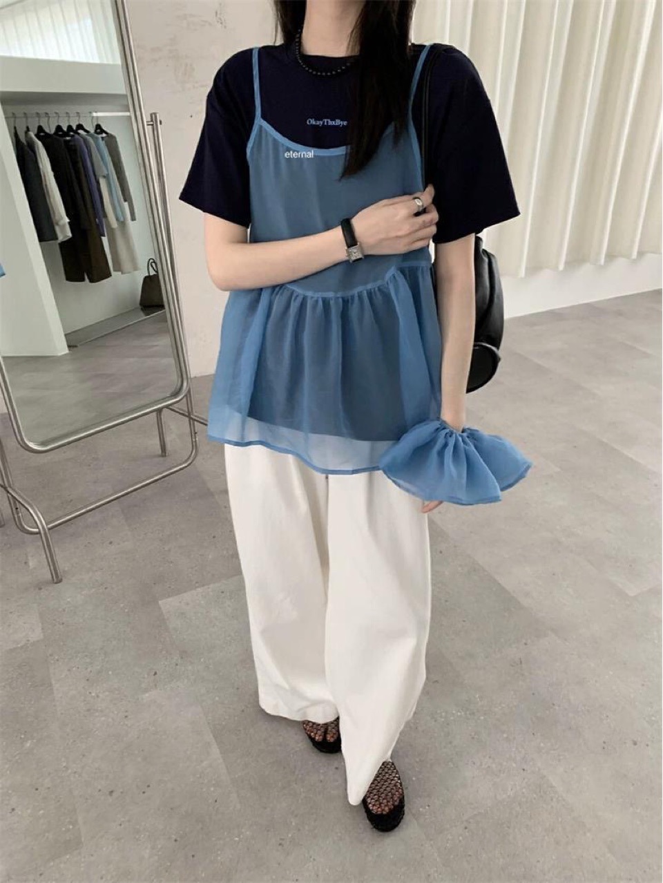 한국어 달콤한 레이어드 오간자 캐미솔 프린트 반팔 레이어드 캐미솔 캔디 컬러 조끼 여성용