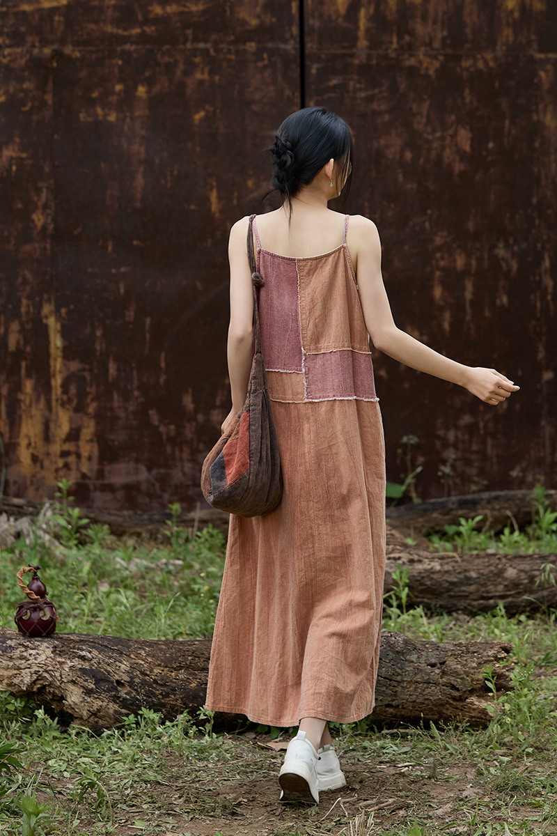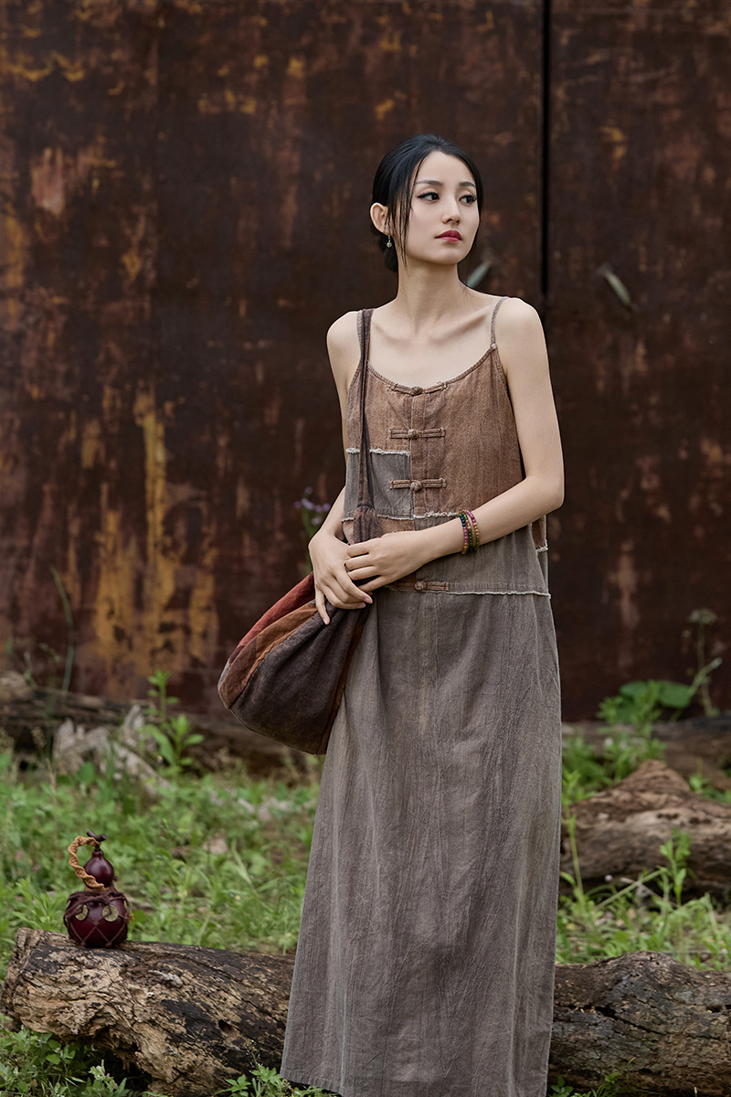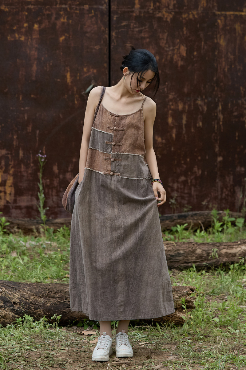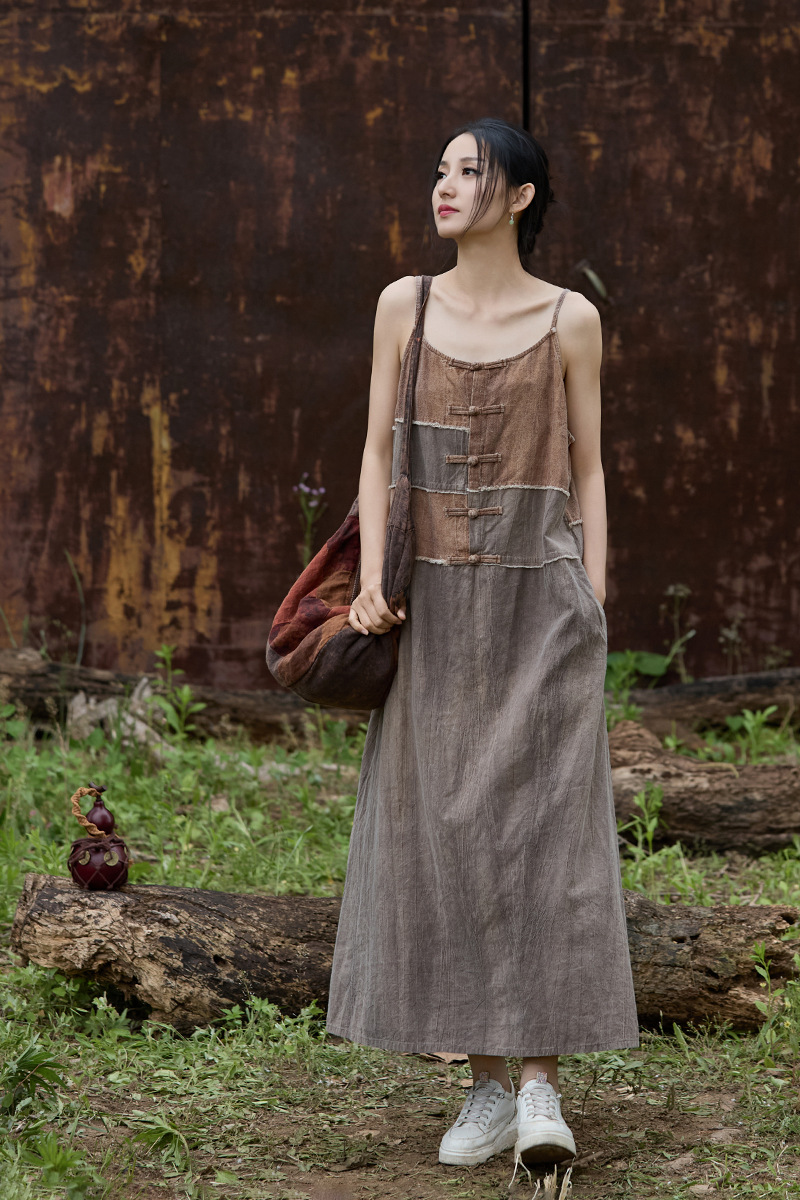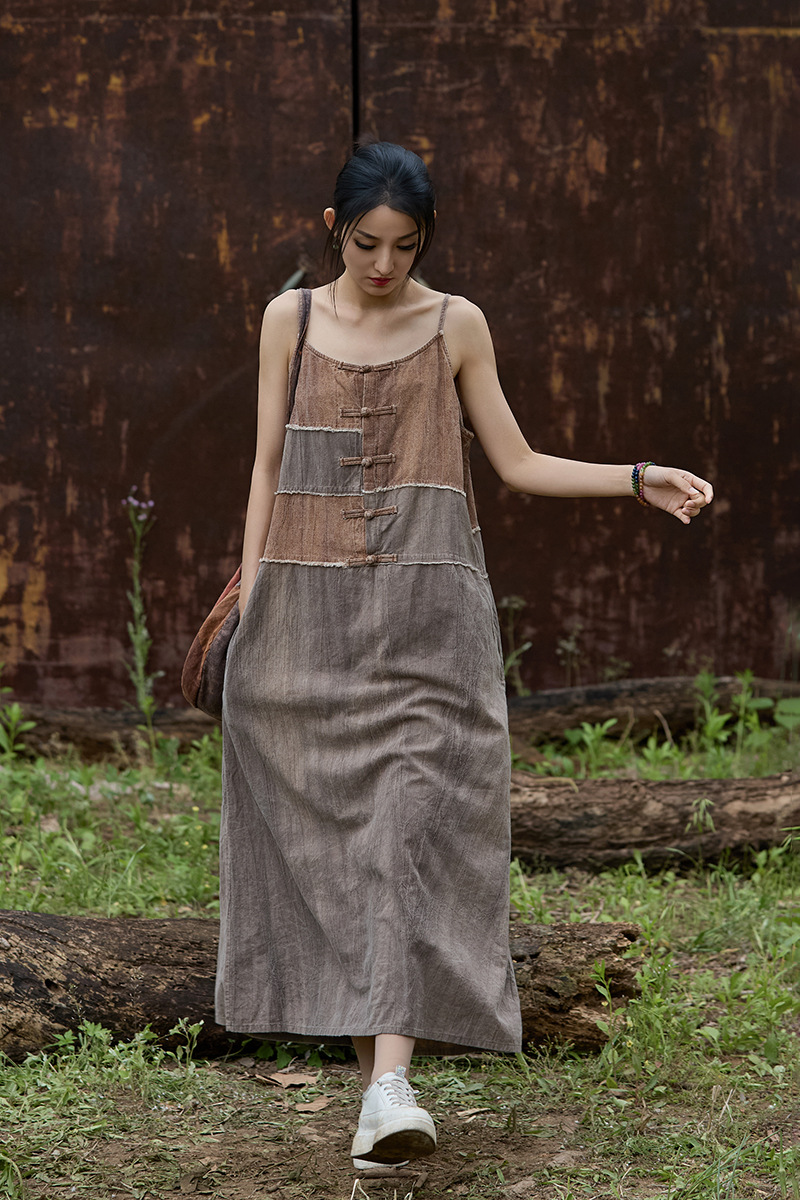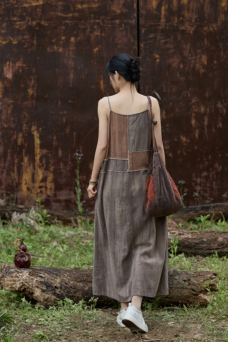 26 봄 여성복 린넨과 모시 소재의 패치워크 타이다이 롱 드레스, 오리지널 디자이너 스타일, 풍성하고 시원한 여성용 멜빵 원피스
