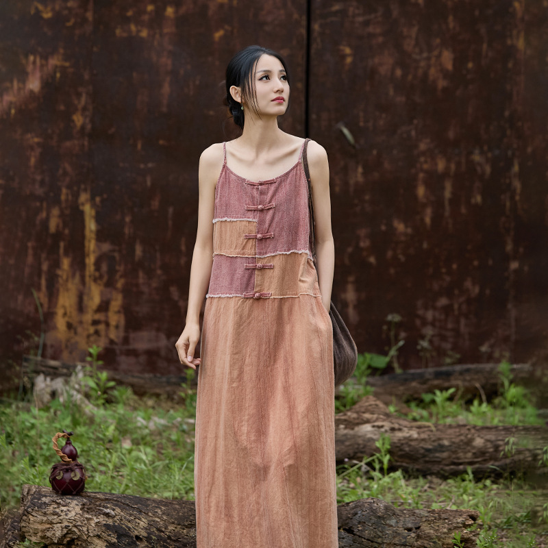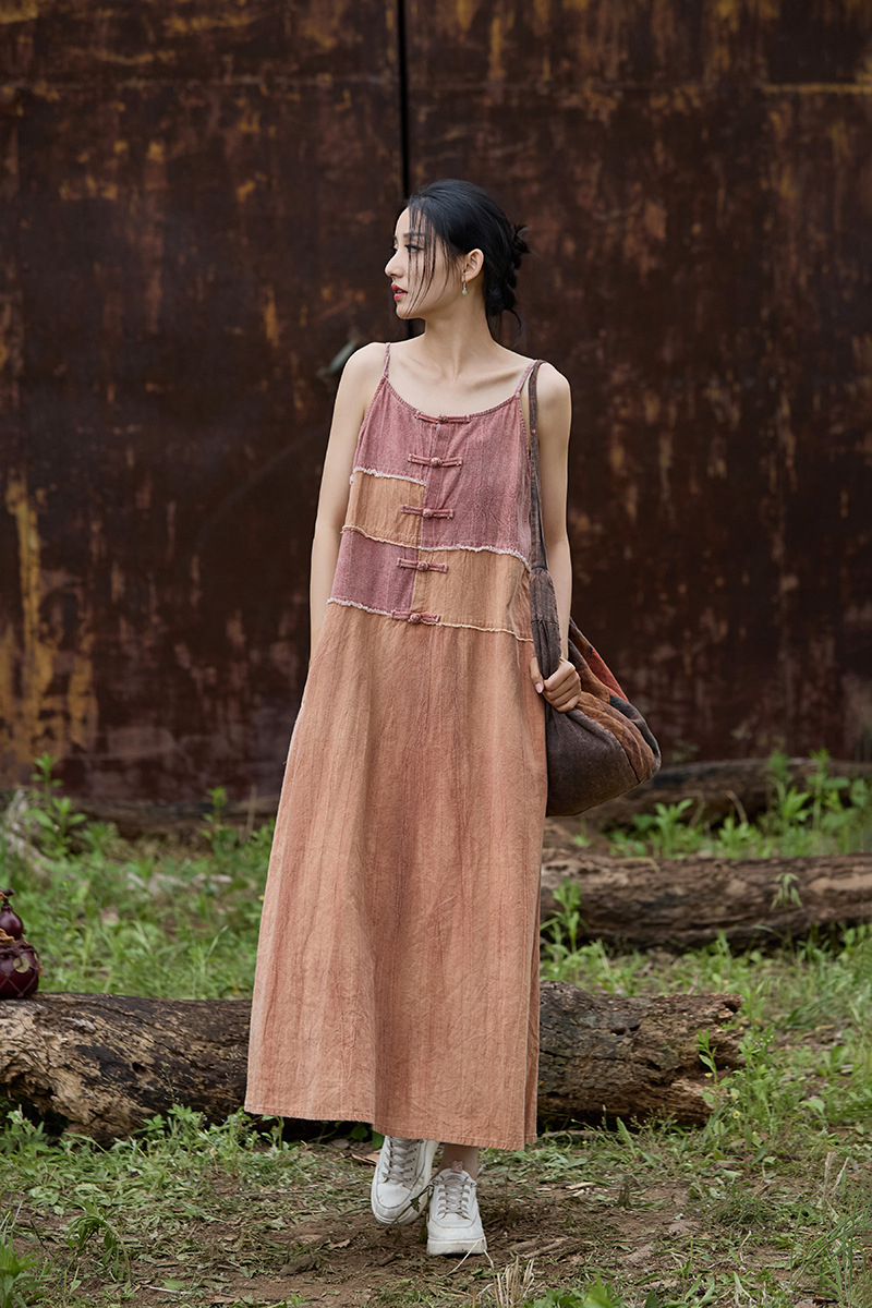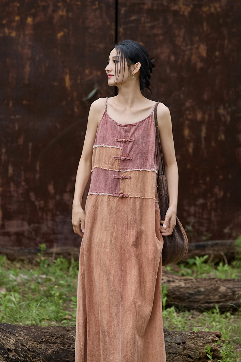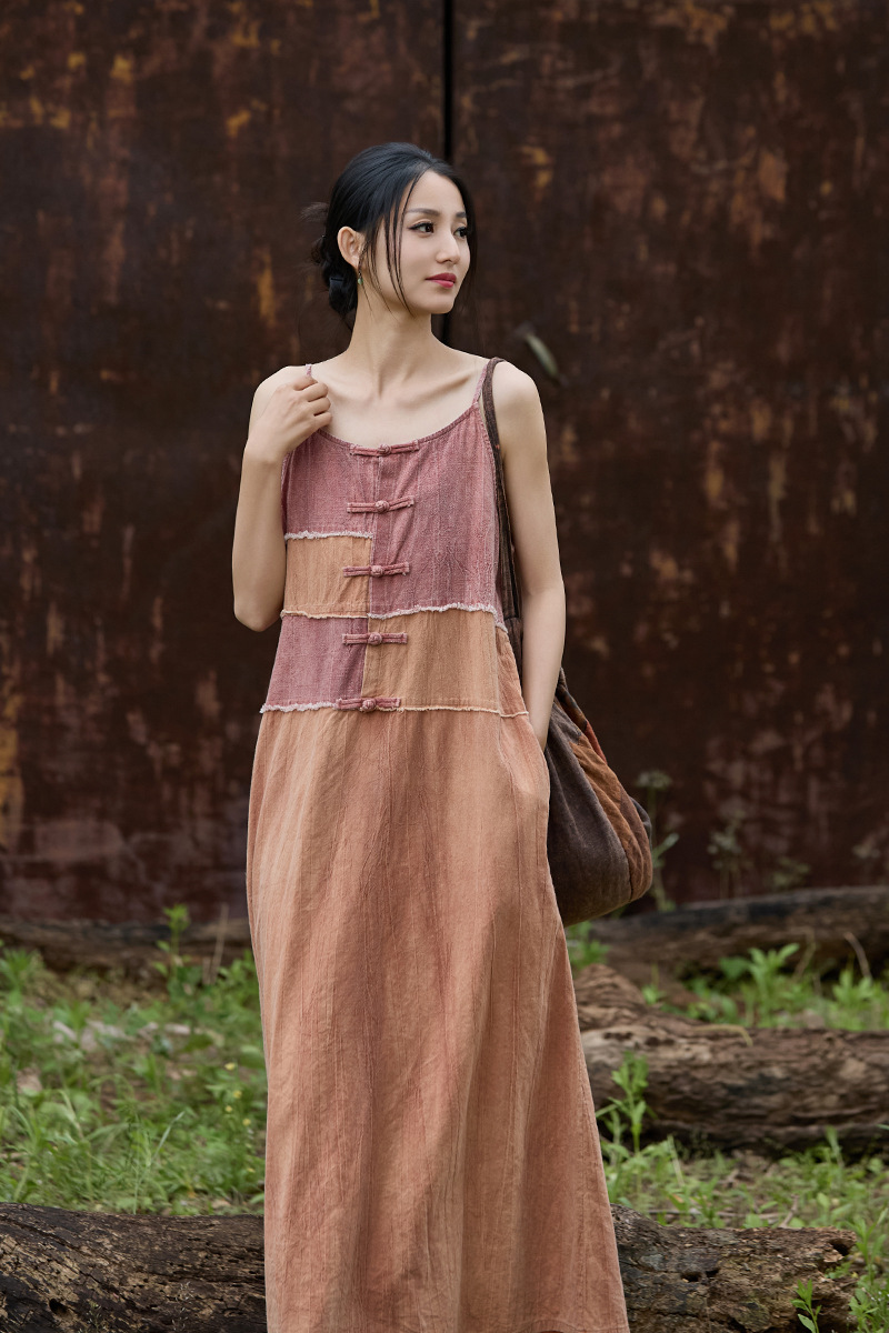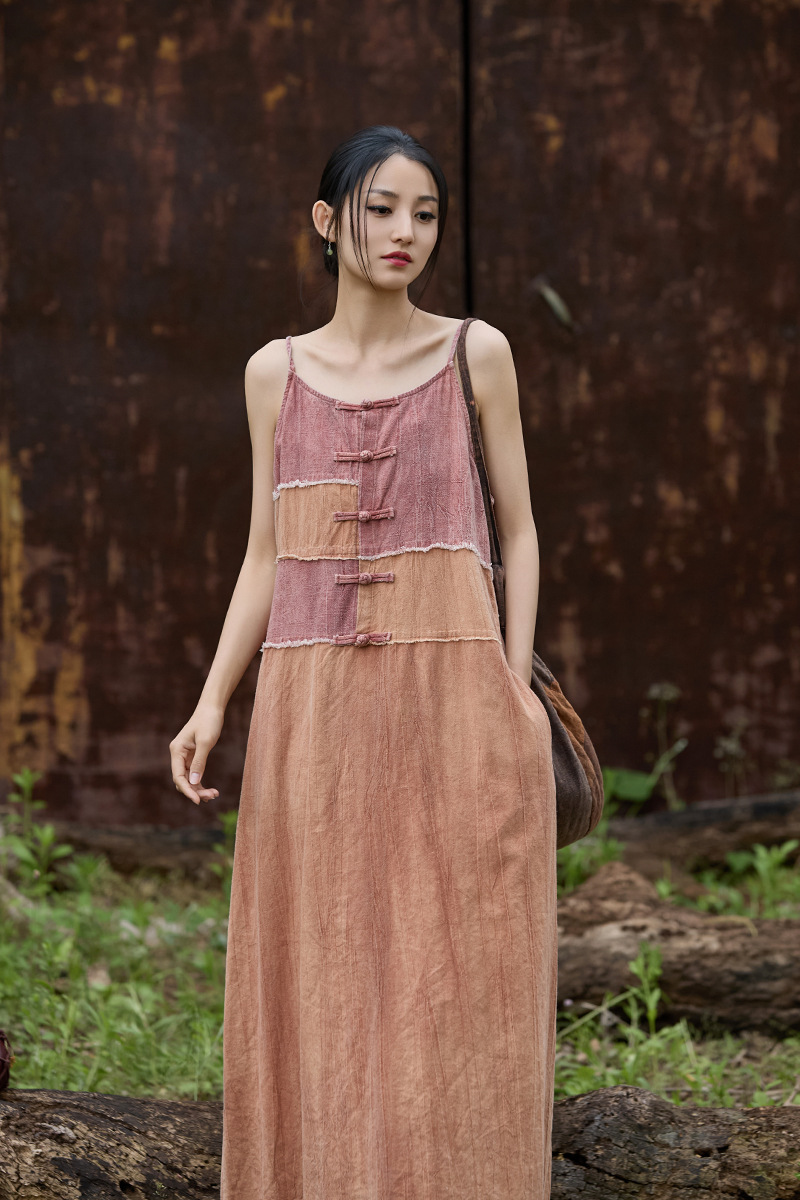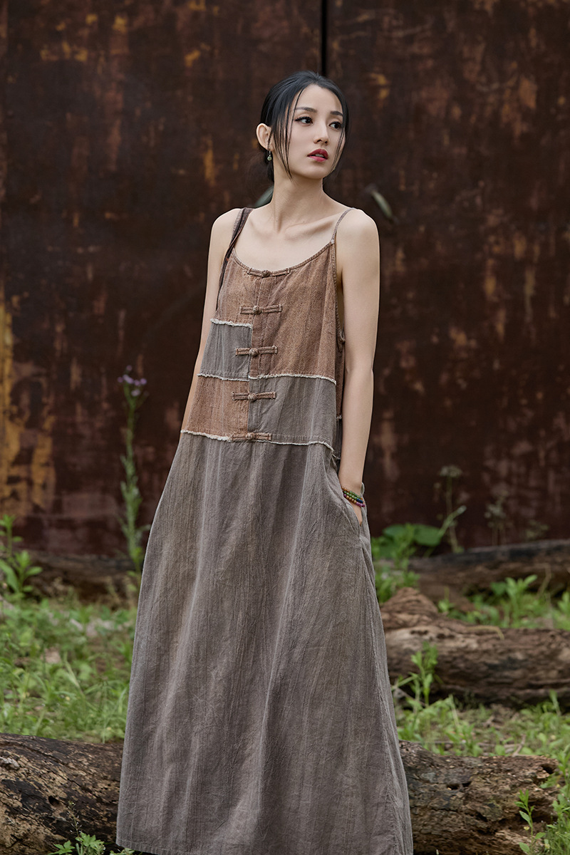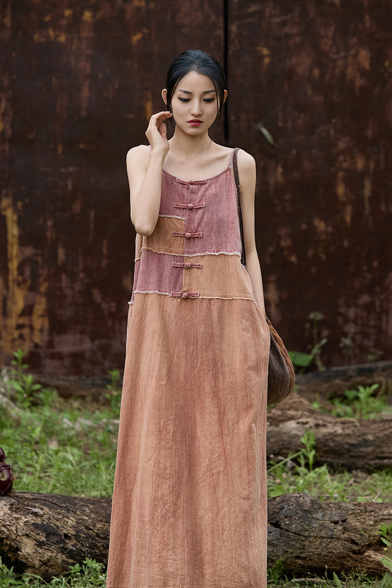 26 봄 여성복 린넨과 모시 소재의 패치워크 타이다이 롱 드레스, 오리지널 디자이너 스타일, 풍성하고 시원한 여성용 멜빵 원피스